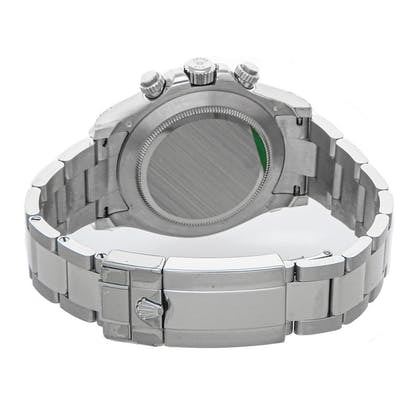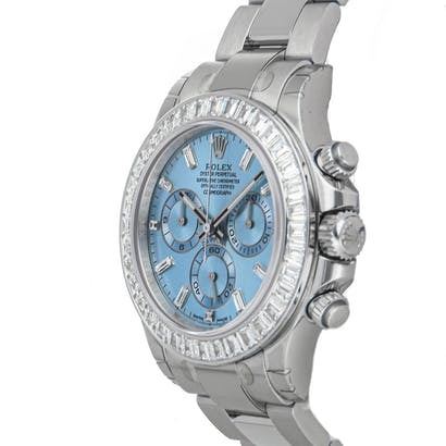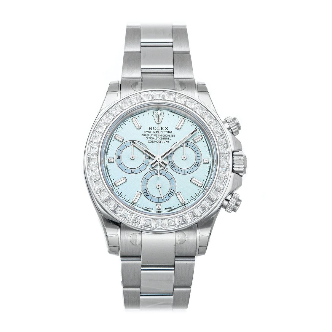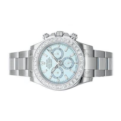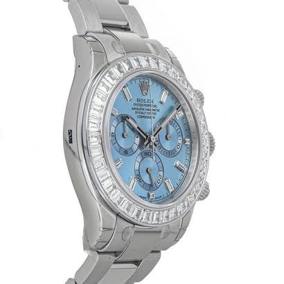 Pre-Owned Rolex Daytona (116576TBR) self-winding automatic watch, features a 40mm platinum case with a baguette diamond bezel surrounding a blue baguette diamond dial on a platinum Oyster bracelet with folding buckle.