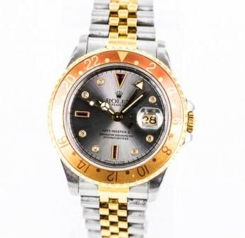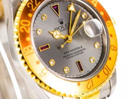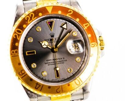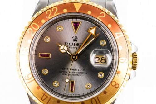 Model: Mens 16713 Gmt Master II 18K Stainless Steel Root Beer Serti Diamond Ruby Dial