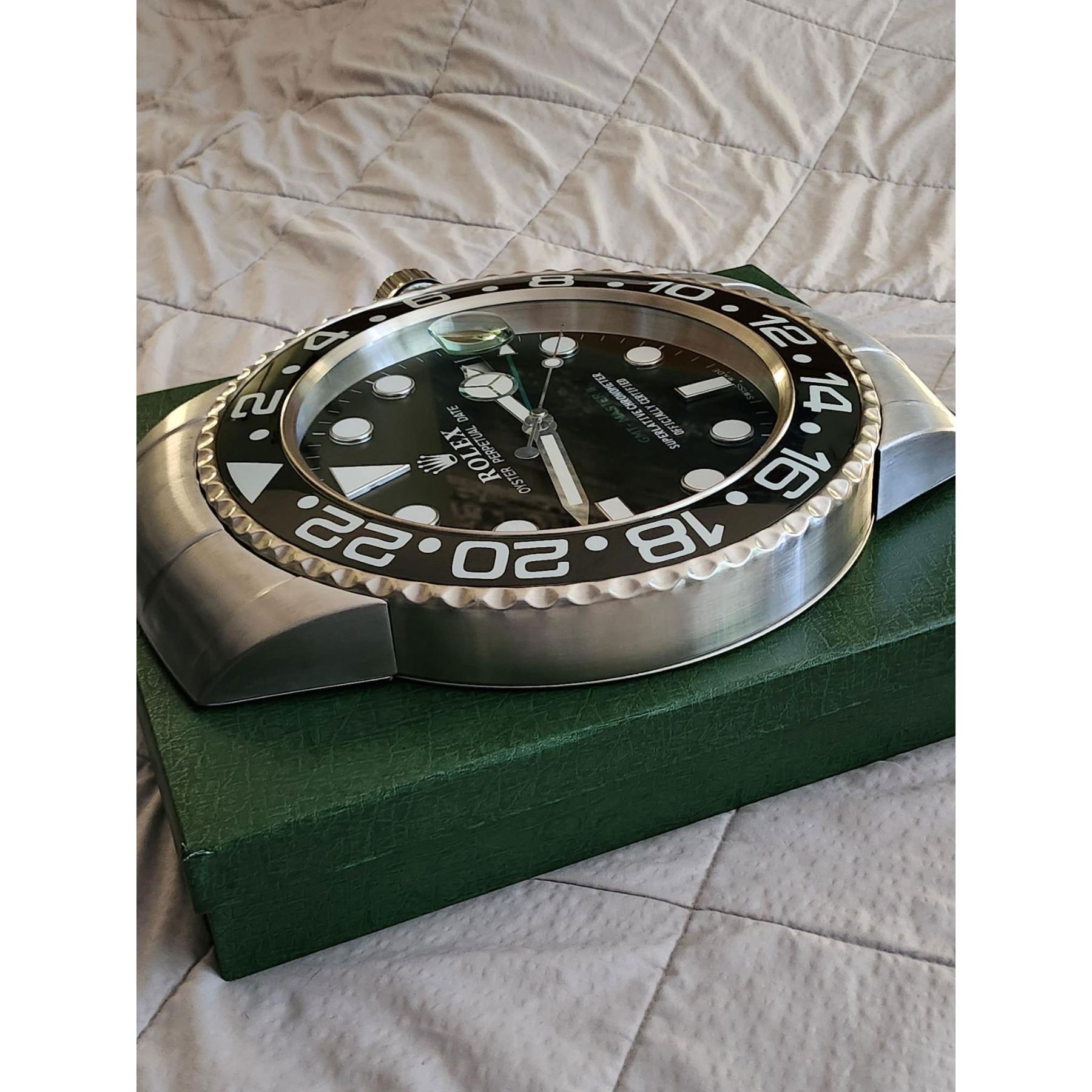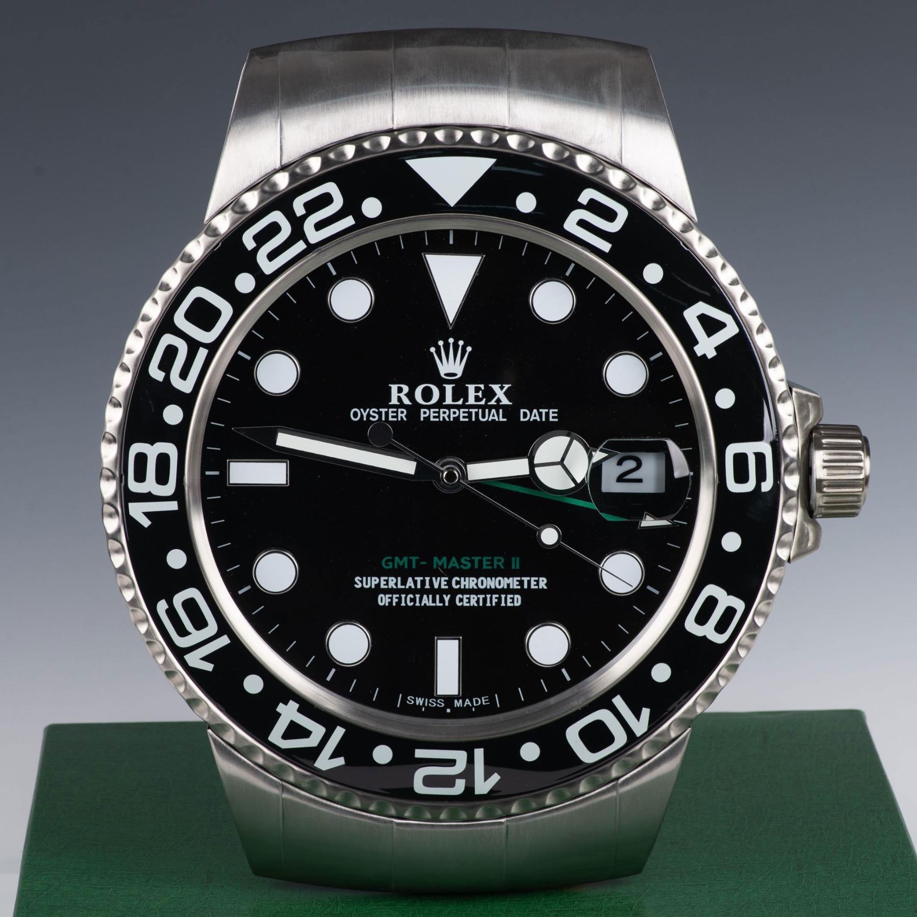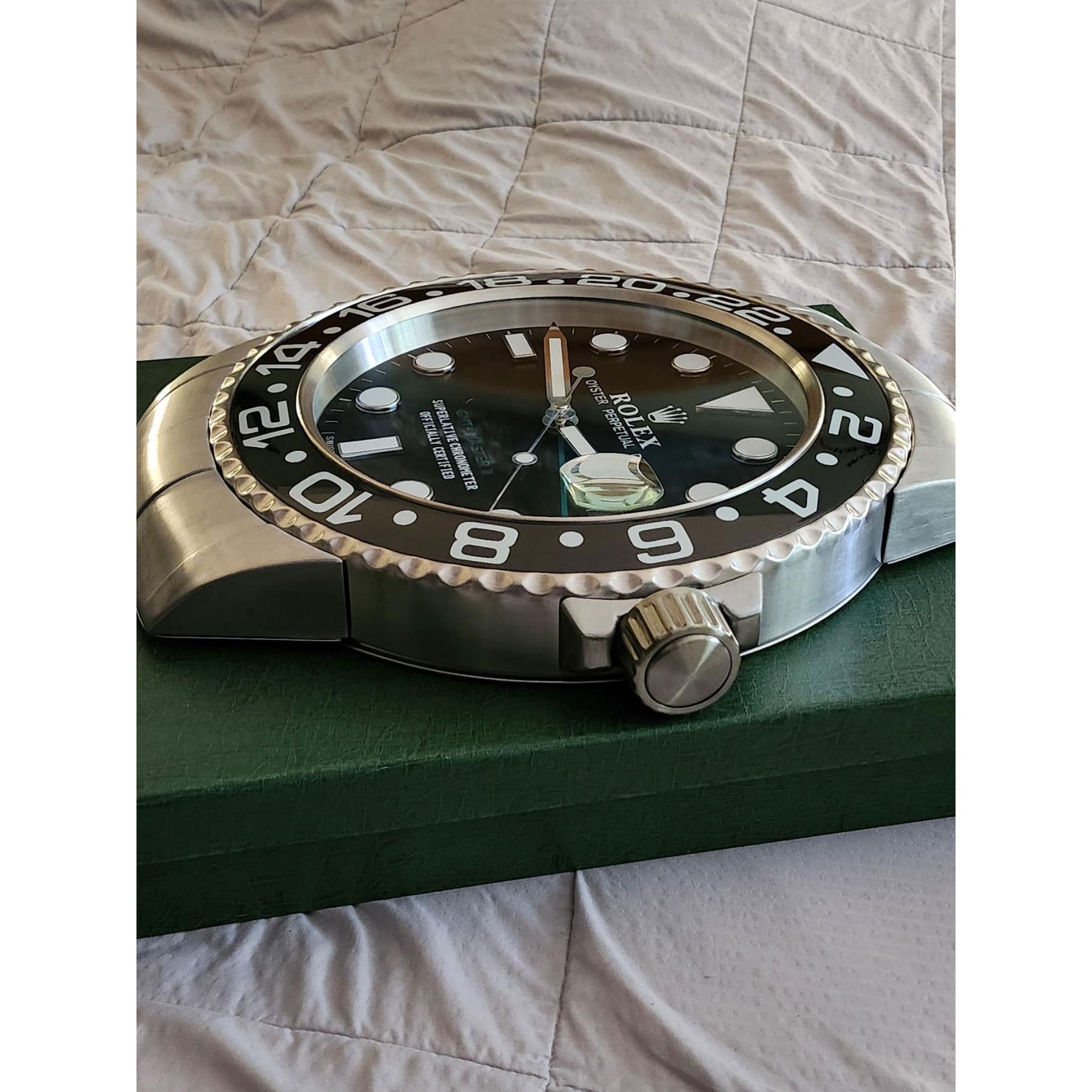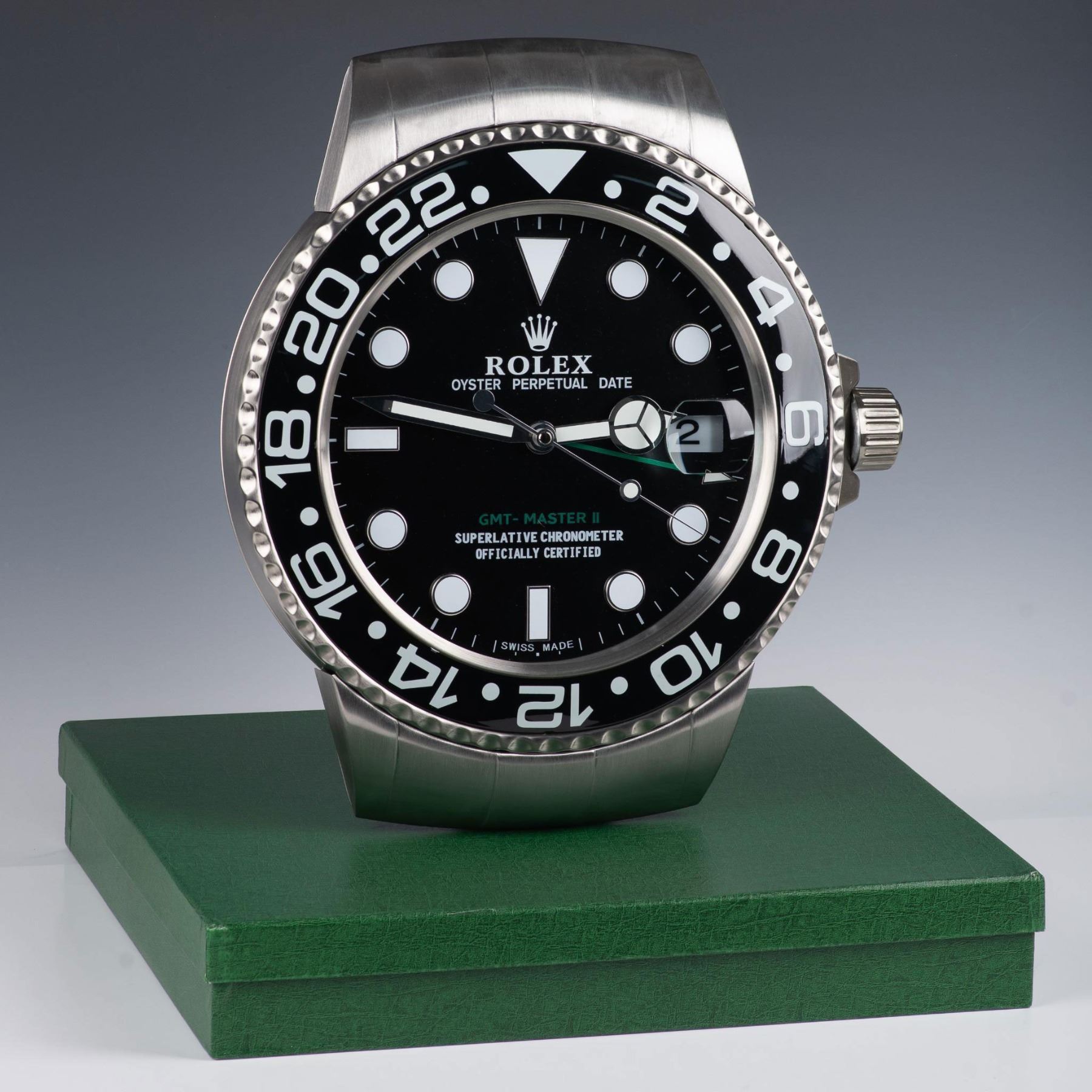 Rolex GMT Master II with black bezel, black face, and luminous dial. The clock features sweeping Quartz movement powered by a single AA battery. It comes with its original box, which measures 17.75"L x 15.5"W x 3"H. Dimensions: 17"L x 14.5"W