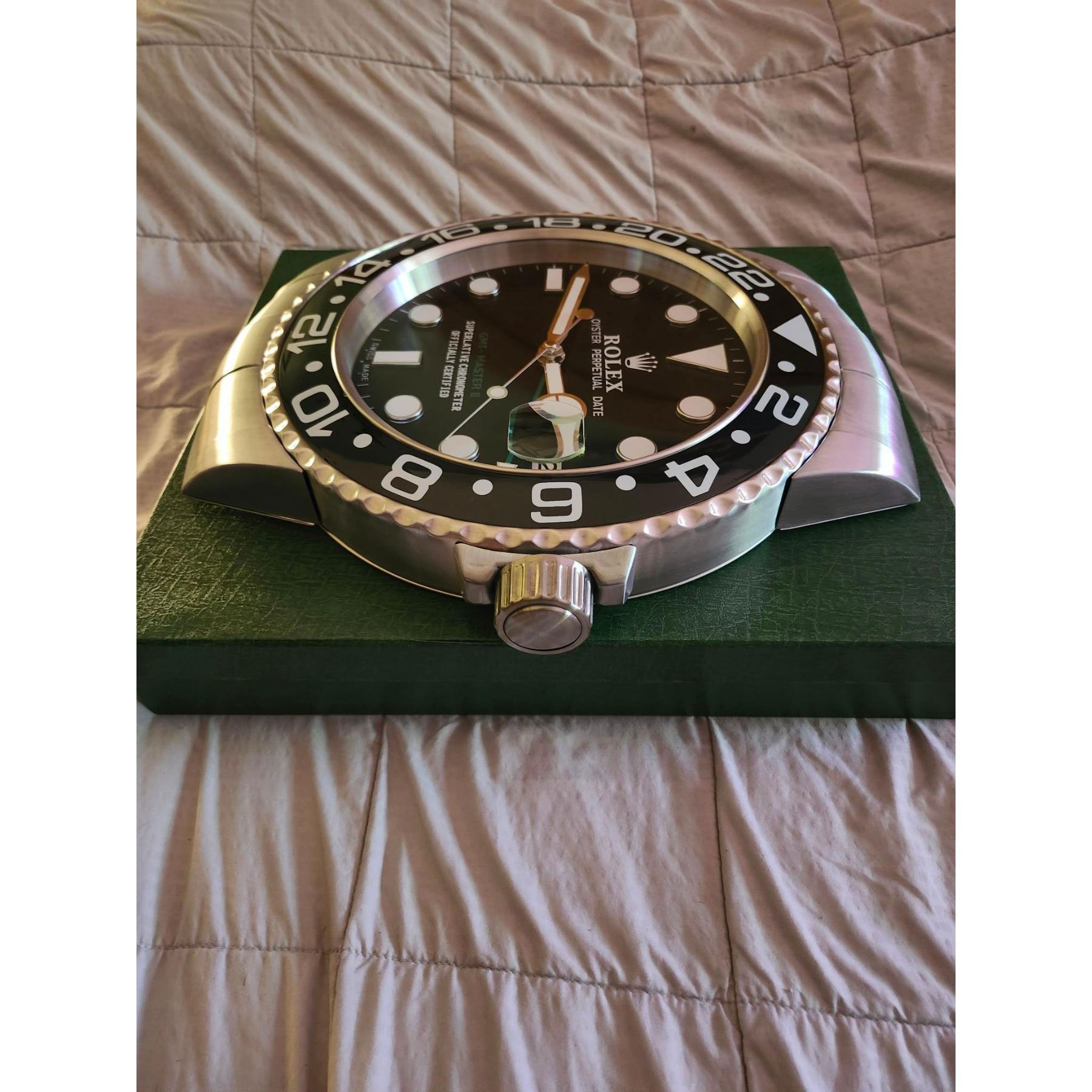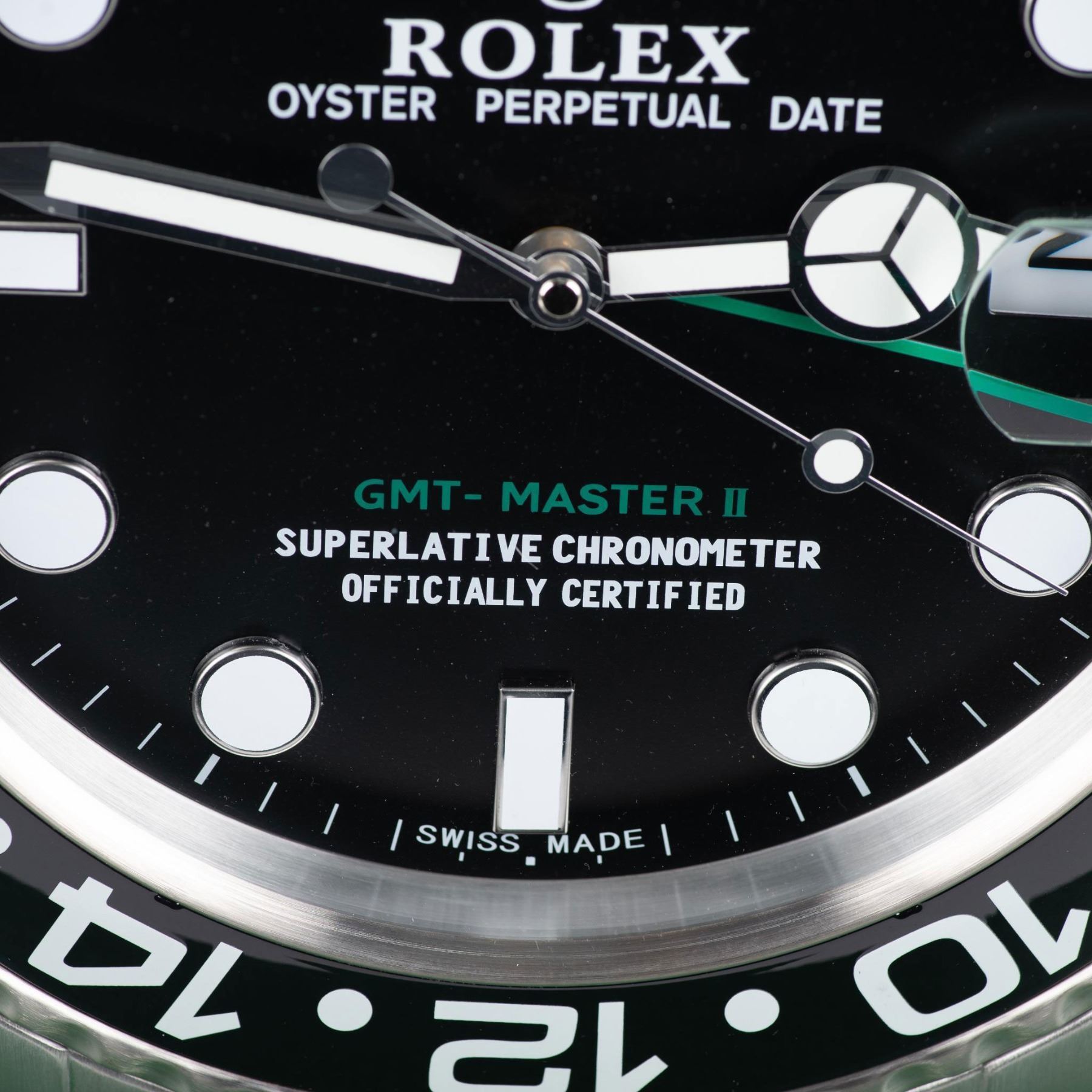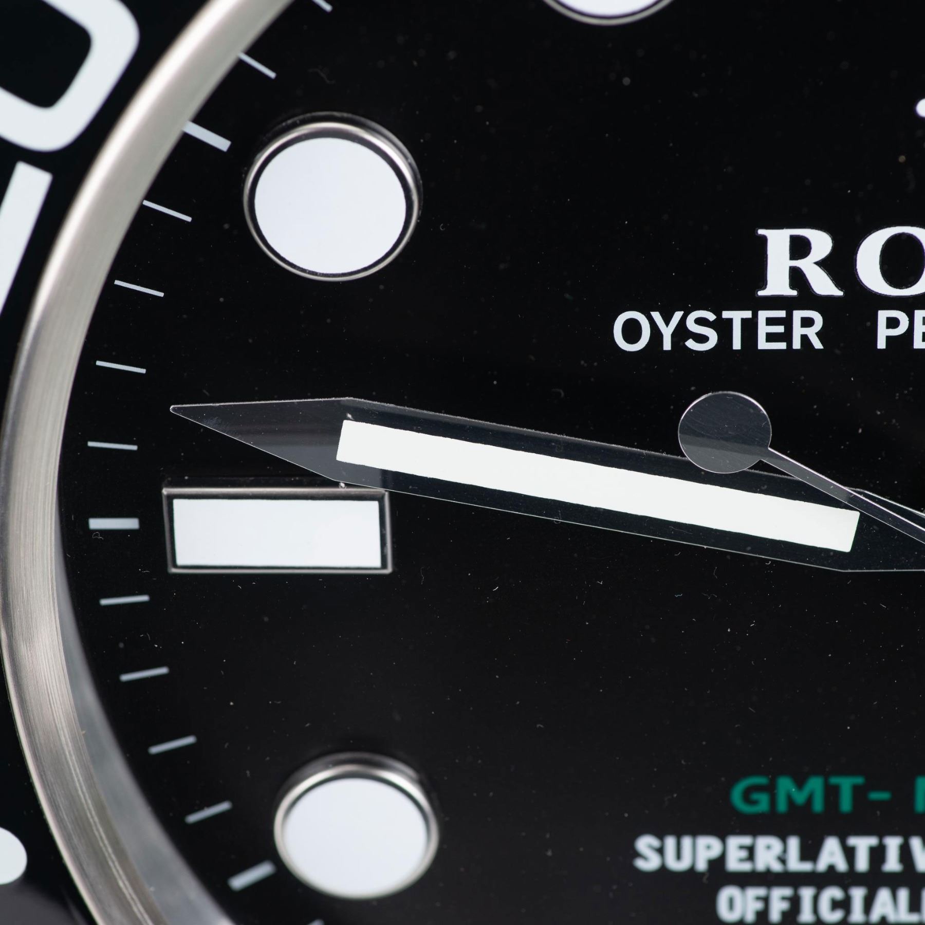 Rolex GMT Master II with black bezel, black face, and luminous dial. The clock features sweeping Quartz movement powered by a single AA battery. It comes with its original box, which measures 17.75"L x 15.5"W x 3"H. Dimensions: 17"L x 14.5"W