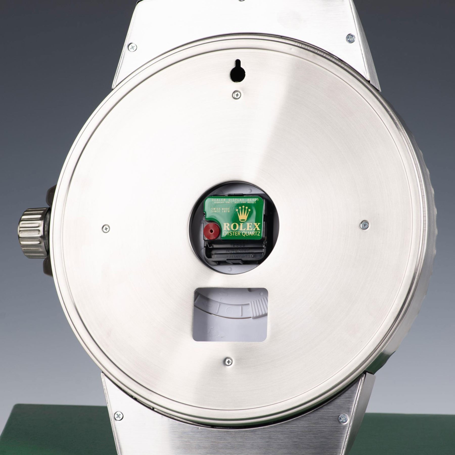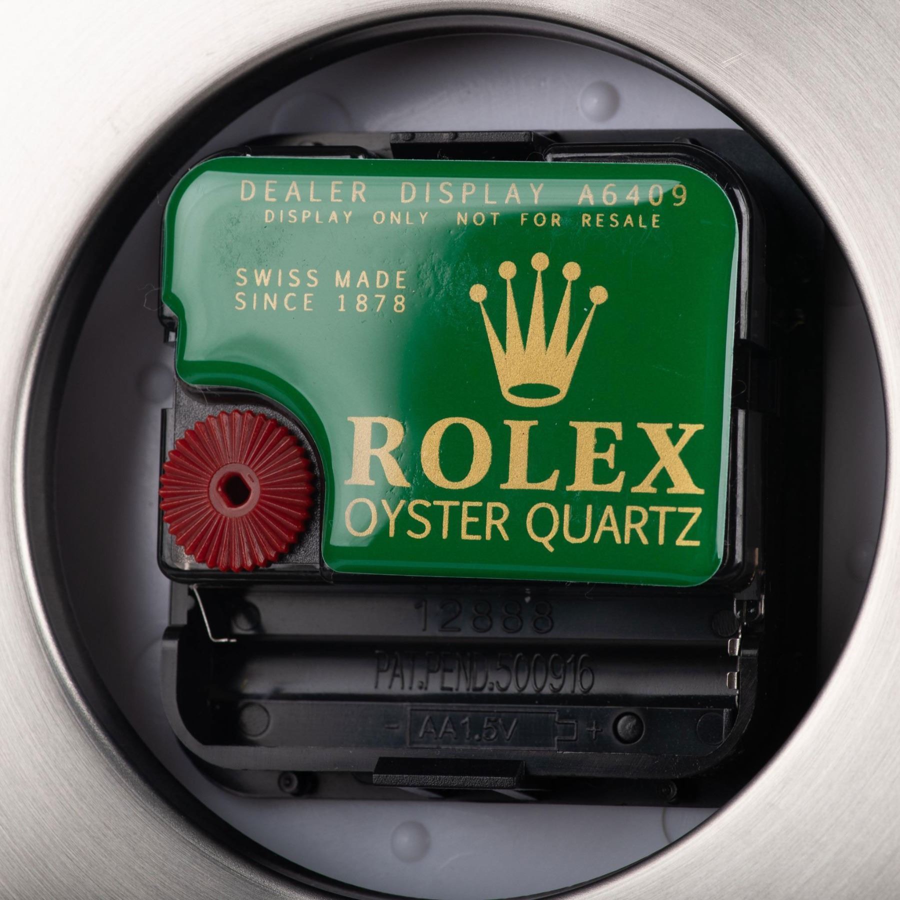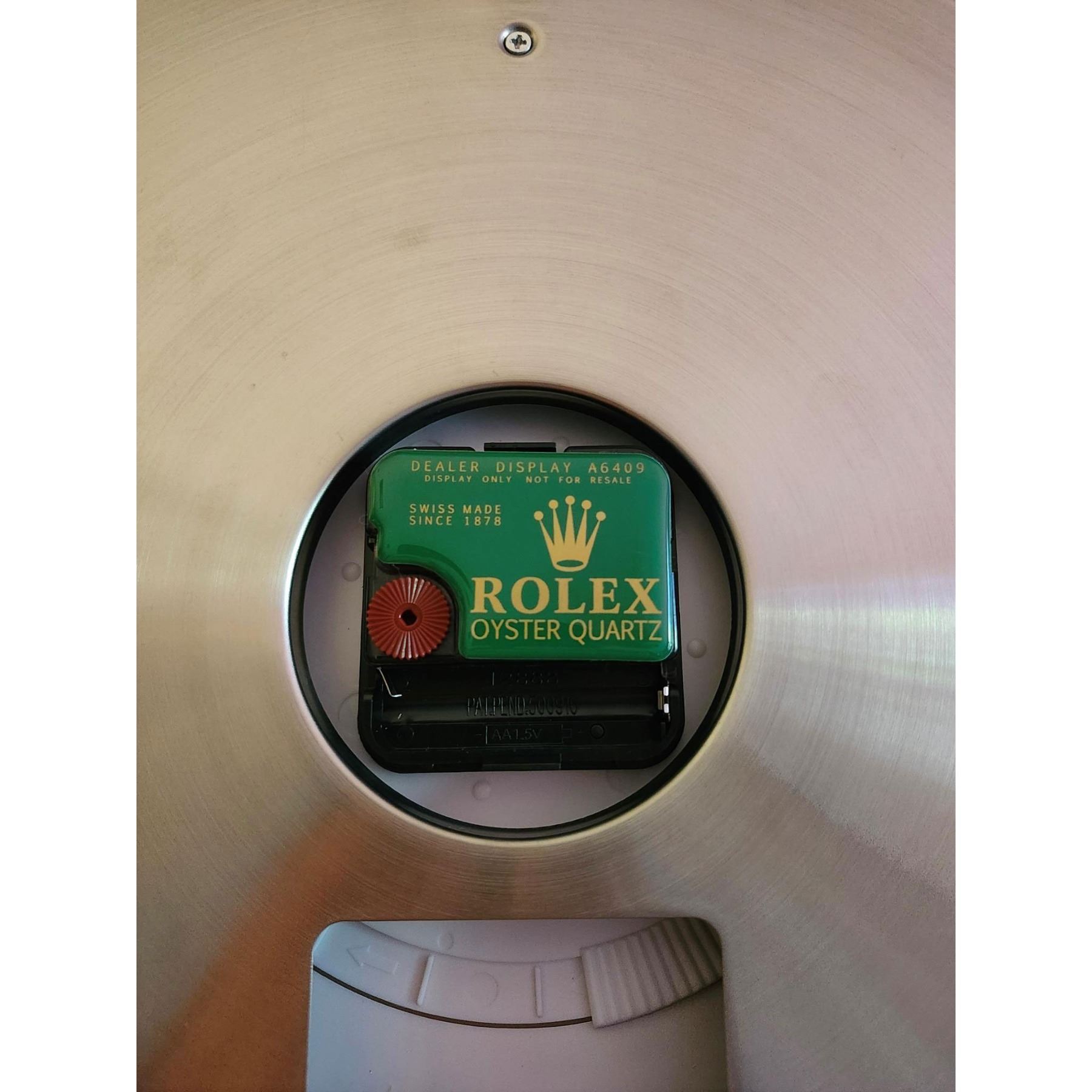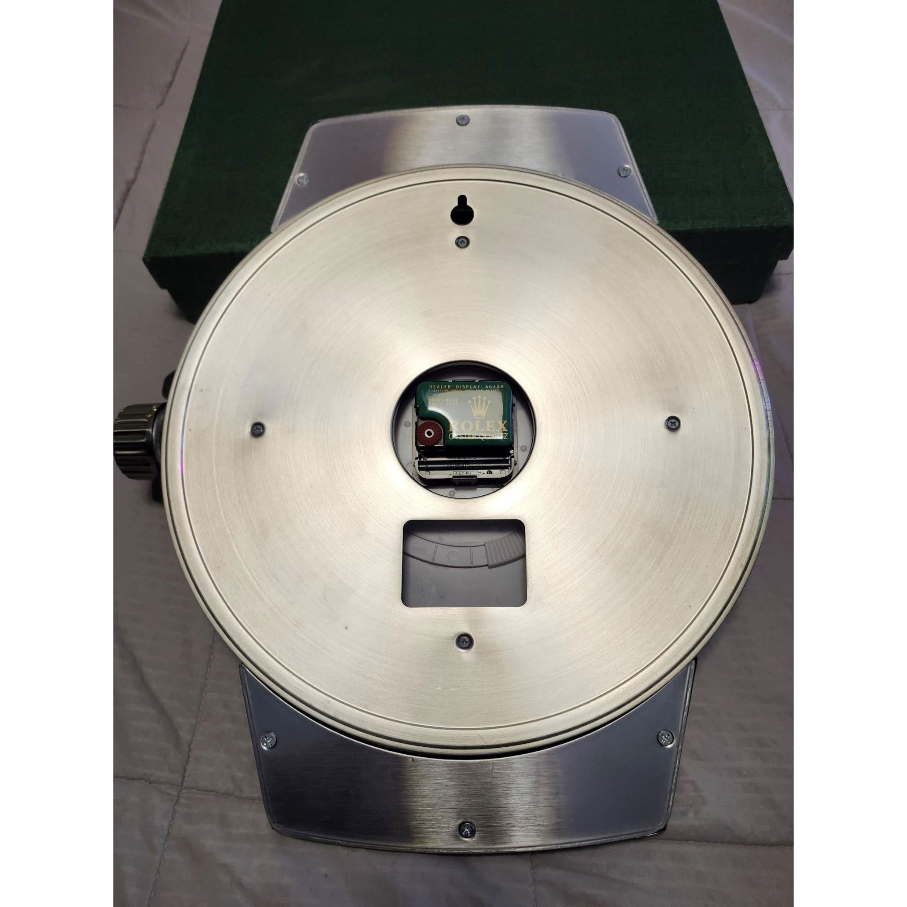 Rolex GMT Master II with black bezel, black face, and luminous dial. The clock features sweeping Quartz movement powered by a single AA battery. It comes with its original box, which measures 17.75"L x 15.5"W x 3"H. Dimensions: 17"L x 14.5"W