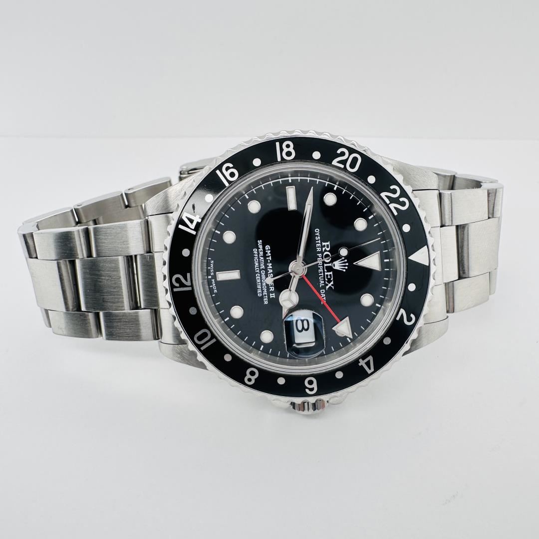 This Rolex GMT-Master II is crafted in stainless steel with a classic Oyster bracelet. The black dial features luminous hour markers, a date display at 3 o'clock, and the signature red GMT hand, all framed by a black 24-hour rotating bezel. A professional-grade tool watch with iconic style, it offers both functionality and timeless Rolex appeal.