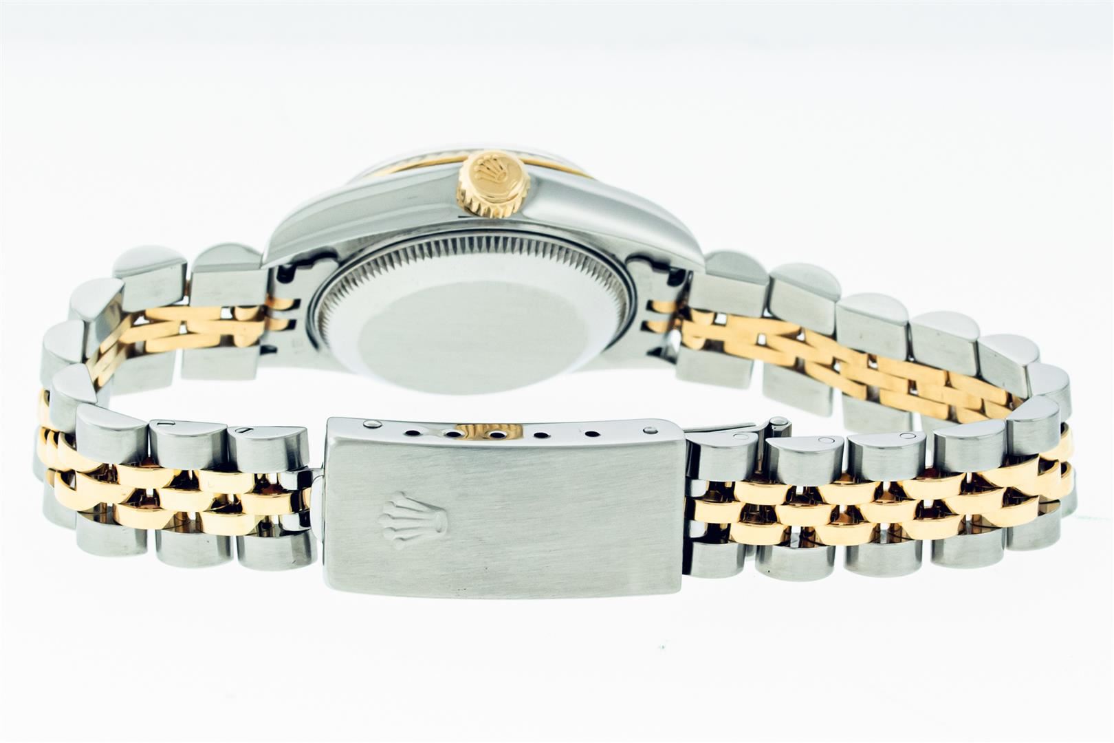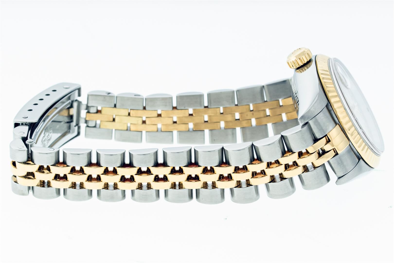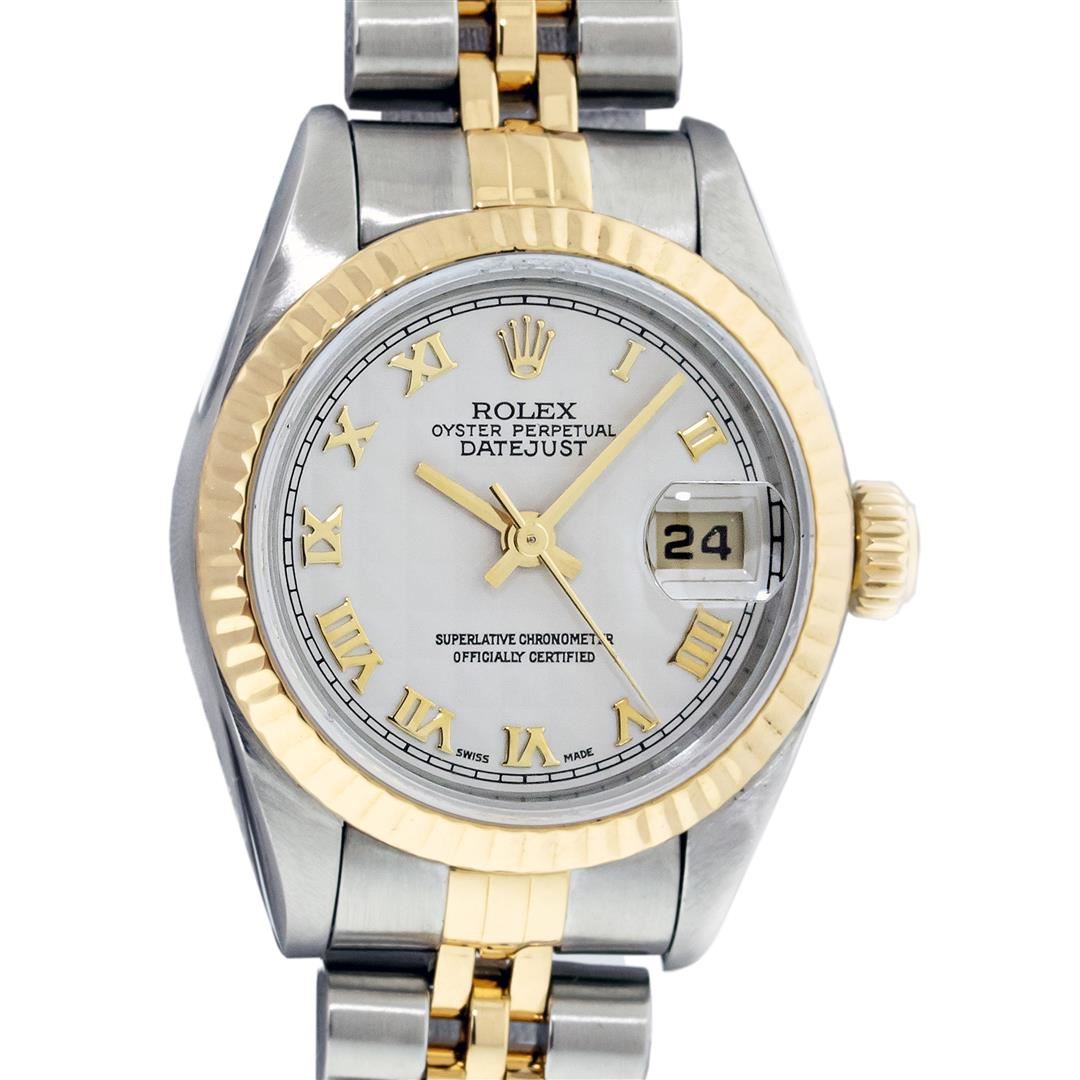 Rolex Ladies Pre Owned Sapphire Quickset 18K Yellow Gold and Stainless Steel Two Tone Oyster Perpetual Datejust Polished Bright with Satin Finish, Serviced & Electronically Tested, Rolex Stainless Steel Case: 26mm, Rolex 18K Yellow Gold Crown, Rolex Bezel: Rolex 18K Yellow Gold Fluted Bezel. Crystal: Sapphire With Magnified Date Window. Custom Hands: New Hands. Rolex Movement: Automatic Winding Movement 2235. Rolex Dial: Rolex Silver Pyramid Roman Dial. Date Window: 3 O'Clock Position Date Display, Model: Quickset Datejust, Condition: G-6 Extra Fine. Rolex Bracelet: 18K Yellow Gold & Stainless Steel Jubilee Band. Bright Polish & Satin Finish. 6.0 Inch Length, Adjustable. Standard Clasp, With Rolex Logo. This Watch Has Been Serviced Time Tested And Is In Excellent Condition It Is Free Of All Scratches And Dents. This Watch Comes With A Rolex Box.