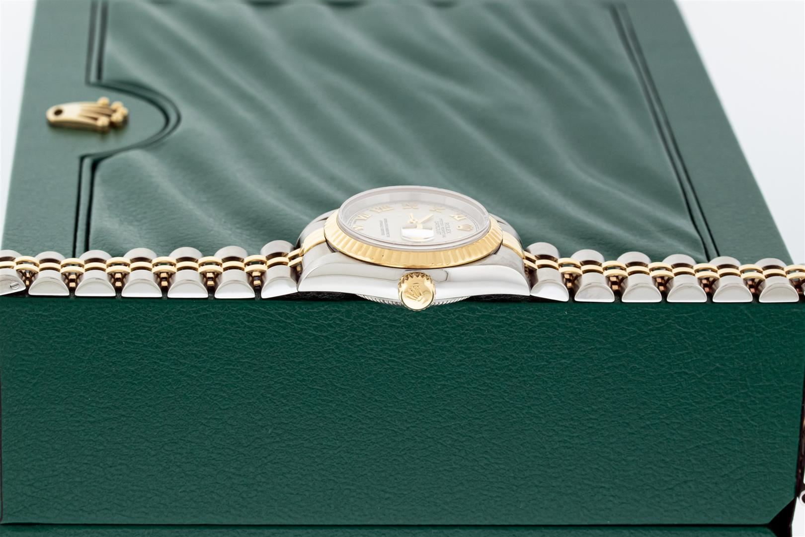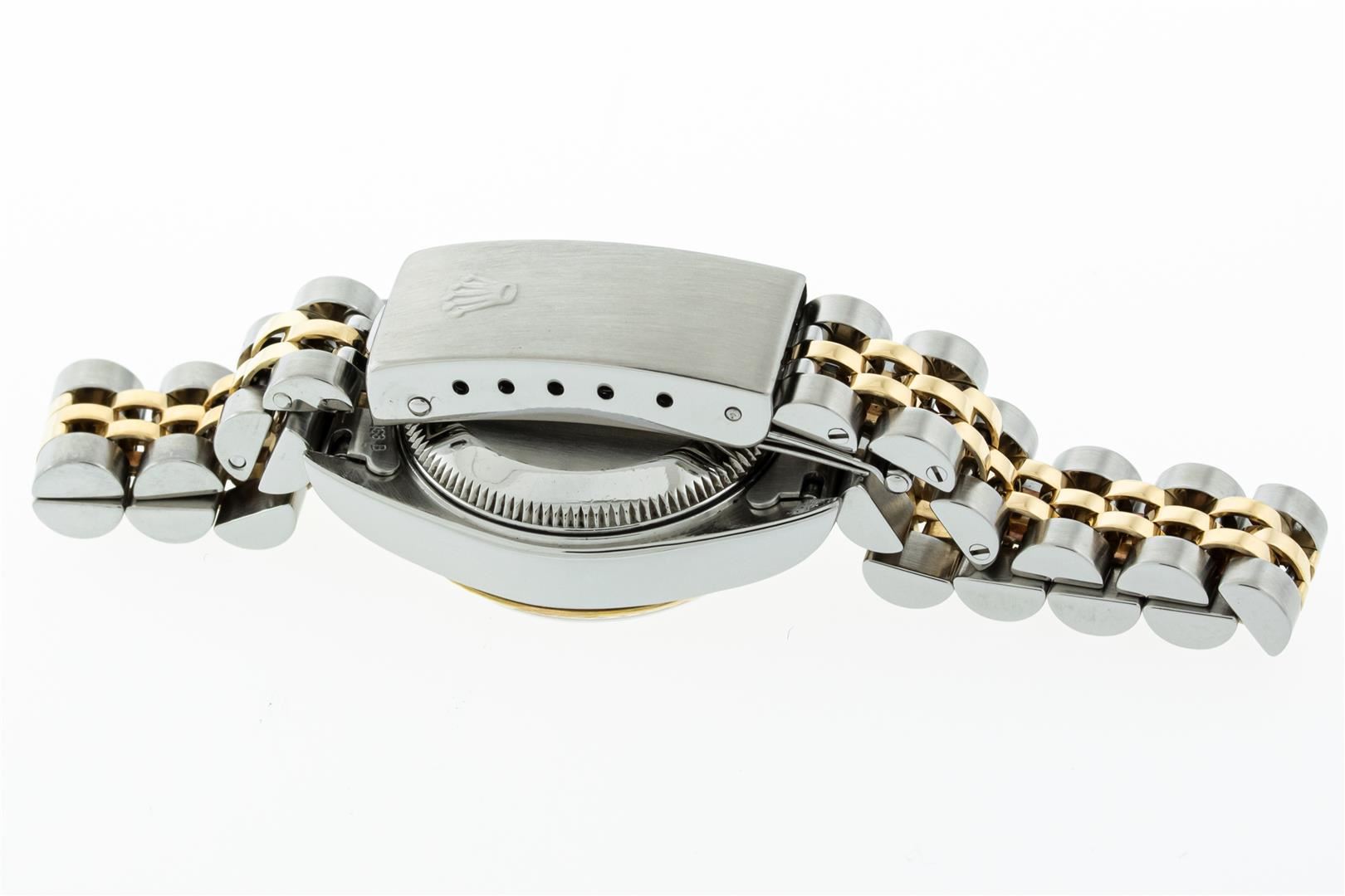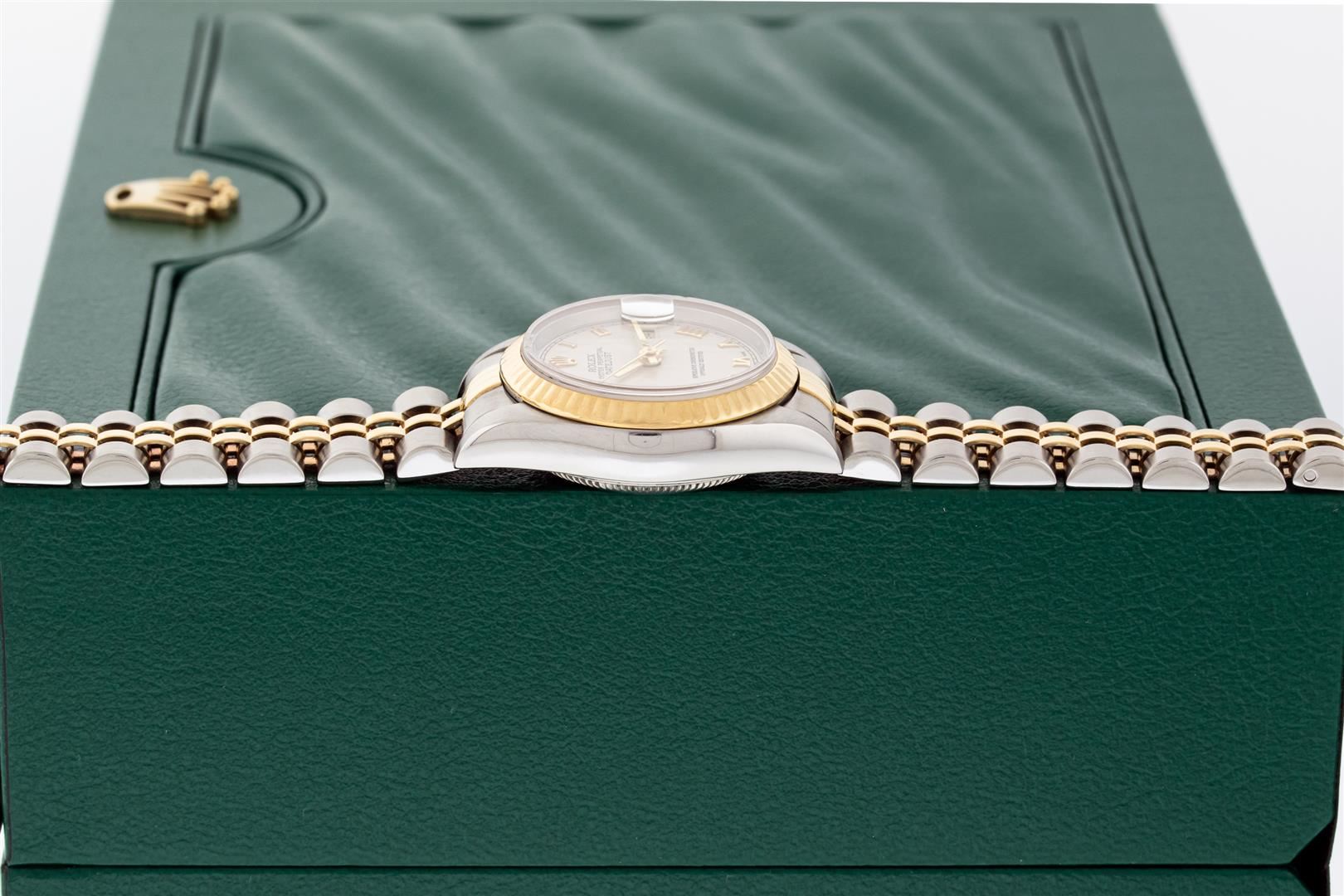 Rolex Ladies Pre Owned Sapphire Quickset 18K Yellow Gold and Stainless Steel Two Tone Oyster Perpetual Datejust Polished Bright with Satin Finish, Serviced & Electronically Tested, Rolex Stainless Steel Case: 26mm, Rolex 18K Yellow Gold Crown, Rolex Bezel: Rolex 18K Yellow Gold Fluted Bezel. Crystal: Sapphire With Magnified Date Window. Custom Hands: New Hands. Rolex Movement: Automatic Winding Movement 2235. Rolex Dial: Rolex Silver Pyramid Roman Dial. Date Window: 3 O'Clock Position Date Display, Model: Quickset Datejust, Condition: G-6 Extra Fine. Rolex Bracelet: 18K Yellow Gold & Stainless Steel Jubilee Band. Bright Polish & Satin Finish. 6.0 Inch Length, Adjustable. Standard Clasp, With Rolex Logo. This Watch Has Been Serviced Time Tested And Is In Excellent Condition It Is Free Of All Scratches And Dents. This Watch Comes With A Rolex Box.