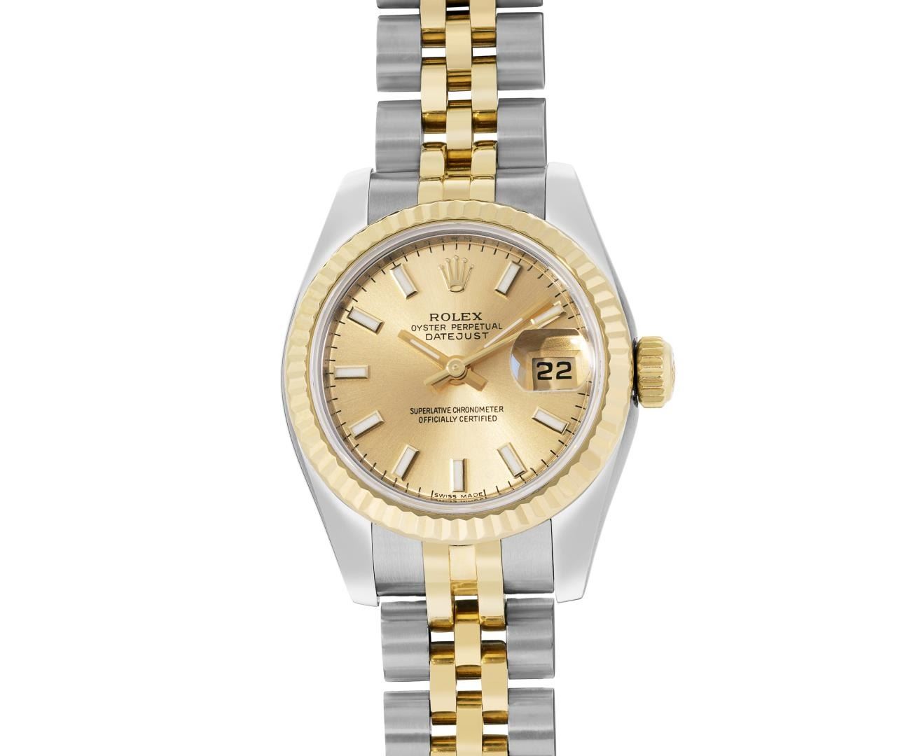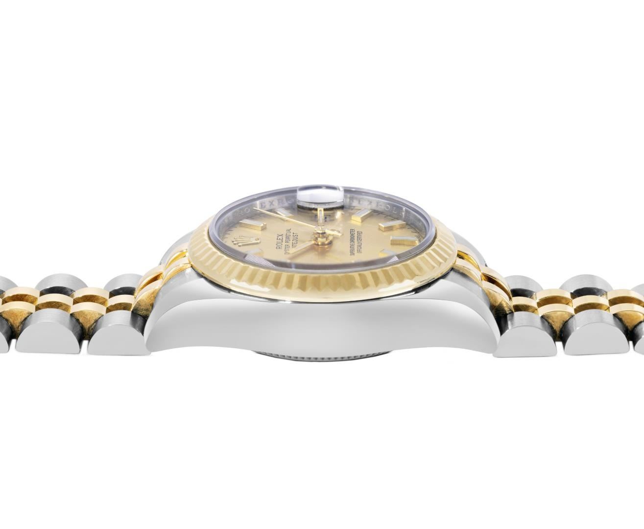 One Rolex Ladies Pre Owned Two Tone 18K Yellow Gold And Stainless Steel Rolex Datejust Polished, Serviced And Electronically Tested, Rolex Yellow Gold And Stainless Steel Case: 26mm, Rolex Yellow Gold Crown. Rolex 18K Yellow Gold Fluted Bezel. Crystal: Sapphire Crystal With Date Window. Hands: Luminescent Hands. Rolex Movement: 2235 Automatic Winding Movement. Rolex Dial: Factory Champagne Index Dial. Date Window: 3 O'Clock Position Date Display, Condition: G-6 Extra Fine. Rolex Bracelet: Two Tone 18K Yellow Gold And Stainless Steel Jubilee Band. Bright Polish And Satin Finish. 6.0 Inch Length, Adjustable. Hidden Clasp, With Rolex Logo. This Watch Has Been Serviced Time Tested And Is In Excellent Condition It Is Free Of All Scratches And Dents. This Watch Comes With A Rolex Box.