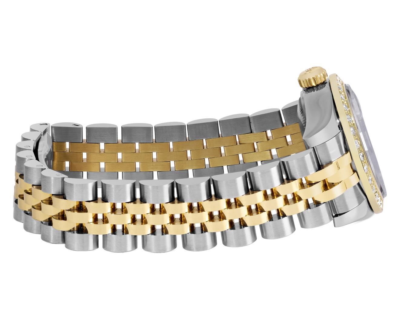 One Rolex Ladies Pre Owned Two Tone 18K Yellow Gold And Stainless Steel Rolex Datejust Polished, Serviced And Electronically Tested, Rolex Yellow Gold And Stainless Steel Case: 26mm, Rolex Yellow Gold Crown. Custom Bezel: New 18K Yellow Gold Beadset Diamond Bezel, Diamond Count: 32 Diamonds On Bezel. Crystal: Sapphire Crystal With Date Window. Hands: Solid Hands. Rolex Movement: 2235 Automatic Winding Movement. Rolex Dial: Factory White Roman Dial. Date Window: 3 O'Clock Position Date Display, Condition: G-6 Extra Fine. Rolex Bracelet: Two Tone 18K Yellow Gold And Stainless Steel Jubilee Band. Bright Polish & Satin Finish. 6.0 Inch Length, Adjustable. Hidden Clasp, With Rolex Logo. This Watch Has Been Serviced Time Tested And Is In Excellent Condition It Is Free Of All Scratches And Dents. This Watch Comes With A Rolex Box.
