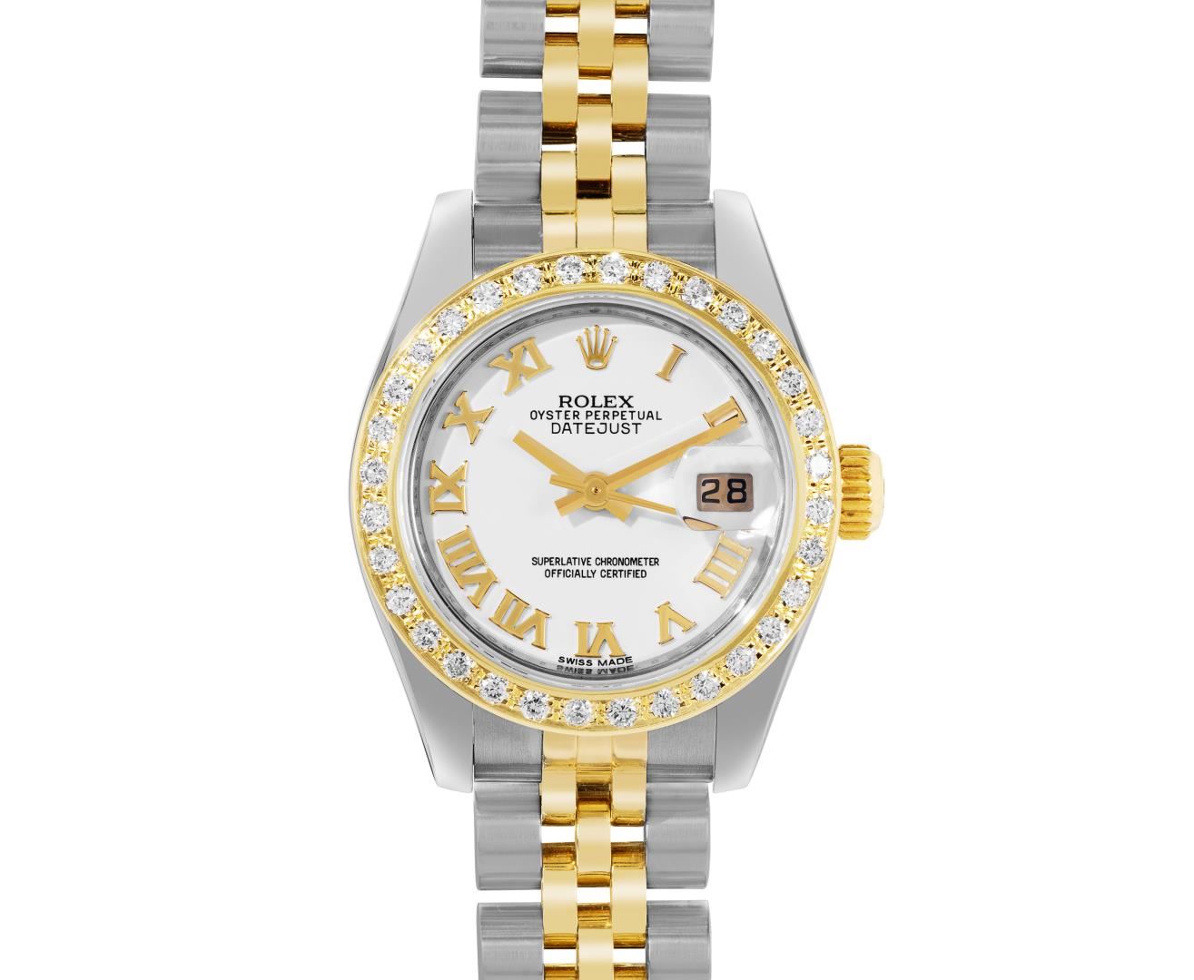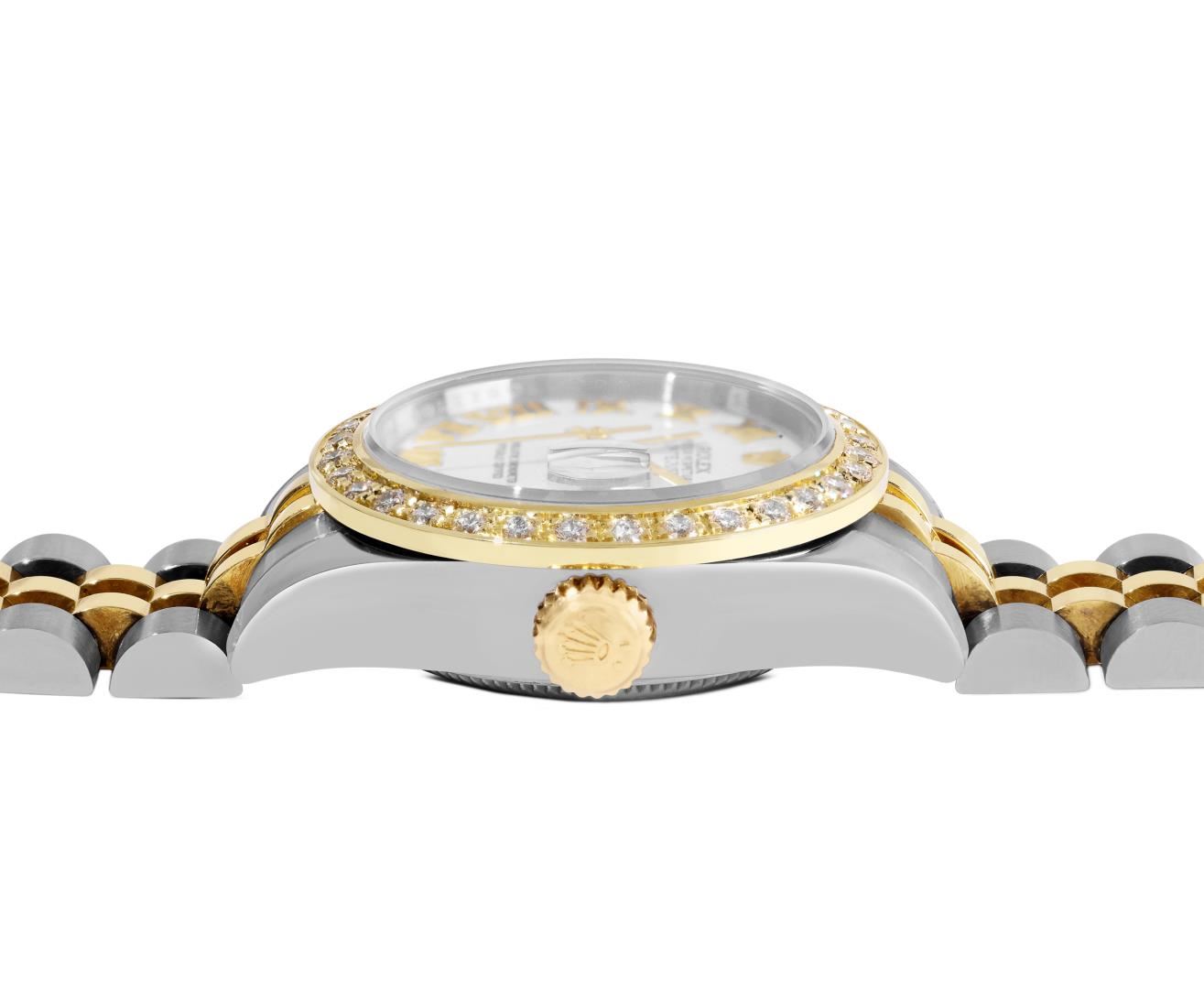 One Rolex Ladies Pre Owned Two Tone 18K Yellow Gold And Stainless Steel Rolex Datejust Polished, Serviced And Electronically Tested, Rolex Yellow Gold And Stainless Steel Case: 26mm, Rolex Yellow Gold Crown. Custom Bezel: New 18K Yellow Gold Beadset Diamond Bezel, Diamond Count: 32 Diamonds On Bezel. Crystal: Sapphire Crystal With Date Window. Hands: Solid Hands. Rolex Movement: 2235 Automatic Winding Movement. Rolex Dial: Factory White Roman Dial. Date Window: 3 O'Clock Position Date Display, Condition: G-6 Extra Fine. Rolex Bracelet: Two Tone 18K Yellow Gold And Stainless Steel Jubilee Band. Bright Polish & Satin Finish. 6.0 Inch Length, Adjustable. Hidden Clasp, With Rolex Logo. This Watch Has Been Serviced Time Tested And Is In Excellent Condition It Is Free Of All Scratches And Dents. This Watch Comes With A Rolex Box.