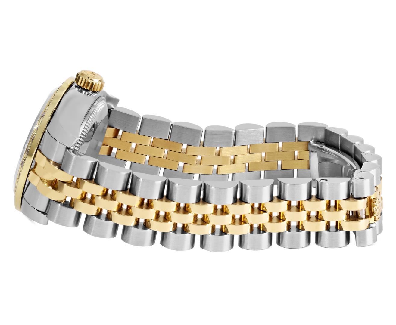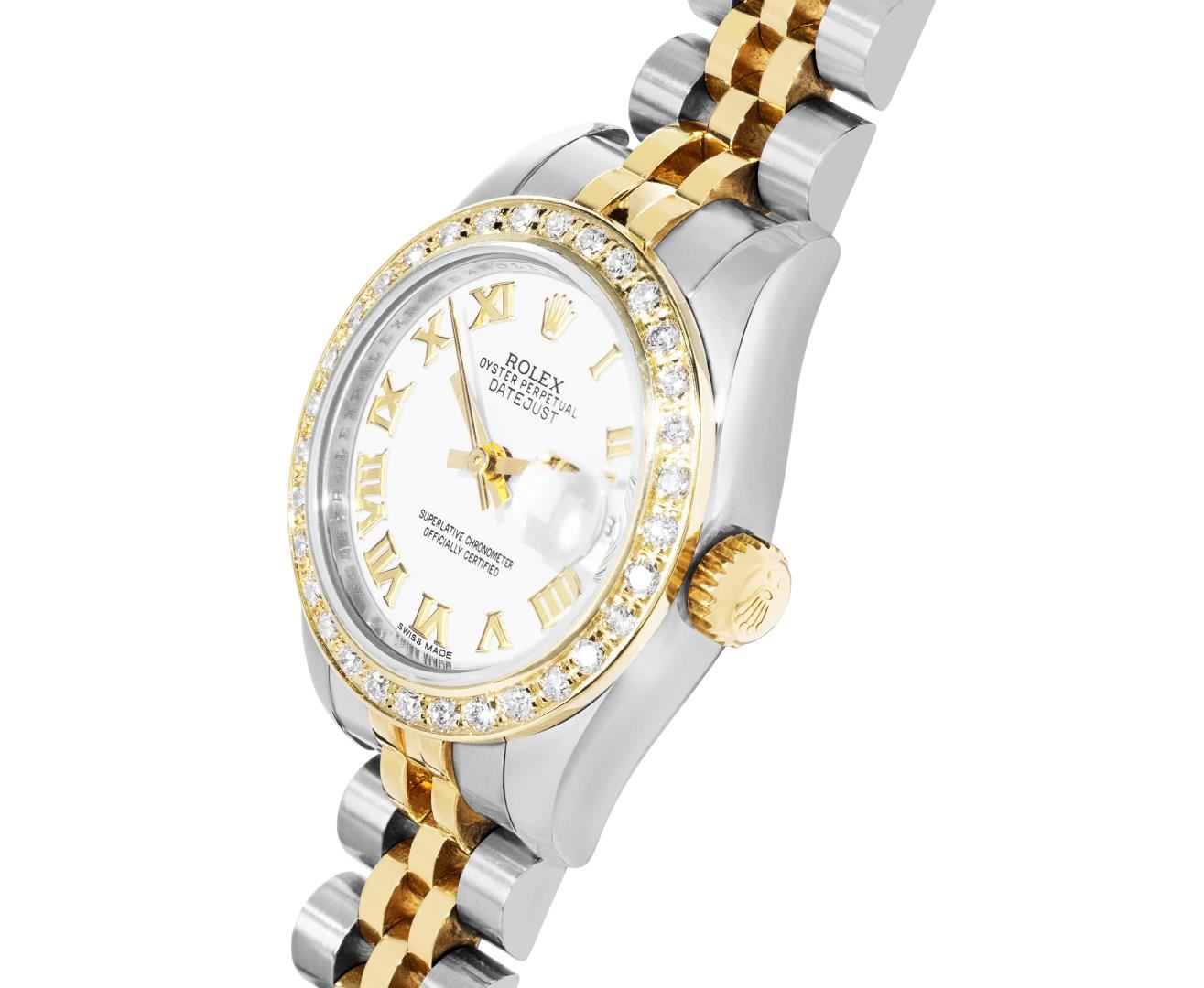 One Rolex Ladies Pre Owned Two Tone 18K Yellow Gold And Stainless Steel Rolex Datejust Polished, Serviced And Electronically Tested, Rolex Yellow Gold And Stainless Steel Case: 26mm, Rolex Yellow Gold Crown. Custom Bezel: New 18K Yellow Gold Beadset Diamond Bezel, Diamond Count: 32 Diamonds On Bezel. Crystal: Sapphire Crystal With Date Window. Hands: Solid Hands. Rolex Movement: 2235 Automatic Winding Movement. Rolex Dial: Factory White Roman Dial. Date Window: 3 O'Clock Position Date Display, Condition: G-6 Extra Fine. Rolex Bracelet: Two Tone 18K Yellow Gold And Stainless Steel Jubilee Band. Bright Polish & Satin Finish. 6.0 Inch Length, Adjustable. Hidden Clasp, With Rolex Logo. This Watch Has Been Serviced Time Tested And Is In Excellent Condition It Is Free Of All Scratches And Dents. This Watch Comes With A Rolex Box.