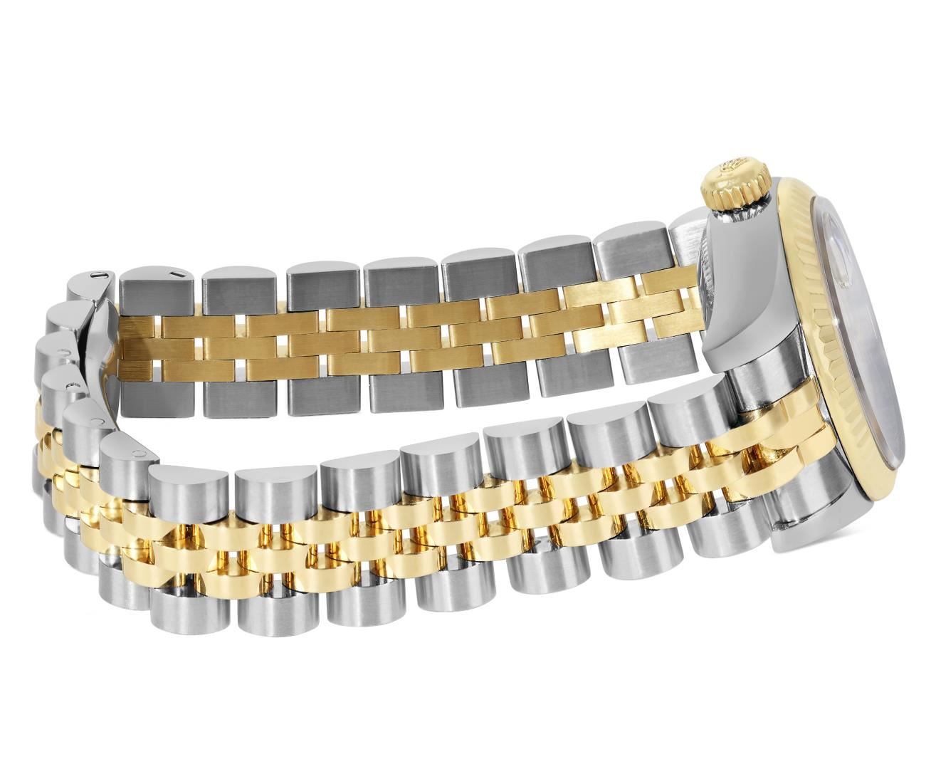 One Rolex Ladies Pre Owned Two Tone 18K Yellow Gold And Stainless Steel Rolex Datejust Polished, Serviced & Electronically Tested, Rolex Yellow Gold And Stainless Steel Case: 26mm, Rolex Yellow Gold Crown. Rolex 18K Yellow Gold Fluted Bezel. Crystal: Sapphire Crystal With Date Window. Hands: Solid Hands. Rolex Movement: 2235 Automatic Winding Movement. Rolex Factory Dial: Factory White Roman Dial. Date Window: 3 O'Clock Position Date Display, Condition: G-6 Extra Fine. Rolex Bracelet: Two Tone 18K Yellow Gold And Stainless Steel Jubilee Band. Bright Polish And Satin Finish. 6.0 Inch Length, Adjustable. Hidden Clasp, With Rolex Logo. This Watch Has Been Serviced Time Tested And Is In Excellent Condition It Is Free Of All Scratches And Dents. This Watch Comes With A Rolex Box.