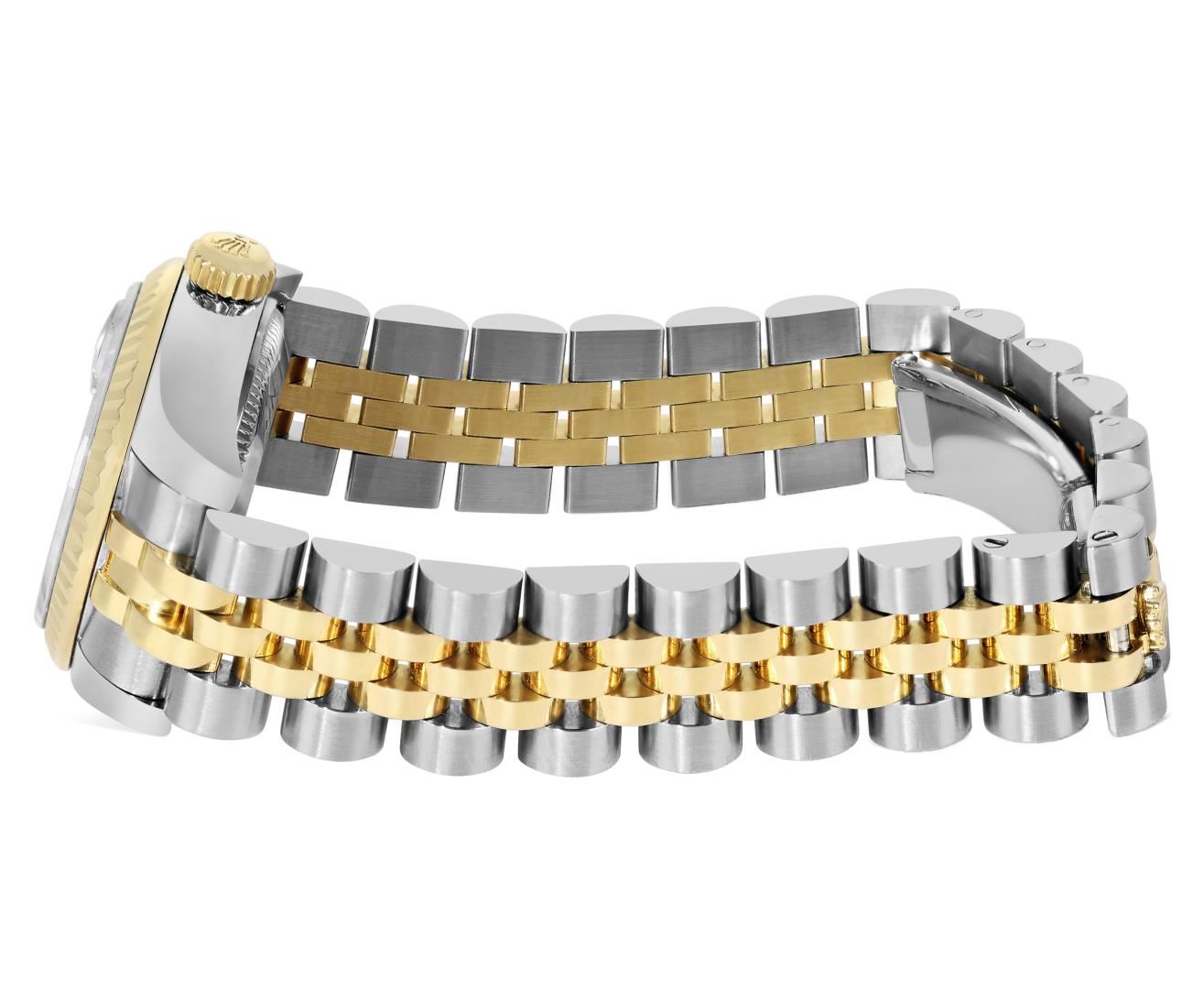 One Rolex Ladies Pre Owned Two Tone 18K Yellow Gold And Stainless Steel Rolex Datejust Polished, Serviced & Electronically Tested, Rolex Yellow Gold And Stainless Steel Case: 26mm, Rolex Yellow Gold Crown. Rolex 18K Yellow Gold Fluted Bezel. Crystal: Sapphire Crystal With Date Window. Hands: Solid Hands. Rolex Movement: 2235 Automatic Winding Movement. Rolex Factory Dial: Factory White Roman Dial. Date Window: 3 O'Clock Position Date Display, Condition: G-6 Extra Fine. Rolex Bracelet: Two Tone 18K Yellow Gold And Stainless Steel Jubilee Band. Bright Polish And Satin Finish. 6.0 Inch Length, Adjustable. Hidden Clasp, With Rolex Logo. This Watch Has Been Serviced Time Tested And Is In Excellent Condition It Is Free Of All Scratches And Dents. This Watch Comes With A Rolex Box.