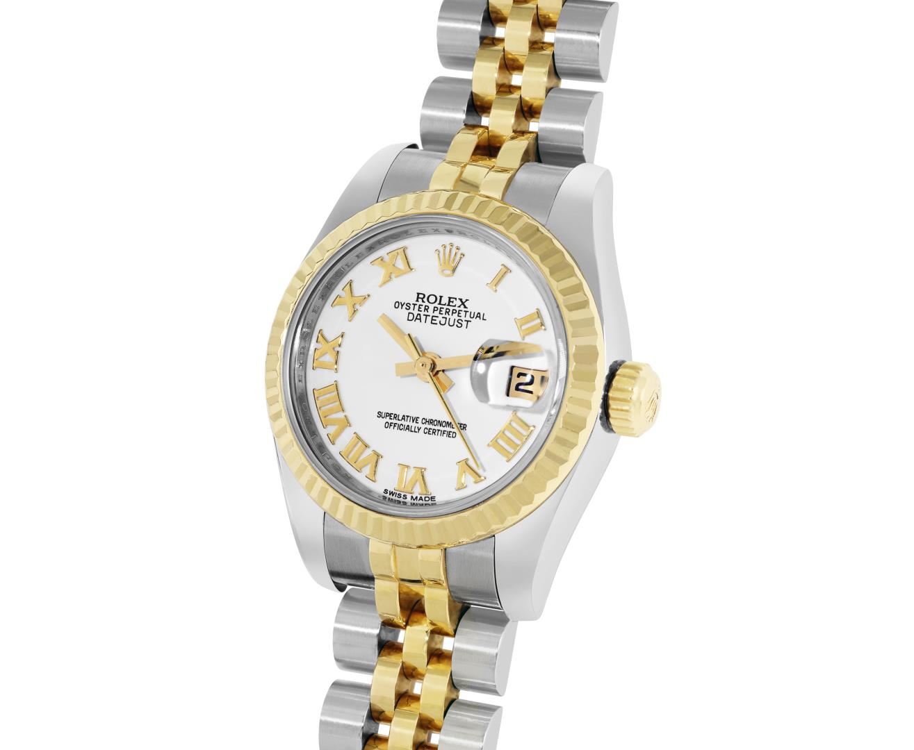 One Rolex Ladies Pre Owned Two Tone 18K Yellow Gold And Stainless Steel Rolex Datejust Polished, Serviced & Electronically Tested, Rolex Yellow Gold And Stainless Steel Case: 26mm, Rolex Yellow Gold Crown. Rolex 18K Yellow Gold Fluted Bezel. Crystal: Sapphire Crystal With Date Window. Hands: Solid Hands. Rolex Movement: 2235 Automatic Winding Movement. Rolex Factory Dial: Factory White Roman Dial. Date Window: 3 O'Clock Position Date Display, Condition: G-6 Extra Fine. Rolex Bracelet: Two Tone 18K Yellow Gold And Stainless Steel Jubilee Band. Bright Polish And Satin Finish. 6.0 Inch Length, Adjustable. Hidden Clasp, With Rolex Logo. This Watch Has Been Serviced Time Tested And Is In Excellent Condition It Is Free Of All Scratches And Dents. This Watch Comes With A Rolex Box.
