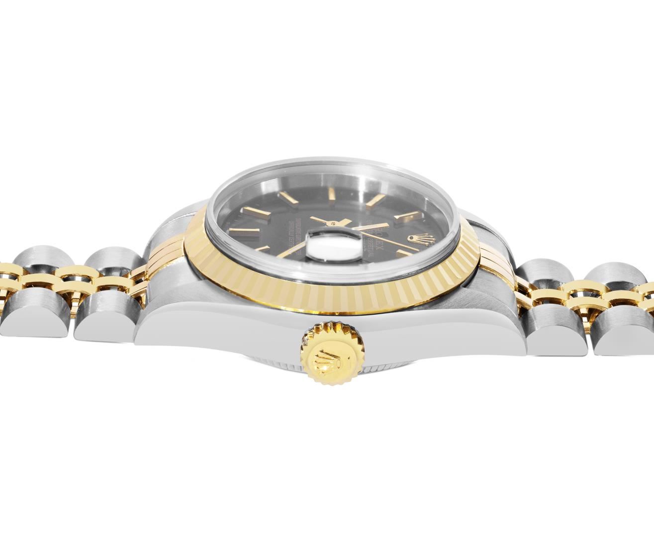 Rolex Ladies Pre Owned Sapphire Quickset 18K Yellow Gold and Stainless Steel Two Tone Datejust Polished Bright with Satin Finish, Serviced & Electronically Tested, Rolex Stainless Steel Case: 26mm, Rolex 18K Yellow Gold Crown, Rolex 18K Yellow Gold Fluted Bezel. Crystal: Sapphire With Magnified Date Window. Hands: Luminecent Hands. Rolex Movement: Automatic Winding Movement 2235. Rolex Dial: Factory Black Index Dial. Date Window: 3 O'Clock Position Date Display, Model: Quickset Datejust, Condition: G-6 Extra Fine. Rolex Bracelet: 18K Yellow Gold & Stainless Steel Jubilee Band. Bright Polish & Satin Finish. 6.0 Inch Length, Adjustable. Standard Clasp, With Rolex Logo. This Watch Has Been Serviced Time Tested And Is In Excellent Condition It Is Free Of All Scratches And Dents. This Watch Comes With A Rolex Box.