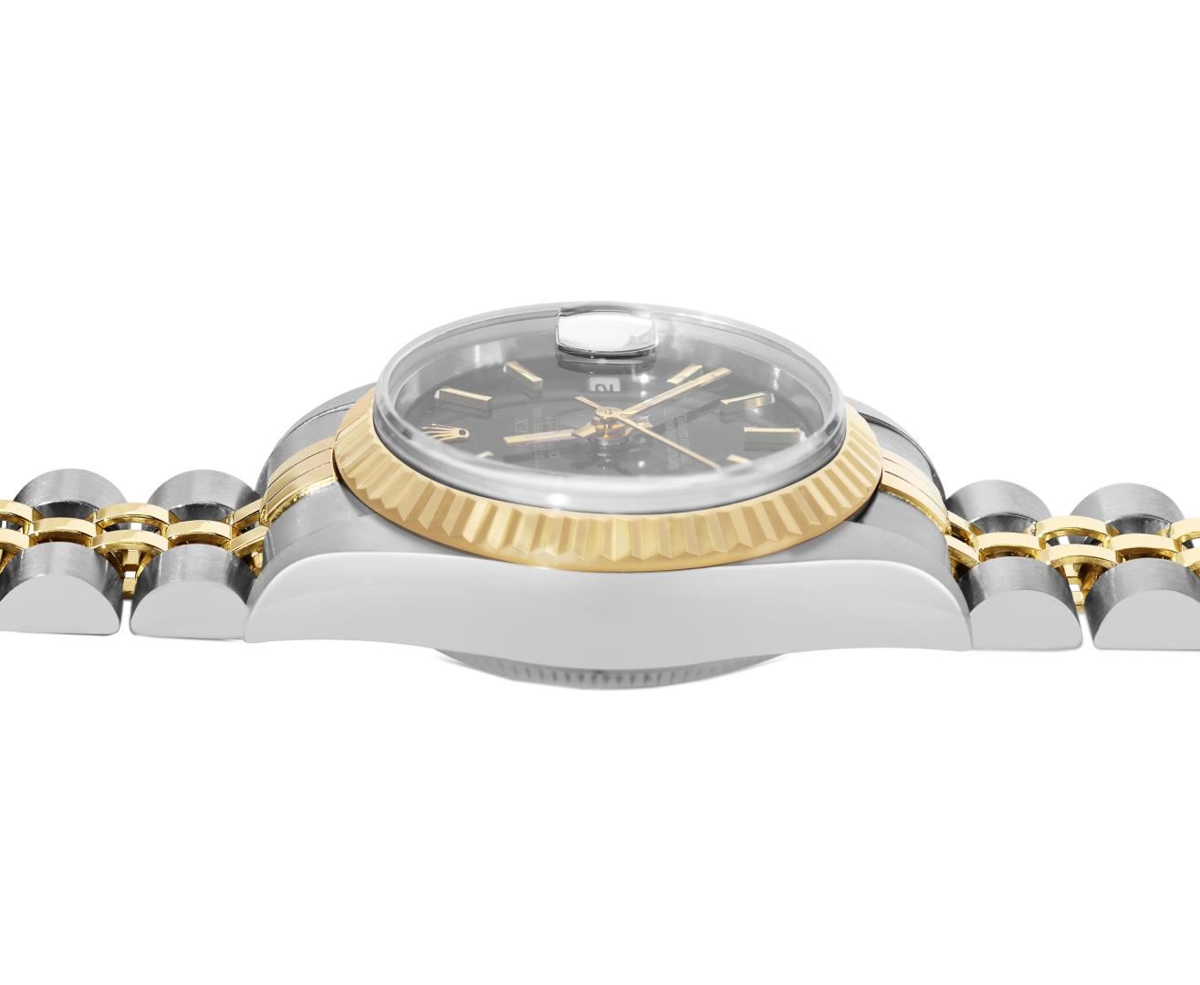 Rolex Ladies Pre Owned Sapphire Quickset 18K Yellow Gold and Stainless Steel Two Tone Datejust Polished Bright with Satin Finish, Serviced & Electronically Tested, Rolex Stainless Steel Case: 26mm, Rolex 18K Yellow Gold Crown, Rolex 18K Yellow Gold Fluted Bezel. Crystal: Sapphire With Magnified Date Window. Hands: Luminecent Hands. Rolex Movement: Automatic Winding Movement 2235. Rolex Dial: Factory Black Index Dial. Date Window: 3 O'Clock Position Date Display, Model: Quickset Datejust, Condition: G-6 Extra Fine. Rolex Bracelet: 18K Yellow Gold & Stainless Steel Jubilee Band. Bright Polish & Satin Finish. 6.0 Inch Length, Adjustable. Standard Clasp, With Rolex Logo. This Watch Has Been Serviced Time Tested And Is In Excellent Condition It Is Free Of All Scratches And Dents. This Watch Comes With A Rolex Box.