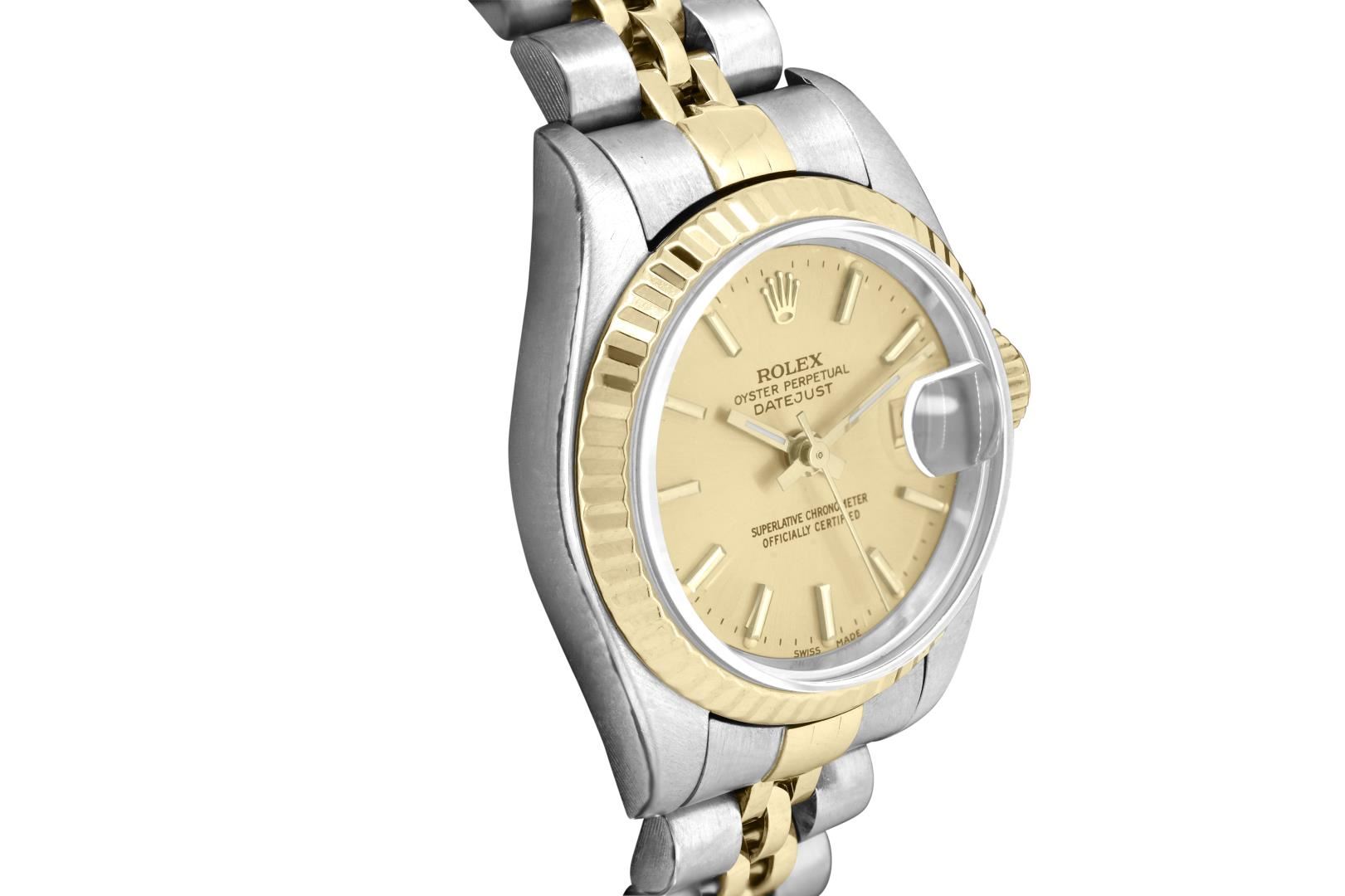 Rolex Ladies Pre Owned Sapphire Quickset 18K Yellow Gold and Stainless Steel Two Tone Datejust Polished Bright with Satin Finish, Serviced And Electronically Tested, Rolex Stainless Steel Case: 26mm, Rolex 18K Yellow Gold Crown, Rolex 18K Yellow Gold Fluted Bezel. Custom Crystal: New Sapphire With Magnified Date Window. Custom Hands: New Luminescent Hands. Rolex Movement: Automatic Winding Movement 2235. Rolex Dial: Factory Champagne Index Dial. Date Window: 3 O'Clock Position Date Display, Model: Quickset Datejust, Condition: G-6 Extra Fine. Rolex Bracelet: 18K Yellow Gold And Stainless Steel Jubilee Band. Bright Polish And Satin Finish. 6.0 Inch Length, Adjustable. Standard Clasp, With Rolex Logo. This Watch Has Been Serviced Time Tested And Is In Excellent Condition It Is Free Of All Scratches And Dents. This Watch Comes With A Rolex Box.