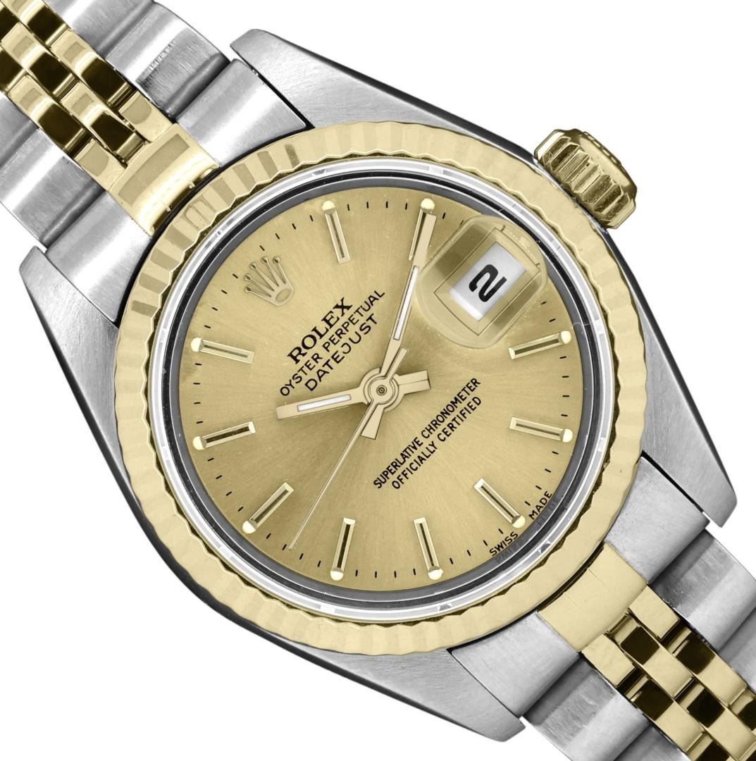Rolex Ladies Pre Owned Sapphire Quickset 18K Yellow Gold and Stainless Steel Two Tone Datejust Polished Bright with Satin Finish, Serviced And Electronically Tested, Rolex Stainless Steel Case: 26mm, Rolex 18K Yellow Gold Crown, Rolex 18K Yellow Gold Fluted Bezel. Custom Crystal: New Sapphire With Magnified Date Window. Custom Hands: New Luminescent Hands. Rolex Movement: Automatic Winding Movement 2235. Rolex Dial: Factory Champagne Index Dial. Date Window: 3 O'Clock Position Date Display, Model: Quickset Datejust, Condition: G-6 Extra Fine. Rolex Bracelet: 18K Yellow Gold And Stainless Steel Jubilee Band. Bright Polish And Satin Finish. 6.0 Inch Length, Adjustable. Standard Clasp, With Rolex Logo. This Watch Has Been Serviced Time Tested And Is In Excellent Condition It Is Free Of All Scratches And Dents. This Watch Comes With A Rolex Box.