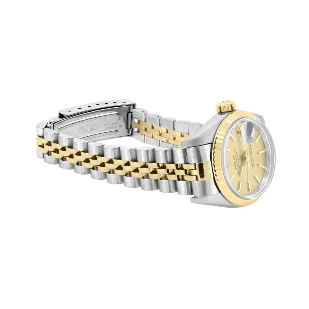 Rolex Ladies Pre Owned Sapphire Quickset 18K Yellow Gold and Stainless Steel Two Tone Datejust Polished Bright with Satin Finish, Serviced And Electronically Tested, Rolex Stainless Steel Case: 26mm, Rolex 18K Yellow Gold Crown, Rolex 18K Yellow Gold Fluted Bezel. Custom Crystal: New Sapphire With Magnified Date Window. Custom Hands: New Luminescent Hands. Rolex Movement: Automatic Winding Movement 2235. Rolex Dial: Factory Champagne Index Dial. Date Window: 3 O'Clock Position Date Display, Model: Quickset Datejust, Condition: G-6 Extra Fine. Rolex Bracelet: 18K Yellow Gold And Stainless Steel Jubilee Band. Bright Polish And Satin Finish. 6.0 Inch Length, Adjustable. Standard Clasp, With Rolex Logo. This Watch Has Been Serviced Time Tested And Is In Excellent Condition It Is Free Of All Scratches And Dents. This Watch Comes With A Rolex Box.