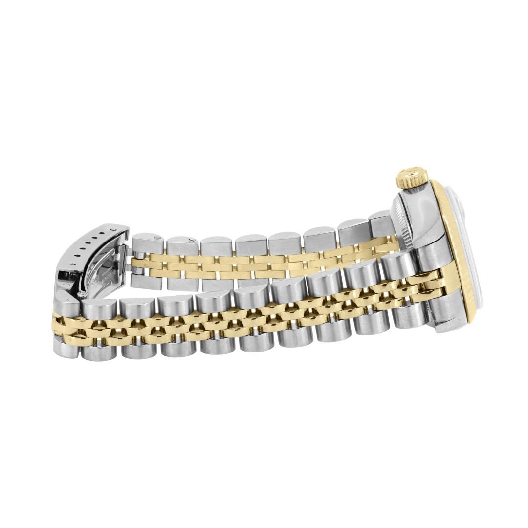Rolex Ladies Pre Owned Sapphire Quickset 18K Yellow Gold and Stainless Steel Two Tone Datejust Polished Bright with Satin Finish, Serviced And Electronically Tested, Rolex Stainless Steel Case: 26mm, Rolex 18K Yellow Gold Crown, Rolex 18K Yellow Gold Fluted Bezel. Custom Crystal: New Sapphire With Magnified Date Window. Custom Hands: New Luminescent Hands. Rolex Movement: Automatic Winding Movement 2235. Rolex Dial: Factory Champagne Index Dial. Date Window: 3 O'Clock Position Date Display, Model: Quickset Datejust, Condition: G-6 Extra Fine. Rolex Bracelet: 18K Yellow Gold And Stainless Steel Jubilee Band. Bright Polish And Satin Finish. 6.0 Inch Length, Adjustable. Standard Clasp, With Rolex Logo. This Watch Has Been Serviced Time Tested And Is In Excellent Condition It Is Free Of All Scratches And Dents. This Watch Comes With A Rolex Box.