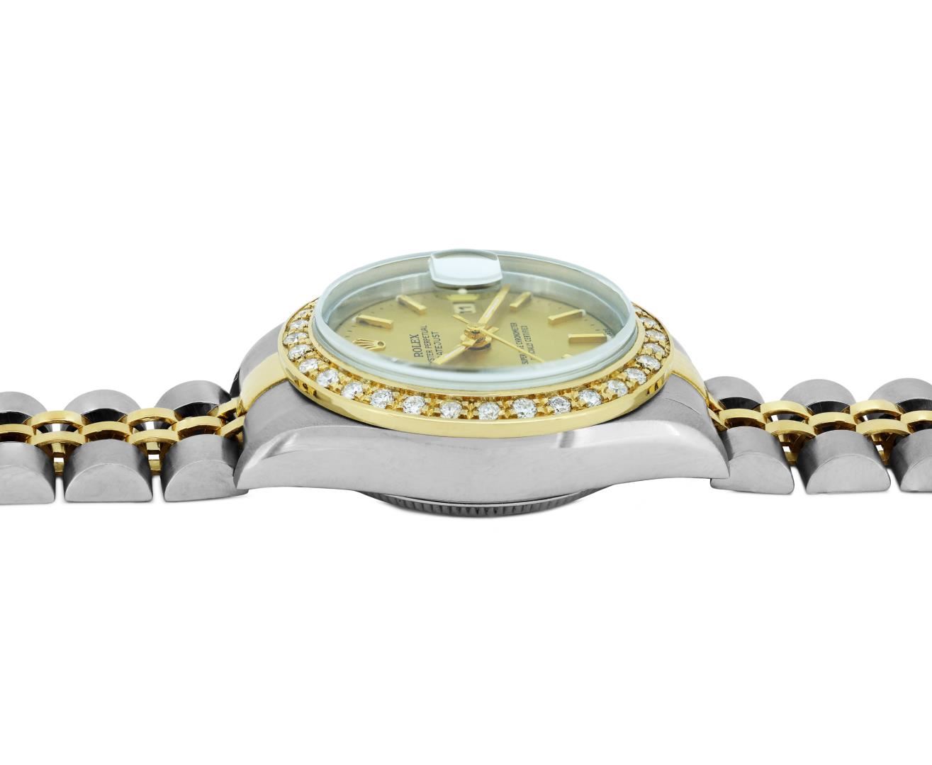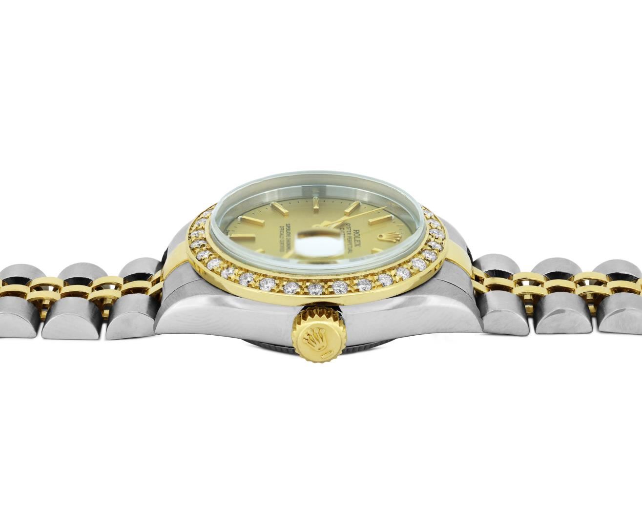 One Rolex Sapphire Ladies Pre Owned Two Tone 18K Yellow Gold And Stainless Steel Rolex Datejust Polished, Serviced And Electronically Tested, Rolex Yellow Gold And Stainless Steel Case: 26mm, Rolex Yellow Gold Crown. Custom Bezel: New 18K Yellow Gold Beadset Diamond Bezel, Diamond Count: 32 Diamonds On Bezel. Crystal: Sapphire Crystal With Date Window. Hands: Luminescent Hands. Rolex Movement: 2235 Automatic Winding Movement. Rolex Factory Dial: Champagne With Index Hour Markers And Dash Track, and Lumi Dots. Date Window: 3 O'Clock Position Date Display, Condition: G-6 Extra Fine. Rolex Bracelet: Two Tone 18K Yellow Gold & Stainless Steel Jubilee Band. Bright Polish & Satin Finish. 6.0 Inch Length, Adjustable. Standard Clasp, With Rolex Logo. This Watch Has Been Serviced Time Tested And Is In Excellent Condition It Is Free Of All Scratches And Dents.