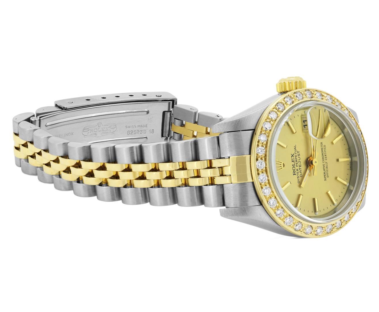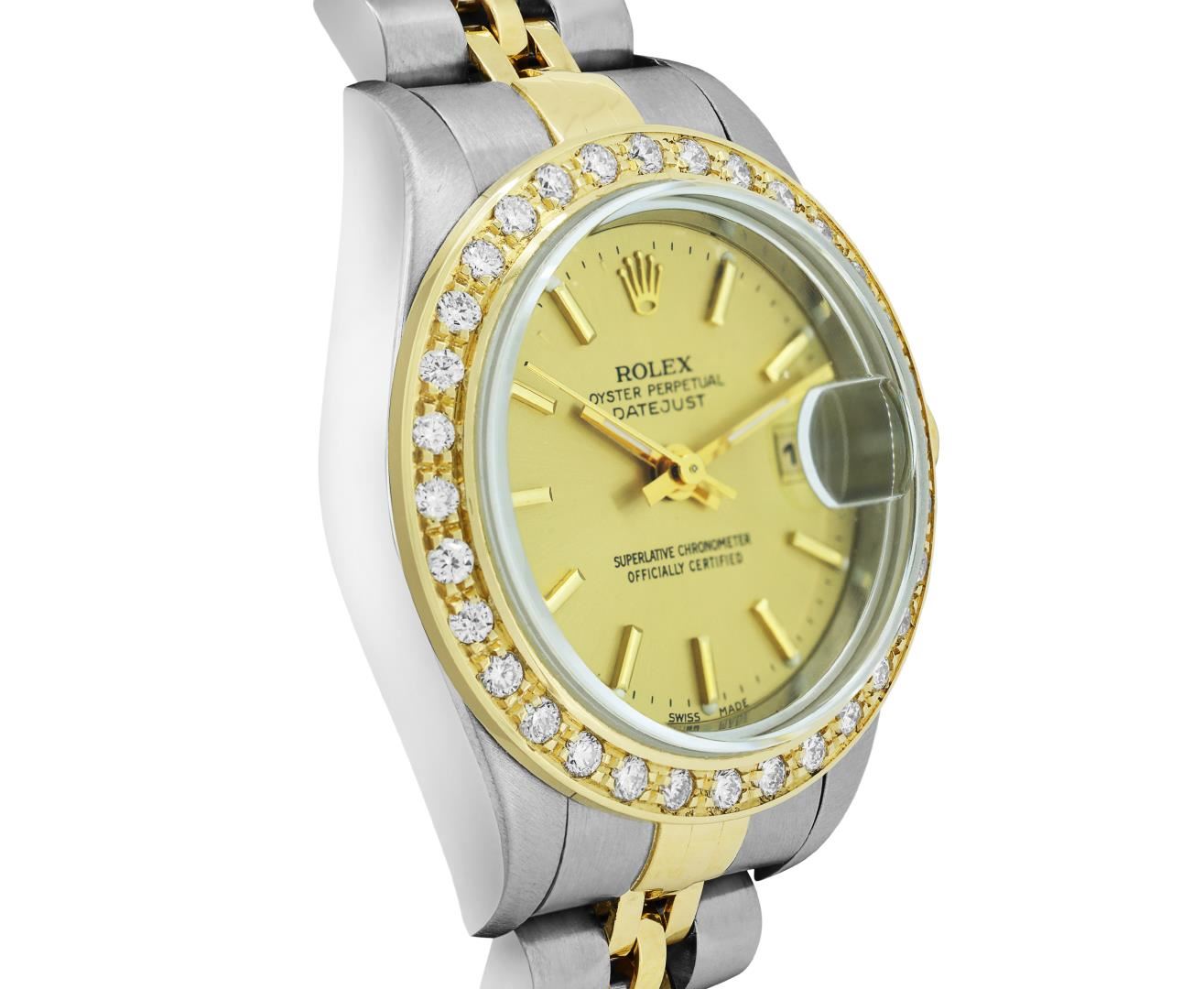 One Rolex Sapphire Ladies Pre Owned Two Tone 18K Yellow Gold And Stainless Steel Rolex Datejust Polished, Serviced And Electronically Tested, Rolex Yellow Gold And Stainless Steel Case: 26mm, Rolex Yellow Gold Crown. Custom Bezel: New 18K Yellow Gold Beadset Diamond Bezel, Diamond Count: 32 Diamonds On Bezel. Crystal: Sapphire Crystal With Date Window. Hands: Luminescent Hands. Rolex Movement: 2235 Automatic Winding Movement. Rolex Factory Dial: Champagne With Index Hour Markers And Dash Track, and Lumi Dots. Date Window: 3 O'Clock Position Date Display, Condition: G-6 Extra Fine. Rolex Bracelet: Two Tone 18K Yellow Gold & Stainless Steel Jubilee Band. Bright Polish & Satin Finish. 6.0 Inch Length, Adjustable. Standard Clasp, With Rolex Logo. This Watch Has Been Serviced Time Tested And Is In Excellent Condition It Is Free Of All Scratches And Dents.