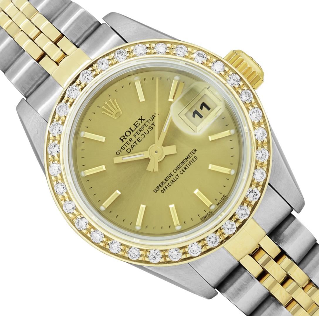 One Rolex Sapphire Ladies Pre Owned Two Tone 18K Yellow Gold And Stainless Steel Rolex Datejust Polished, Serviced And Electronically Tested, Rolex Yellow Gold And Stainless Steel Case: 26mm, Rolex Yellow Gold Crown. Custom Bezel: New 18K Yellow Gold Beadset Diamond Bezel, Diamond Count: 32 Diamonds On Bezel. Crystal: Sapphire Crystal With Date Window. Hands: Luminescent Hands. Rolex Movement: 2235 Automatic Winding Movement. Rolex Factory Dial: Champagne With Index Hour Markers And Dash Track, and Lumi Dots. Date Window: 3 O'Clock Position Date Display, Condition: G-6 Extra Fine. Rolex Bracelet: Two Tone 18K Yellow Gold & Stainless Steel Jubilee Band. Bright Polish & Satin Finish. 6.0 Inch Length, Adjustable. Standard Clasp, With Rolex Logo. This Watch Has Been Serviced Time Tested And Is In Excellent Condition It Is Free Of All Scratches And Dents.