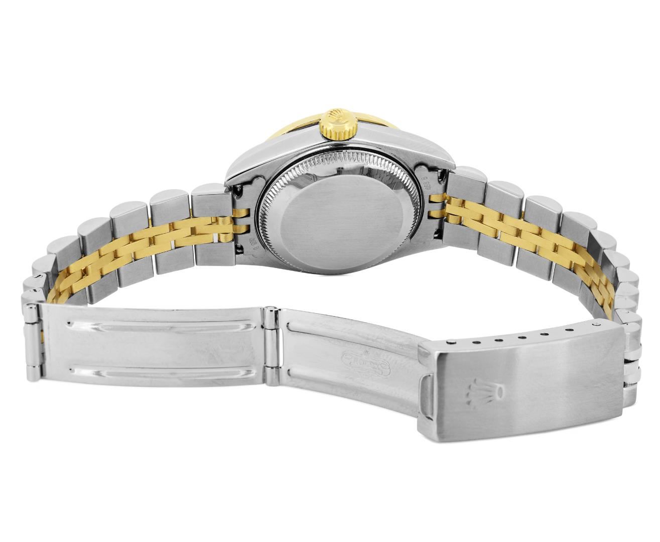 One Rolex Sapphire Ladies Pre Owned Two Tone 18K Yellow Gold And Stainless Steel Rolex Datejust Polished, Serviced And Electronically Tested, Rolex Yellow Gold And Stainless Steel Case: 26mm, Rolex Yellow Gold Crown. Custom Bezel: New 18K Yellow Gold Beadset Diamond Bezel, Diamond Count: 32 Diamonds On Bezel. Crystal: Sapphire Crystal With Date Window. Hands: Luminescent Hands. Rolex Movement: 2235 Automatic Winding Movement. Rolex Factory Dial: Champagne With Index Hour Markers And Dash Track, and Lumi Dots. Date Window: 3 O'Clock Position Date Display, Condition: G-6 Extra Fine. Rolex Bracelet: Two Tone 18K Yellow Gold & Stainless Steel Jubilee Band. Bright Polish & Satin Finish. 6.0 Inch Length, Adjustable. Standard Clasp, With Rolex Logo. This Watch Has Been Serviced Time Tested And Is In Excellent Condition It Is Free Of All Scratches And Dents.