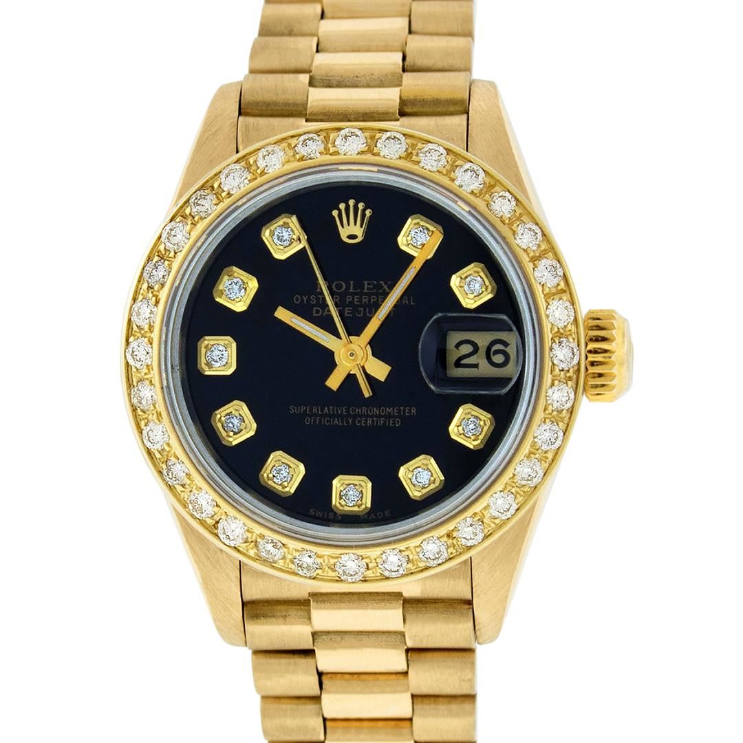 One Ladies Quickset Rolex 18K Yellow Gold President Polished, Serviced & Electronically Tested, 18K Yellow Gold Case: 26mm, 18K Yellow Gold Crown, Custom Bezel: New 18K Yellow Gold Bead Set Diamond Bezel, Diamond Count: 32 Diamonds On Bezel, Total Weight .70 Carat, Clarity: SI-VS, Color: G to H. Custom Crystal: New Scratch Resistant Synthetic Sapphire Cyclops Lens. Movement: Automatic Winding Movement Caliber 2135. Custom Dial: Refinished Black With Diamond Hour Markers, Color: G to H, Diamond Count: 10 Diamonds On Dial, Clarity: VS. Date Window: 3 O'Clock Position, Model: Quickset Datejust President. Condition: G-6 Extra Fine The Watch Is In Very Good Condition Free Of All Scratches And Dents. Bracelet: 18K Yellow Gold President Band, Bright & Satin Polish. 6.0 Inch Length, Standard President Clasp (Hidden Clasp), With Rolex Logo. This Watch Comes With A Rolex Box & Appraisal.