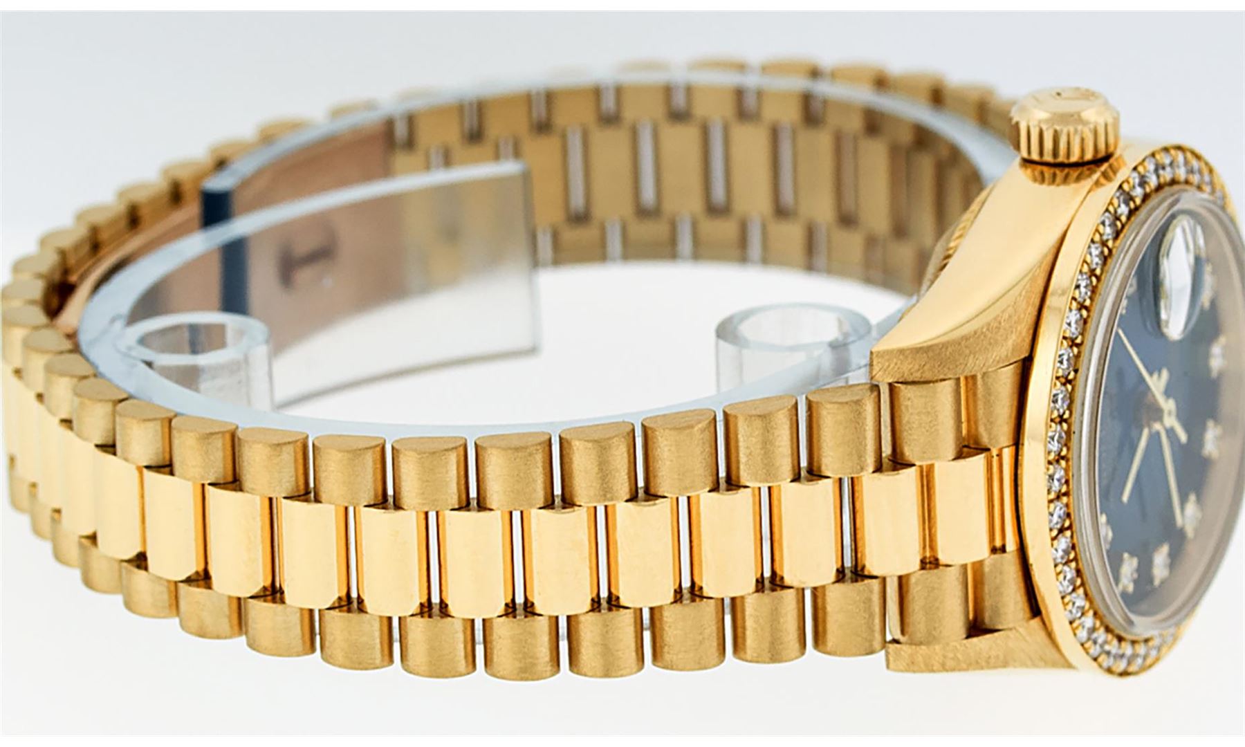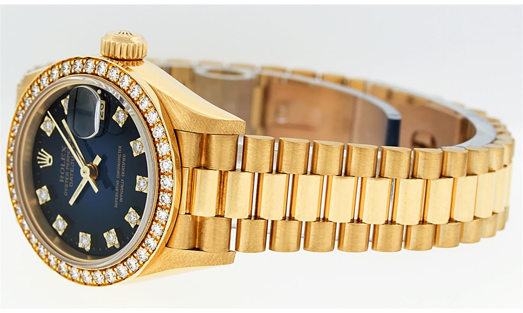 One Ladies Quickset Rolex 18K Yellow Gold President Polished, Serviced & Electronically Tested, 18K Yellow Gold Case: 26mm, 18K Yellow Gold Crown, Custom Bezel: New 18K Yellow Gold 1ctw Bead Set Diamond Bezel, Diamond Count: 42 Diamonds On Bezel, Total Weight 1.00 Carat, Clarity: SI-VS, Color: G to H. Custom Crystal: New Scratch Resistant Synthetic Sapphire Cyclops Lens. Movement: Automatic Winding Quickset Movement Caliber 2135. Custom Dial: Refinished Blue Vignette With Single Cut Diamond Hour Markers, Color: G to H, Diamond Count: 10 Diamonds On Dial, Clarity: SI-VS. Date Window: 3 O'Clock Position, Model: Quickset Datejust President. Condition: G-6 Extra Fine The Watch Is In Very Good Condition Free Of All Scratches And Dents. Bracelet: 18K Yellow Gold President Band, Bright & Satin Polish. 6.0 Inch Length, Standard President Clasp (Hidden Clasp), With Rolex Logo. This Watch Comes With A Rolex Box, Appraisal And Watch Winder.