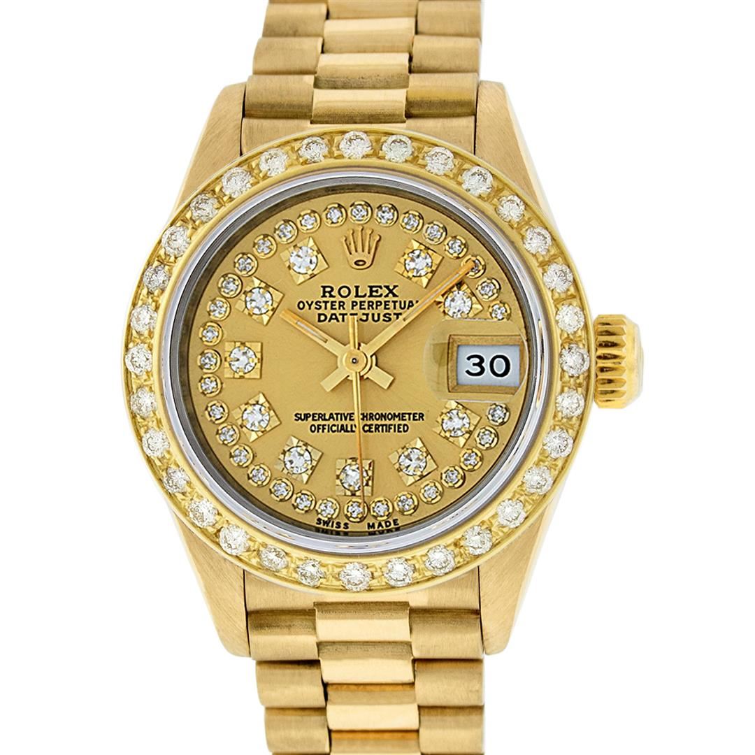 One Ladies Quickset Rolex 18K Yellow Gold President Polished, Serviced & Electronically Tested, 18K Yellow Gold Case: 26mm, 18K Yellow Gold Crown, Custom Bezel: New 18K Yellow Gold Bead Set Diamond Bezel, Diamond Count: 32 Diamonds On Bezel, Total Weight .70 Carat, Clarity: SI-VS, Color: G to H. Custom Crystal: New Scratch Resistant Synthetic Sapphire Cyclops Lens. Movement: Automatic Winding Quickset Movement Caliber 2135. Custom Dial: Refinished Champagne String With Diamond Hour Markers, Color: G to H, Diamond Count: 43 Diamonds On Dial, Clarity: VS. Date Window: 3 O'Clock Position, Model: Quickset Datejust President. Condition: G-6 Extra Fine The Watch Is In Very Good Condition Free Of All Scratches And Dents. Bracelet: 18K Yellow Gold President Band, Bright & Satin Polish. 6.0 Inch Length, Standard President Clasp (Hidden Clasp), With Rolex Logo. This Watch Comes With A Rolex Box & Appraisal.