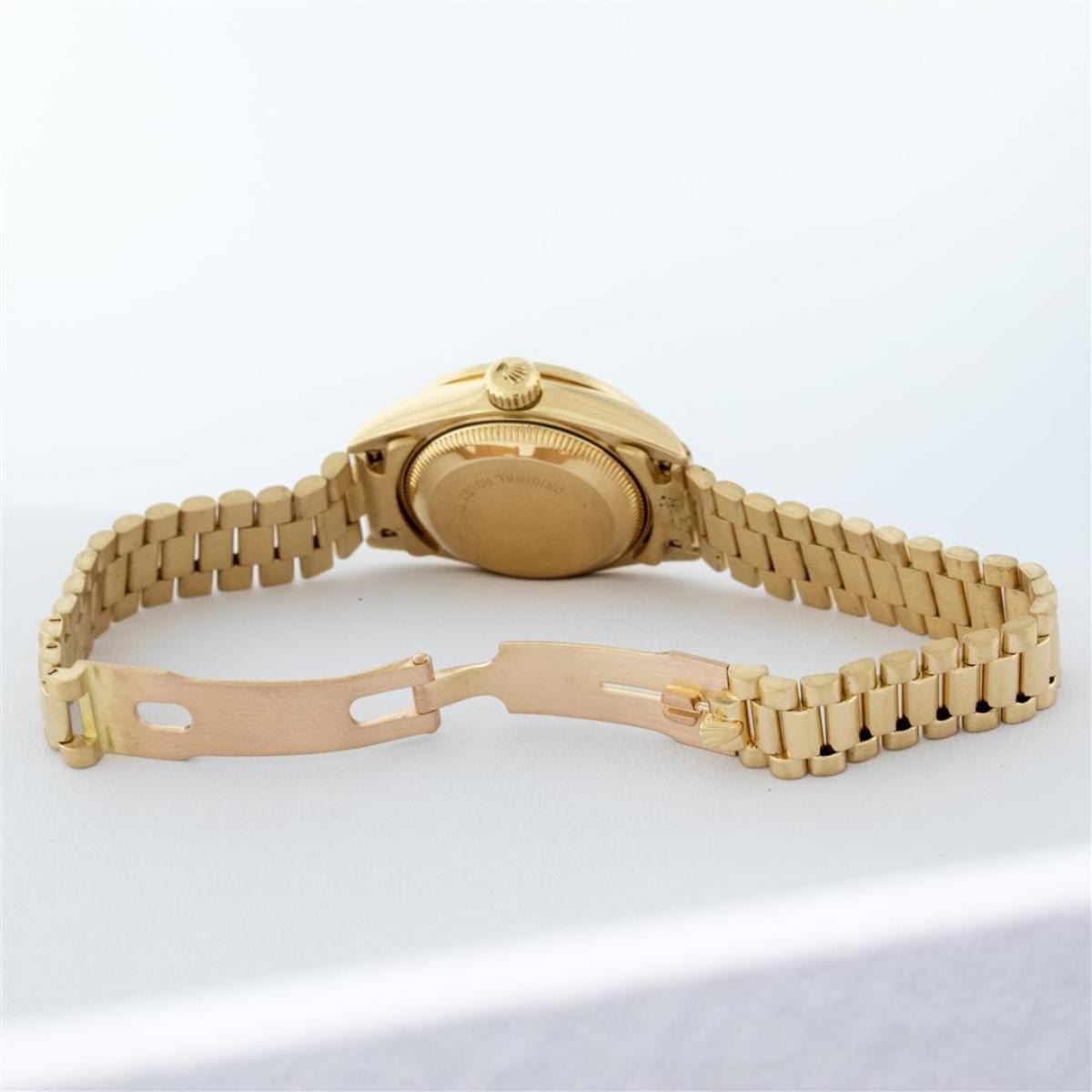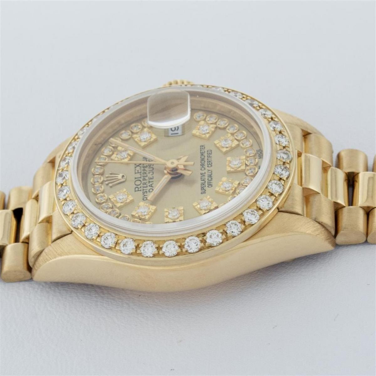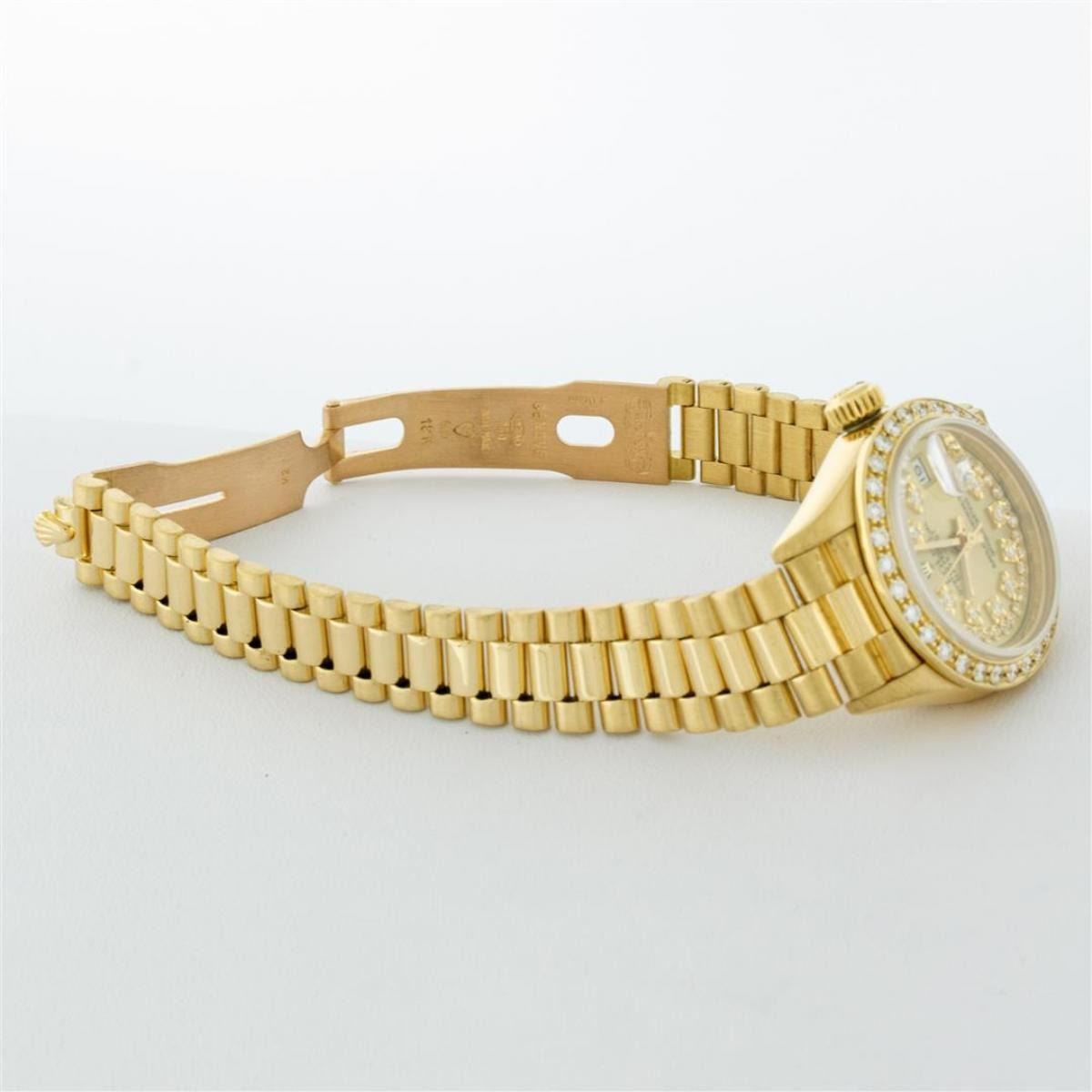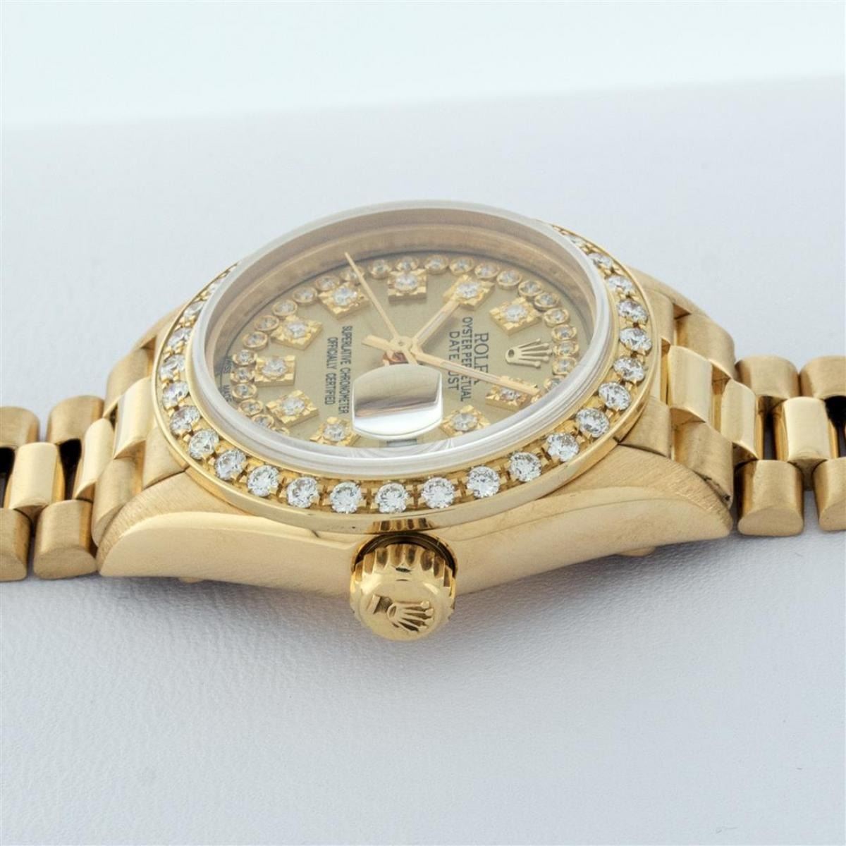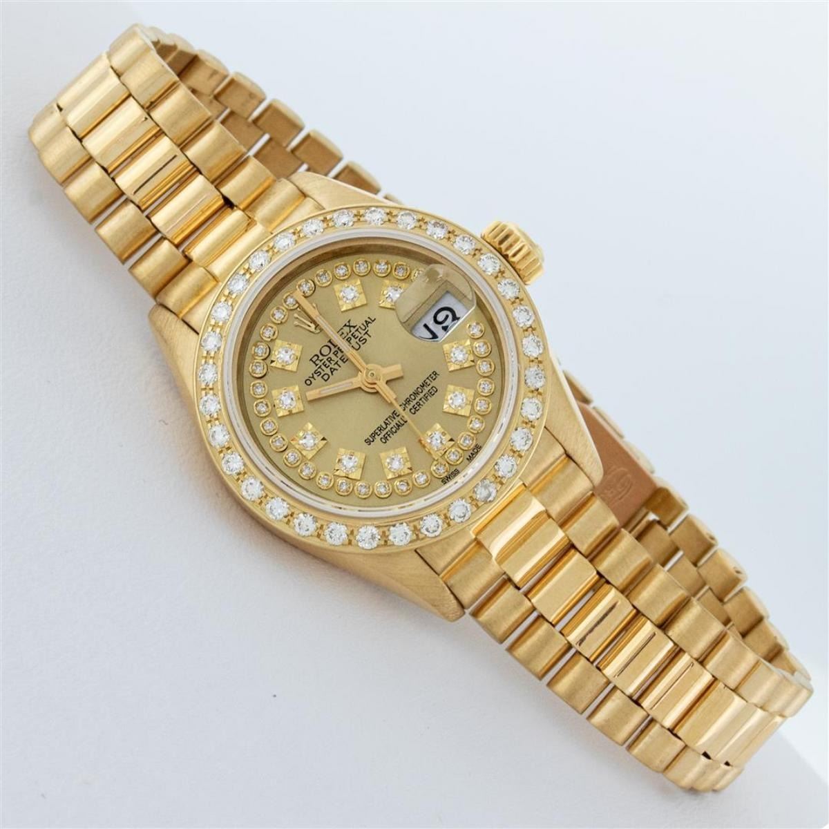 One Ladies Quickset Rolex 18K Yellow Gold President Polished, Serviced & Electronically Tested, 18K Yellow Gold Case: 26mm, 18K Yellow Gold Crown, Custom Bezel: New 18K Yellow Gold Bead Set Diamond Bezel, Diamond Count: 32 Diamonds On Bezel, Total Weight .70 Carat, Clarity: SI-VS, Color: G to H. Custom Crystal: New Scratch Resistant Synthetic Sapphire Cyclops Lens. Movement: Automatic Winding Quickset Movement Caliber 2135. Custom Dial: Refinished Champagne String With Diamond Hour Markers, Color: G to H, Diamond Count: 43 Diamonds On Dial, Clarity: VS. Date Window: 3 O'Clock Position, Model: Quickset Datejust President. Condition: G-6 Extra Fine The Watch Is In Very Good Condition Free Of All Scratches And Dents. Bracelet: 18K Yellow Gold President Band, Bright & Satin Polish. 6.0 Inch Length, Standard President Clasp (Hidden Clasp), With Rolex Logo. This Watch Comes With A Rolex Box & Appraisal.