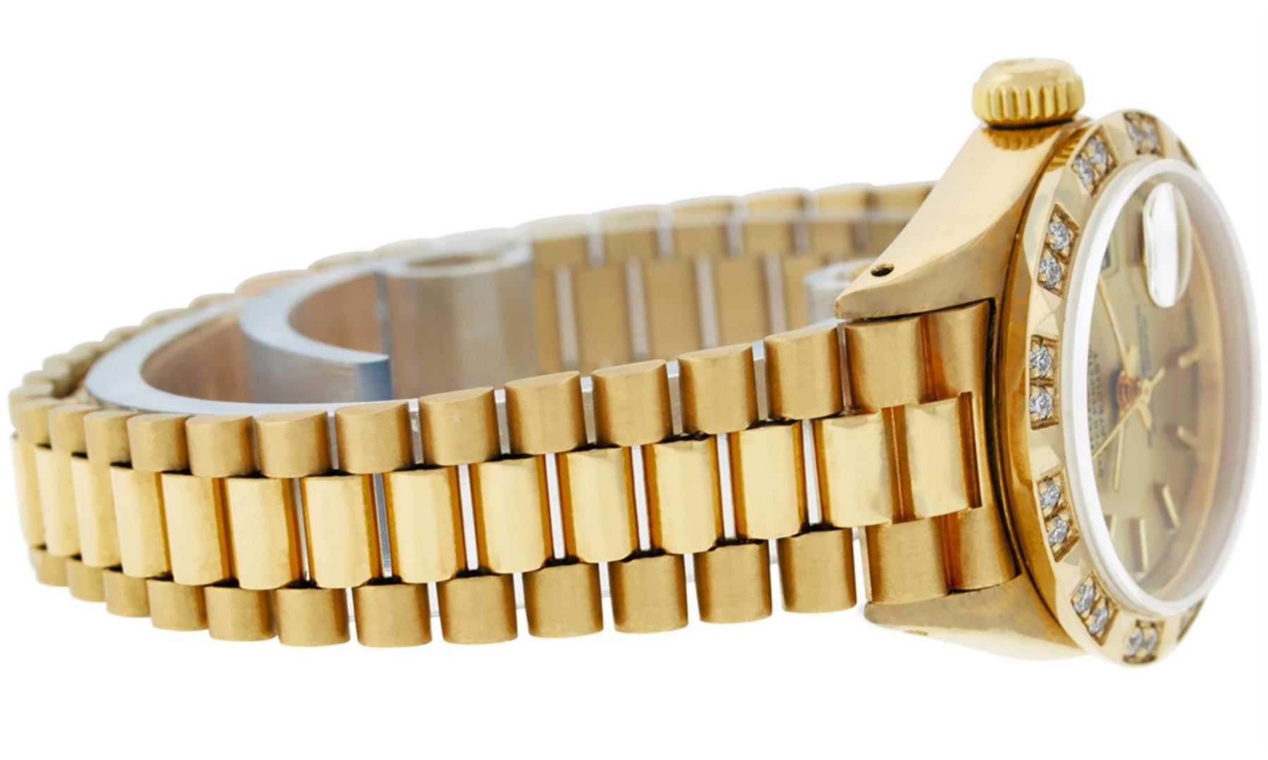 One Ladies 18K Yellow Gold Rolex President Polished, Serviced & Electronically Tested, Yellow Gold Case: 26mm, 18K Yellow Gold Crown, Custom Bezel: New 18K Yellow Gold Pyramid Diamond Bezel, Diamond Count: 24 Diamonds In Bezel. Total Weight .50 Carat, Clarity: SI-VS, Color: G to H. Custom Crystal: New Scratch Resistant Synthetic Sapphire Cyclops Lens. Custom Hands: New Luminescent Hands. Movement: Automatic Winding Movement. Dial: Champagne Index With Dash Track & Lumi Dots. Date Window: 3 O'Clock Position, Model: Datejust President, Condition: G-6 Extra Fine. Bracelet: 18K Yellow Gold President With Hidden Clasp, Bright & Satin Polish. 6.0 Inch Length, Standard President Clasp (Hidden Clasp), With Rolex Logo. Watch Has Been Serviced And Polished It Is Free Of All Scratches And Dents. This Watch Has Been Serviced Time Tested And Is In Excellent Condition It Is Free Of All Scratches And Dents.
