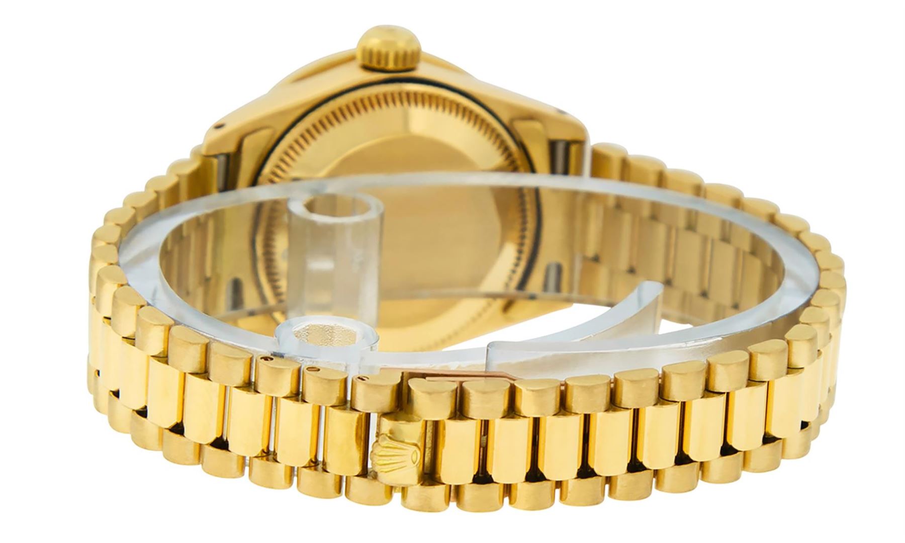 One Ladies Rolex President Polished, Serviced & Electronically Tested, Yellow Gold Case With Diamond Lugs: 26mm G to H In Color, SI1, Yellow Gold Crown, Custom Diamond Lugs: 24 Diamonds On Lugs, Clarity: SI-VS, Color: G to H, Clarity SI-VS. Custom Bezel: 18K Yellow Gold Emerald Beadset Diamond Bezel, Diamond + Gem Count: 36 Diamonds + 4 Emeralds, Total Weight .70 Carat, Clarity: SI-VS, Color: G to H. Custom Crystal: New Scratch Resistant Synthetic Sapphire Cyclops Lens. Custom Hands: New Luminescent Hands. Movement: Automatic Winding Movement. Custom Dial: Refinished Black With Diamond Hour Markers, Stone Count: 10 Diamonds On Dial, Color: G To H. Clarity: SI-VS. Date Window: 3 O'Clock Position, Model: Datejust. Condition: G-6 Extra Fine. Bracelet: 18K Yellow Gold President Band, Bright & Satin Polish. 6.0 Inch Length, Standard President Clasp (Hidden Clasp), With Rolex Logo. This Watch Comes With A Rolex Box And Appraisal.This Watch Has Been Serviced Time Tested And Is In Excellent Condition It Is Free Of All Scratches And Dents.