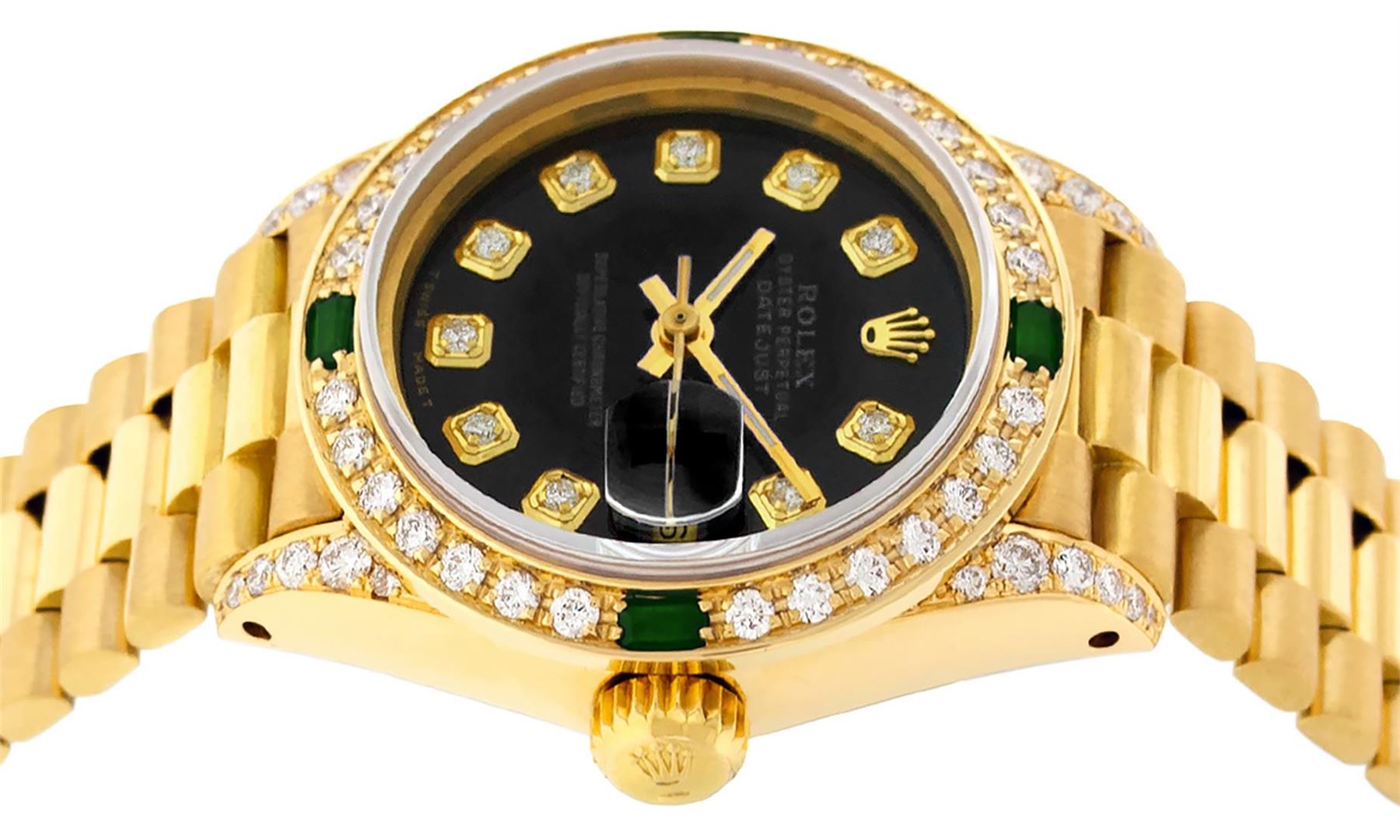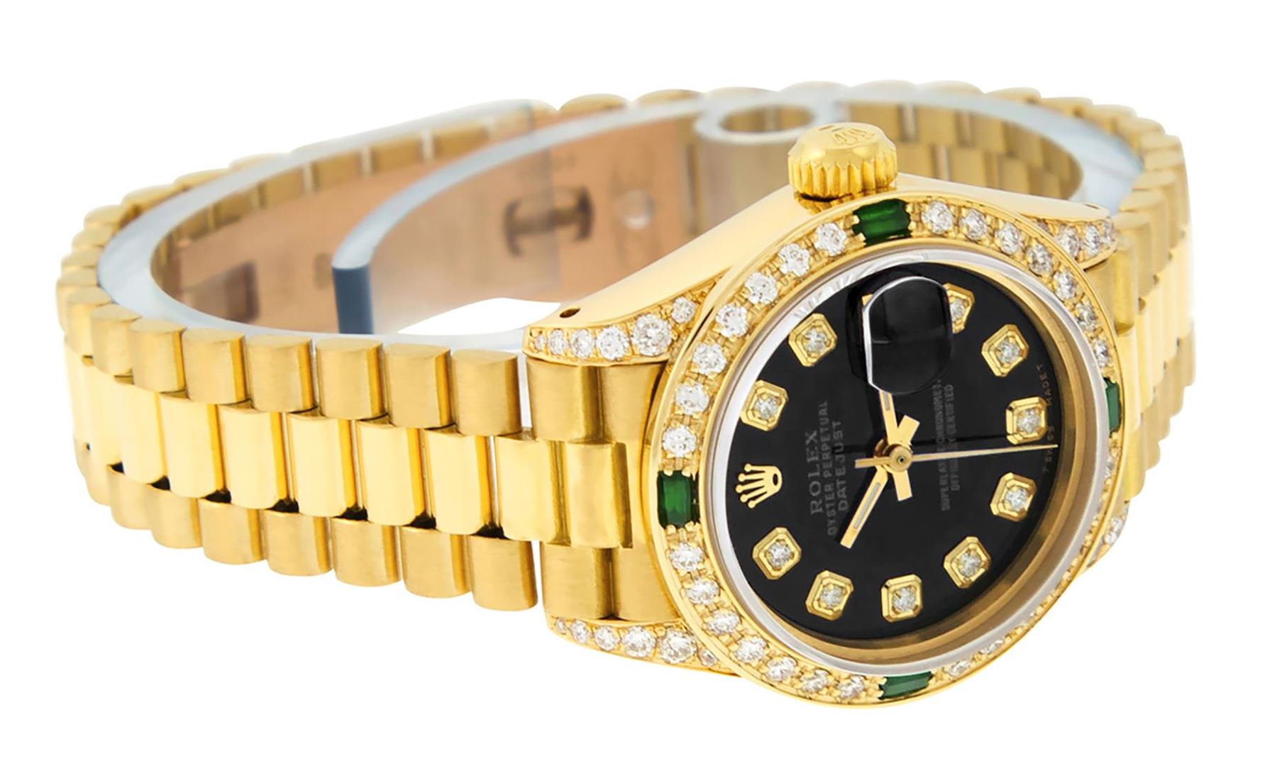One Ladies Rolex President Polished, Serviced & Electronically Tested, Yellow Gold Case With Diamond Lugs: 26mm G to H In Color, SI1, Yellow Gold Crown, Custom Diamond Lugs: 24 Diamonds On Lugs, Clarity: SI-VS, Color: G to H, Clarity SI-VS. Custom Bezel: 18K Yellow Gold Emerald Beadset Diamond Bezel, Diamond + Gem Count: 36 Diamonds + 4 Emeralds, Total Weight .70 Carat, Clarity: SI-VS, Color: G to H. Custom Crystal: New Scratch Resistant Synthetic Sapphire Cyclops Lens. Custom Hands: New Luminescent Hands. Movement: Automatic Winding Movement. Custom Dial: Refinished Black With Diamond Hour Markers, Stone Count: 10 Diamonds On Dial, Color: G To H. Clarity: SI-VS. Date Window: 3 O'Clock Position, Model: Datejust. Condition: G-6 Extra Fine. Bracelet: 18K Yellow Gold President Band, Bright & Satin Polish. 6.0 Inch Length, Standard President Clasp (Hidden Clasp), With Rolex Logo. This Watch Comes With A Rolex Box And Appraisal.This Watch Has Been Serviced Time Tested And Is In Excellent Condition It Is Free Of All Scratches And Dents.