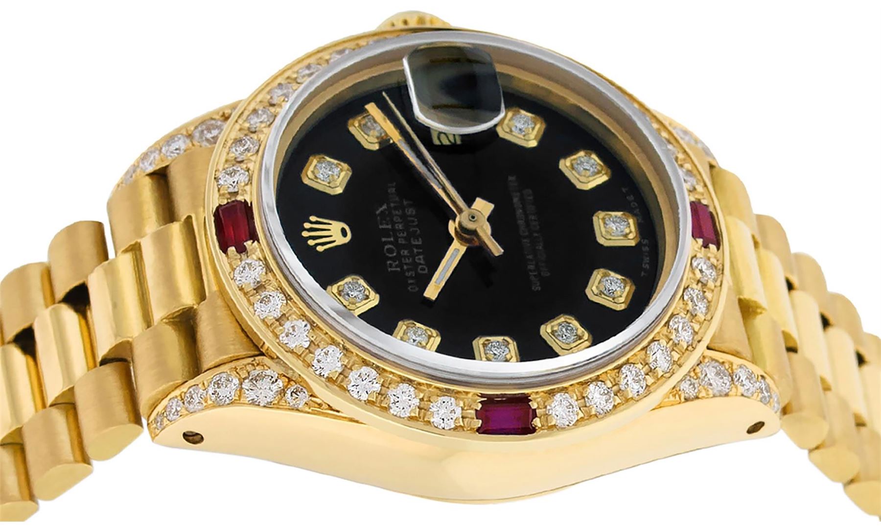 One Ladies Rolex President Polished, Serviced & Electronically Tested, Yellow Gold Case With Diamond Lugs: 26mm G to H In Color, SI1, Yellow Gold Crown, Custom Diamond Lugs: 24 Diamonds On Lugs, Clarity: SI-VS, Color: G to H, Clarity SI-VS. Custom Bezel: 18K Yellow Gold Ruby Beadset Diamond Bezel, Diamond + Gem Count: 36 Diamonds + 4 Rubies, Total Weight .70 Carat, Clarity: SI-VS, Color: G to H. Custom Crystal: New Scratch Resistant Synthetic Sapphire Cyclops Lens. Custom Hands: New Luminescent Hands. Movement: Automatic Winding Movement Caliber 2030. Custom Dial: Refinished Black With Diamond Hour Markers, Diamond Count: 10 Diamonds In Dial, Color: G To H. Clarity: SI-VS. Date Window: 3 O'Clock Position, Model: Datejust, Condition: G-6 Extra Fine. Bracelet: 18K Yellow Gold President Band, Bright & Satin Polish. 6.0 Inch Length, Standard President Clasp (Hidden Clasp), With Rolex Logo. This Watch Comes With A Rolex Box. This Watch Has Been Serviced Time Tested And Is In Excellent Condition It Is Free Of All Scratches And Dents.