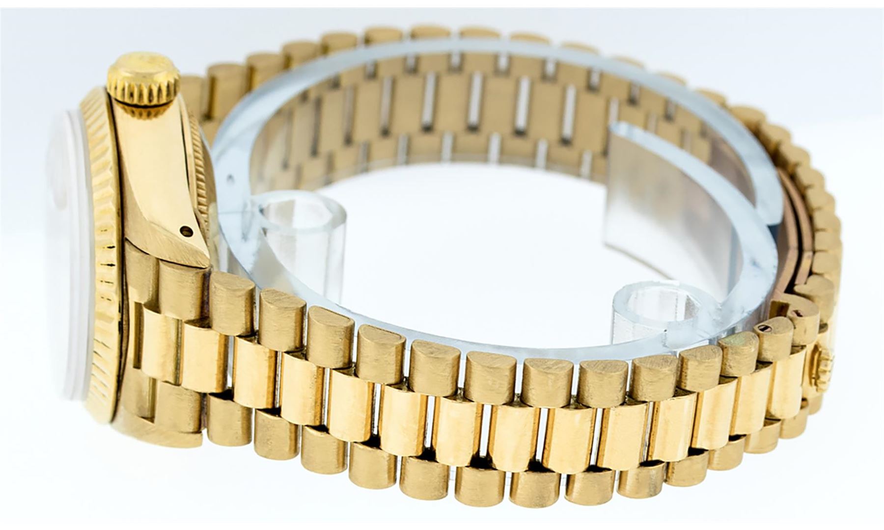 One Ladies Rolex 18K Yellow Gold President Polished, Serviced & Electronically Tested, 18K Yellow Gold Case: 26mm, 18K Yellow Gold Crown, Bezel: 18K Yellow Gold Fluted Bezel. Custom Crystal: New Acrylic Cyclops Lens. Movement: Custom Hands: New Luminescent Hands. Automatic Winding Movement Caliber 2030. Custom Dial: Refinished Blue Vignette Single Cut Diamond Dial, Color: G to H, Diamond Count: 10 Diamonds In Dial, Clarity: SI-VS. Date Window: 3 O'Clock Position, Model: Datejust. Condition: G-6 Extra Fine The Watch Is In Very Good Condition Free Of All Scratches And Dents. Bracelet: 18K Yellow Gold President Band, Bright & Satin Polish. 6.0 Inch Length, Standard President Clasp (Hidden Clasp), With Rolex Logo. This Watch Comes With A Rolex Box & Appraisal.
