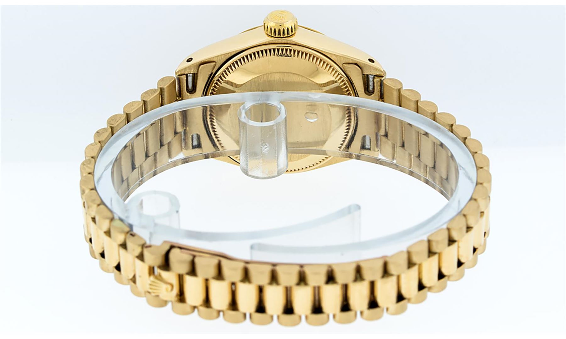 One Ladies 18K Yellow Gold Rolex President Polished, Serviced & Electronically Tested, Yellow Gold Case: 26mm, 18K Yellow Gold Crown, Custom Bezel: New 18K Yellow Gold Ruby Beadset Diamond Bezel, Diamond + Stone Count: 28 Diamonds + 4 Rubies. Total Weight .70 Carat, Clarity: SI-VS, Color: G to H. Custom Crystal: New Scratch Resistant Synthetic Sapphire Cyclops Lens. Custom Hands: New Luminescent Hands. Movement: Automatic Winding Movement Caliber 2030. Custom Dial: Refinished Champagne Diamond Dial, Stone Count: 10 Diamonds In Dial. Date Window: 3 O'Clock Position, Model: Datejust President, Condition: G-6 Extra Fine. Bracelet: 18K Yellow Gold President With Hidden Clasp, Bright & Satin Polish. 6.0 Inch Length, Standard President Clasp (Hidden Clasp), With Rolex Logo. Watch Has Been Serviced And Polished It Is Free Of All Scratches And Dents. This Watch Comes With A Rolex Box.