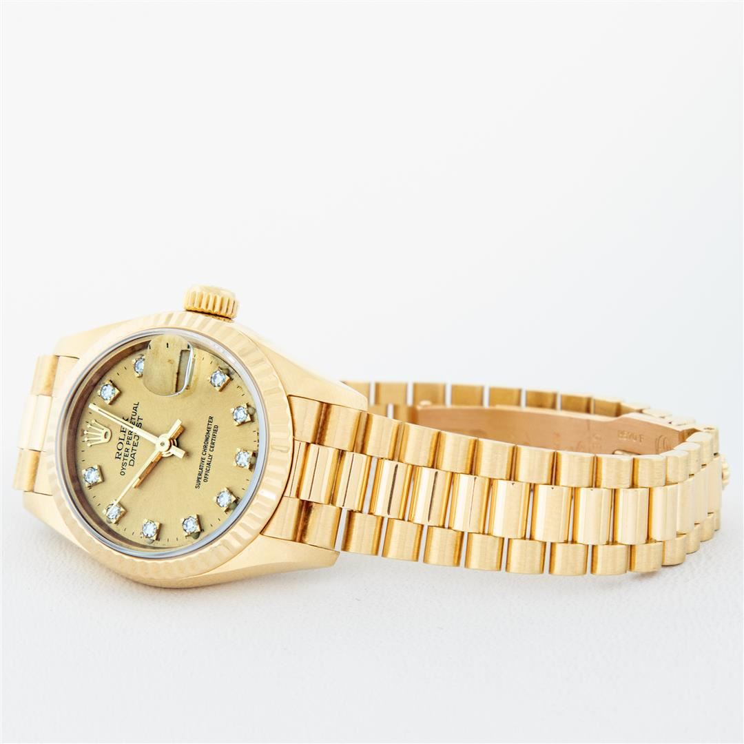 One Ladies Pre Owned Rolex 18K Yellow Gold President Polished, Serviced & Electronically Tested, Rolex 18K Yellow Gold Case: 26mm, Rolex 18K Yellow Gold Crown, Rolex Bezel: 18K Rolex Yellow Gold Fluted Bezel, Crystal: Sapphire With Cyclops Lens. Hands: Luminescent Hands. Rolex Movement: Automatic Winding Quickset Movement. Rolex Dial: Factory Rolex Champagne Diamond Dial, Diamond Count: 10 Diamonds In Dial, Clarity: VVS. Date Window: 3 O'Clock Position, Model: Datejust. Condition: G-6 Extra Fine. Rolex Bracelet: 18K Yellow Gold President Band, Bright & Satin Polish. 6.0 Inch Length, Standard President Clasp (Hidden Clasp), With Rolex Logo. This Watch Has Been Serviced Time Tested And Is In Excellent Condition It Is Free Of All Scratches And Dents.