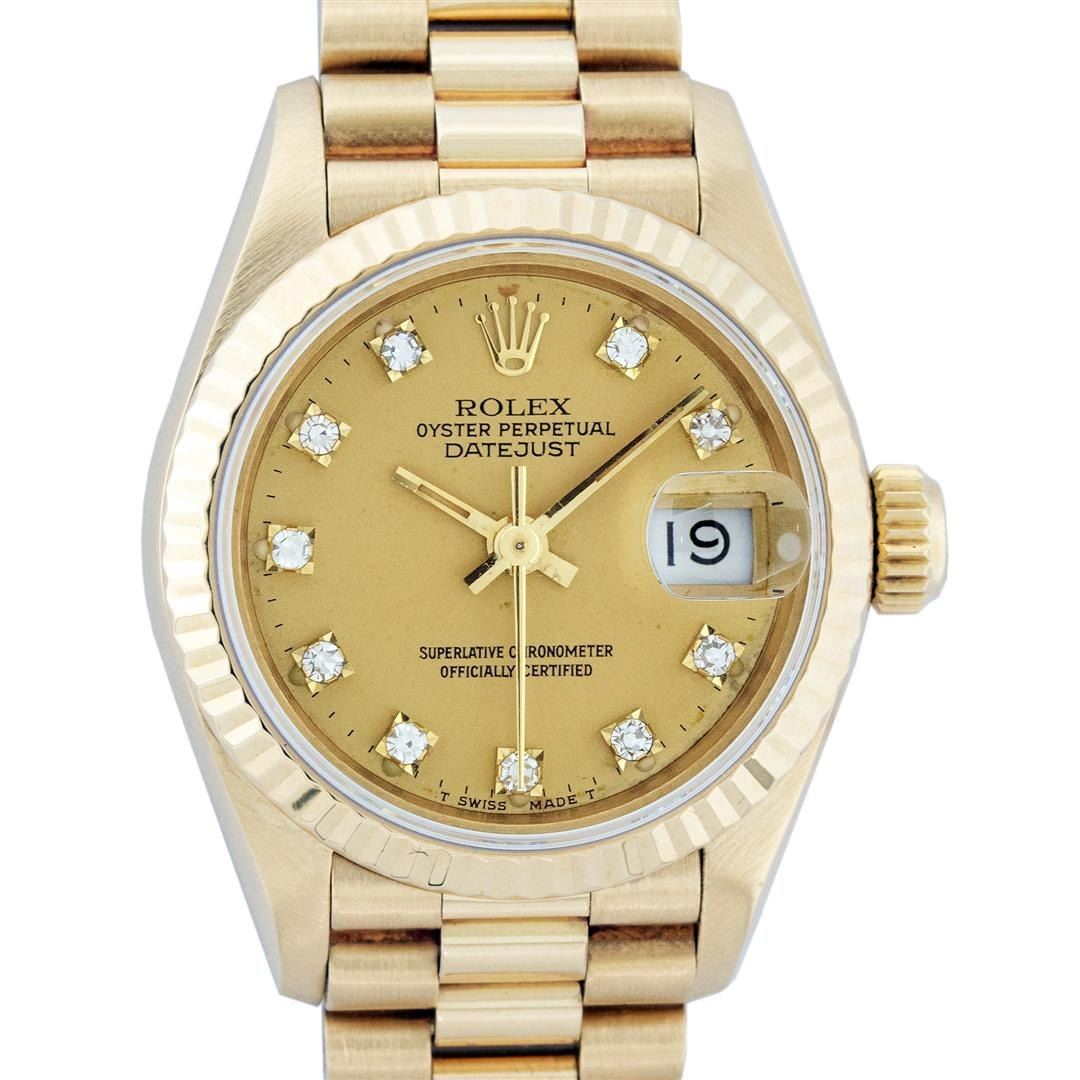 One Ladies Pre Owned Rolex 18K Yellow Gold President Polished, Serviced & Electronically Tested, Rolex 18K Yellow Gold Case: 26mm, Rolex 18K Yellow Gold Crown, Rolex Bezel: 18K Rolex Yellow Gold Fluted Bezel, Crystal: Sapphire With Cyclops Lens. Hands: Luminescent Hands. Rolex Movement: Automatic Winding Quickset Movement. Rolex Dial: Factory Rolex Champagne Diamond Dial, Diamond Count: 10 Diamonds In Dial, Clarity: VVS. Date Window: 3 O'Clock Position, Model: Datejust. Condition: G-6 Extra Fine. Rolex Bracelet: 18K Yellow Gold President Band, Bright & Satin Polish. 6.0 Inch Length, Standard President Clasp (Hidden Clasp), With Rolex Logo. This Watch Has Been Serviced Time Tested And Is In Excellent Condition It Is Free Of All Scratches And Dents.