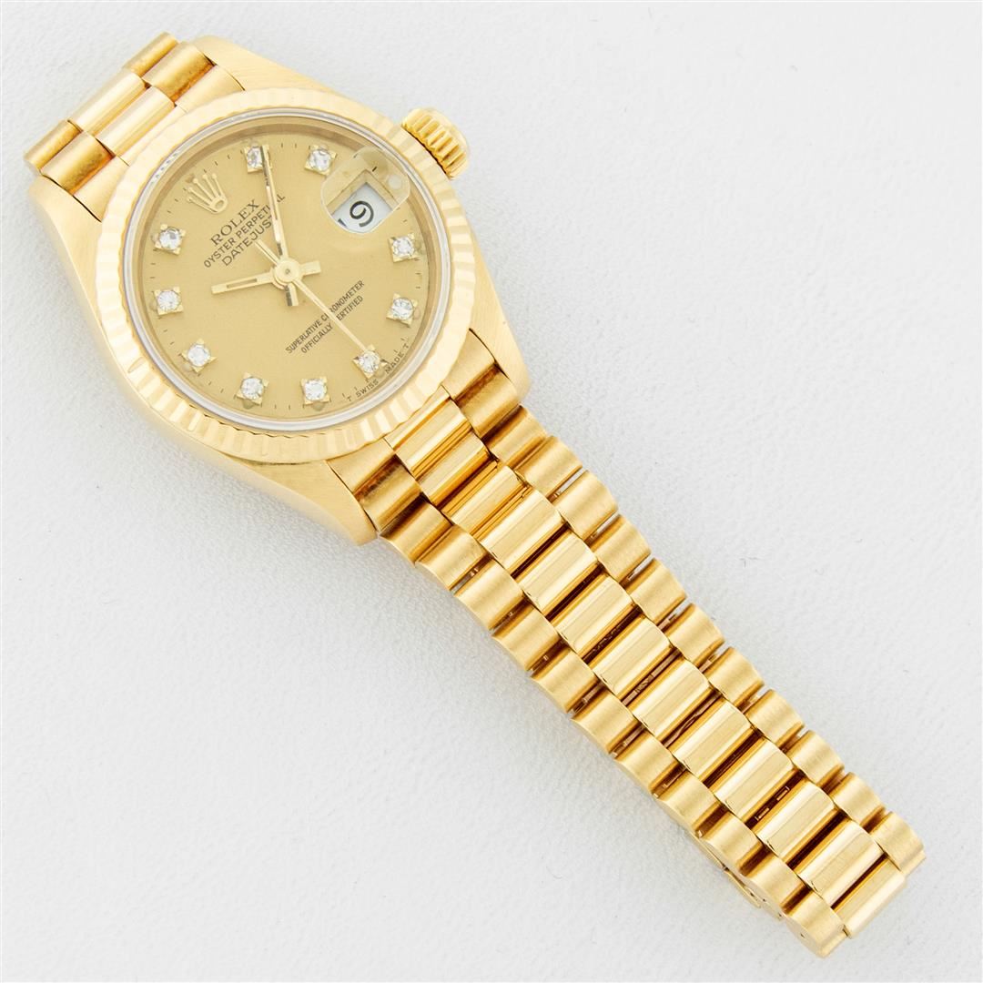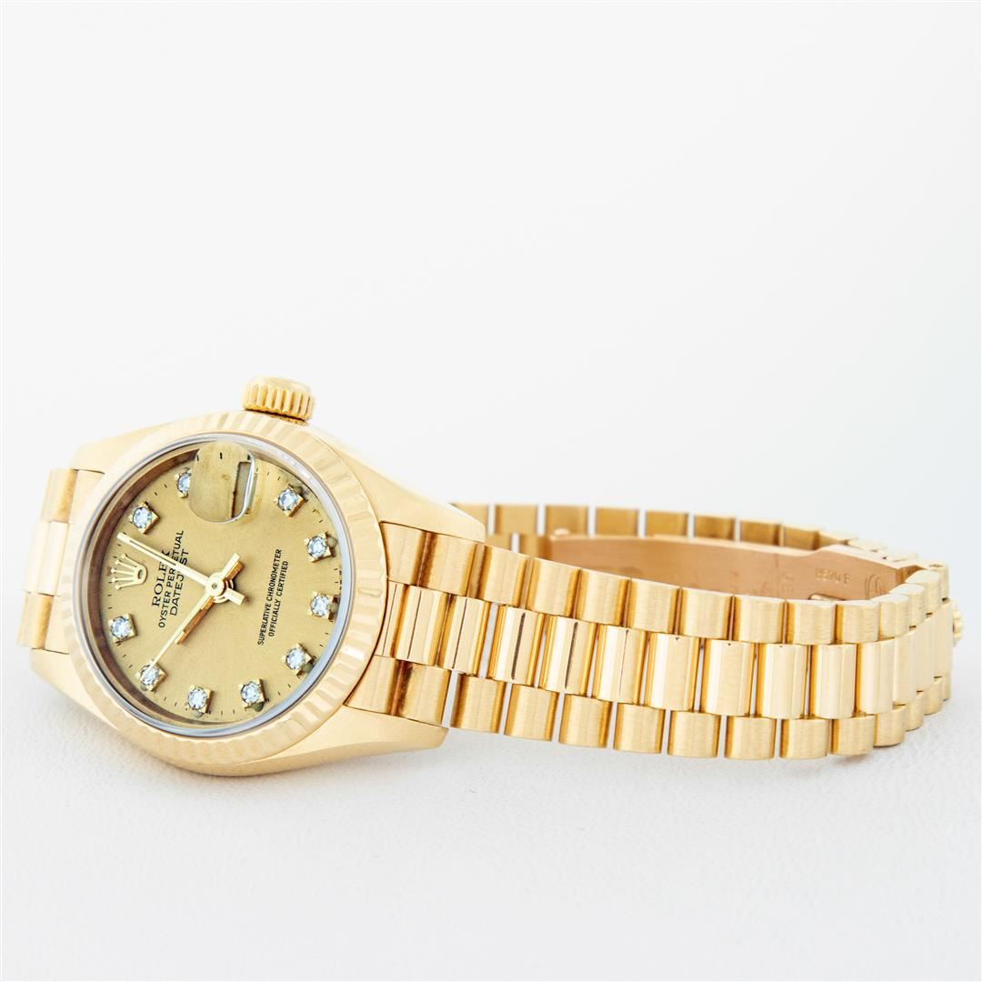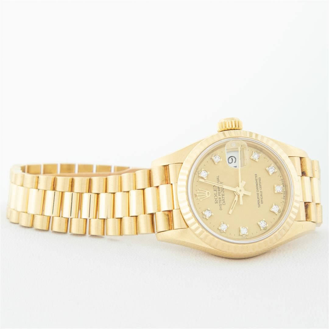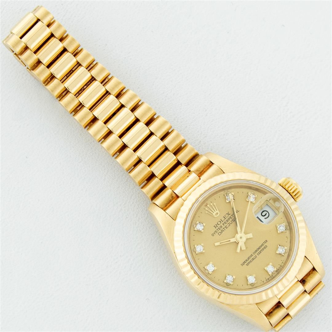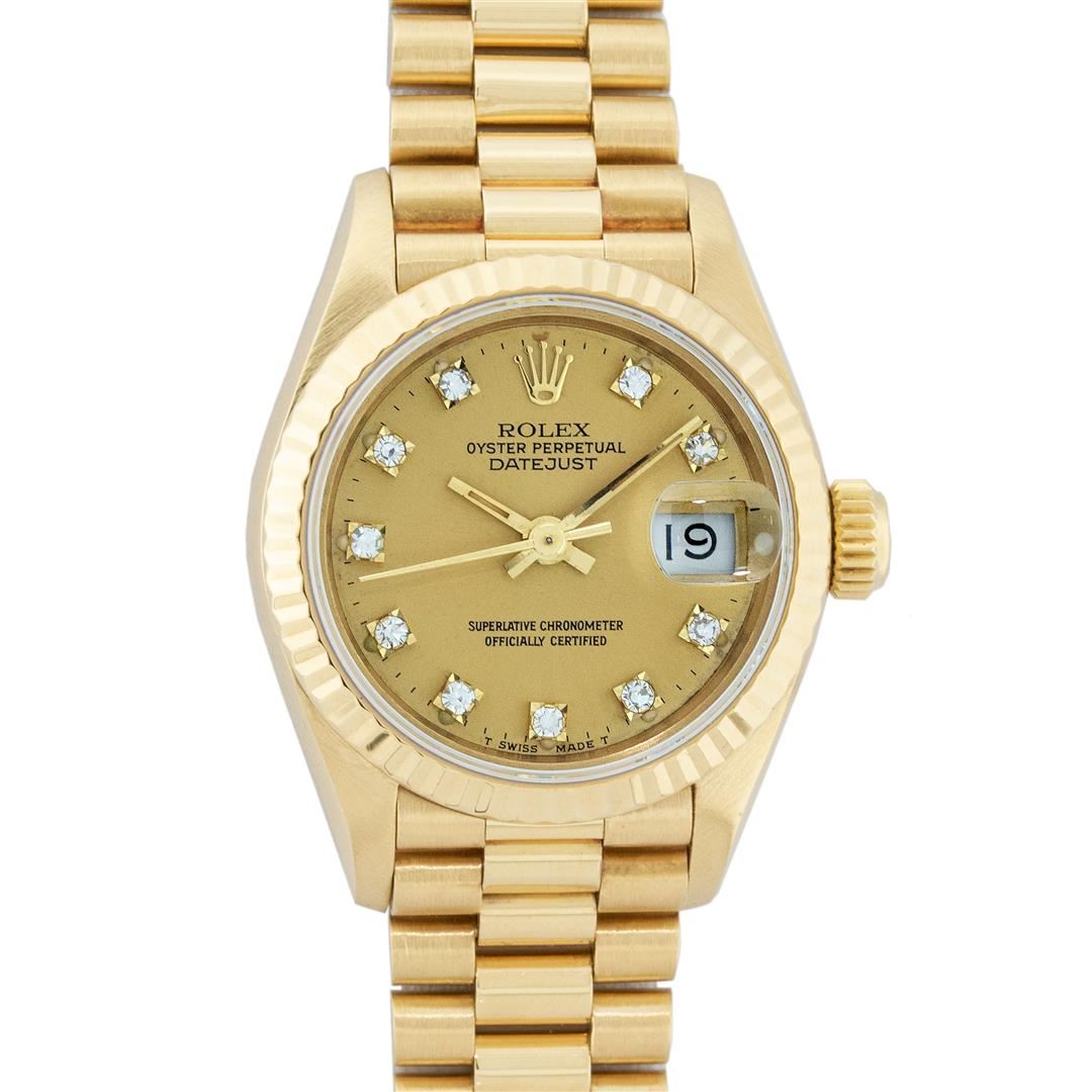 One Ladies Pre Owned Rolex 18K Yellow Gold President Polished, Serviced & Electronically Tested, Rolex 18K Yellow Gold Case: 26mm, Rolex 18K Yellow Gold Crown, Rolex Bezel: 18K Rolex Yellow Gold Fluted Bezel, Crystal: Sapphire With Cyclops Lens. Hands: Luminescent Hands. Rolex Movement: Automatic Winding Quickset Movement. Rolex Dial: Factory Rolex Champagne Diamond Dial, Diamond Count: 10 Diamonds In Dial, Clarity: VVS. Date Window: 3 O'Clock Position, Model: Datejust. Condition: G-6 Extra Fine The Watch Is In Very Good Condition Free Of All Scratches And Dents. Rolex Bracelet: 18K Yellow Gold President Band, Bright & Satin Polish. 6.0 Inch Length, Standard President Clasp (Hidden Clasp), With Rolex Logo. This Watch Has Been Serviced Time Tested And Is In Excellent Condition It Is Free Of All Scratches And Dents.