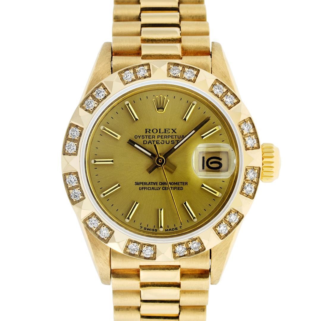 One Ladies Pre Owned 18K Yellow Gold Rolex President Polished, Serviced & Electronically Tested, Rolex Yellow Gold Case: 26mm, Rolex 18K Yellow Gold Crown, Custom Bezel: New 18K Yellow Gold Pyramid Bezel With Genuine Diamonds, Diamond Count: 24 Diamonds In Bezel. Total Weight.50 Carat, Clarity: SI-VS, Color: G to H. Custom Crystal: New Sapphire With Magnified Date Window. Custom Hands: New Luminescent Hands. Rolex Movement: Automatic Winding Movement. Rolex Dial: Champagne Index With Dash Track & Lumi Dots. Date Window: 3 O'Clock Position, Model: President, Condition: G-6 Extra Fine. Rolex Bracelet: 18K Yellow Gold President With Hidden Clasp, Bright & Satin Polish. 6.0 Inch Length, Standard President Clasp (Hidden Clasp), With Rolex Logo. This Watch Has Been Serviced Time Tested And Is In Excellent Condition It Is Free Of All Scratches And Dents.
