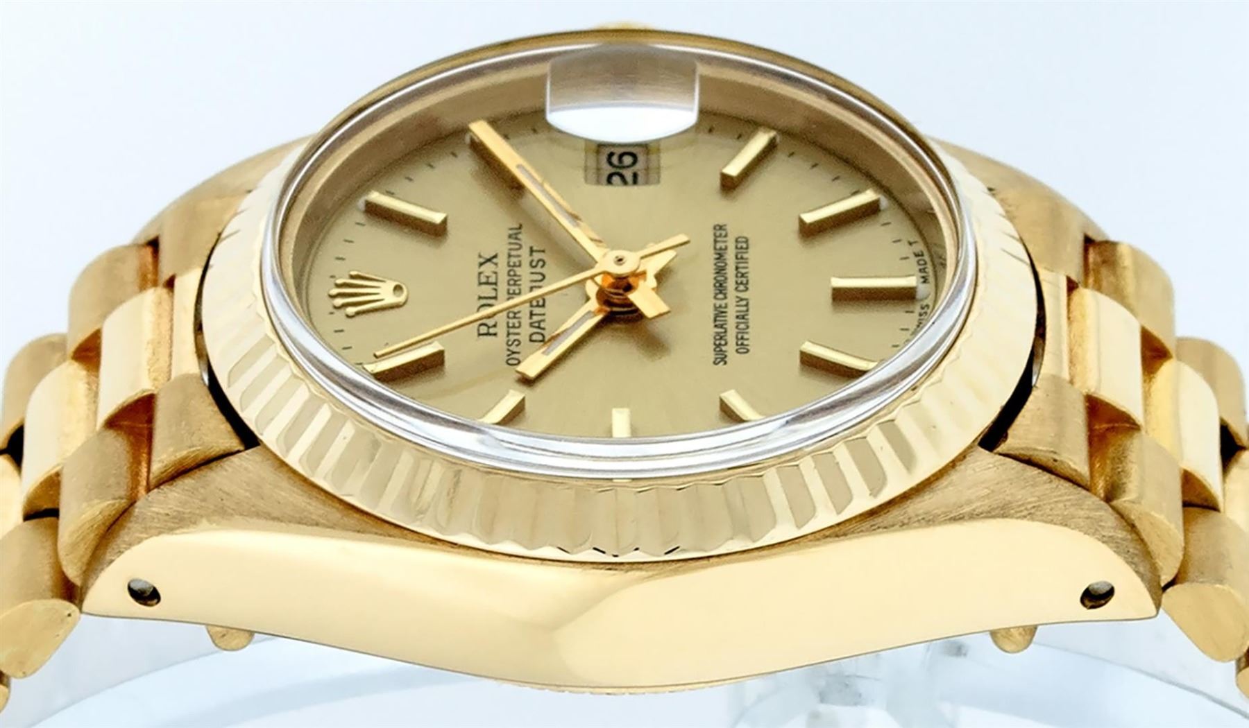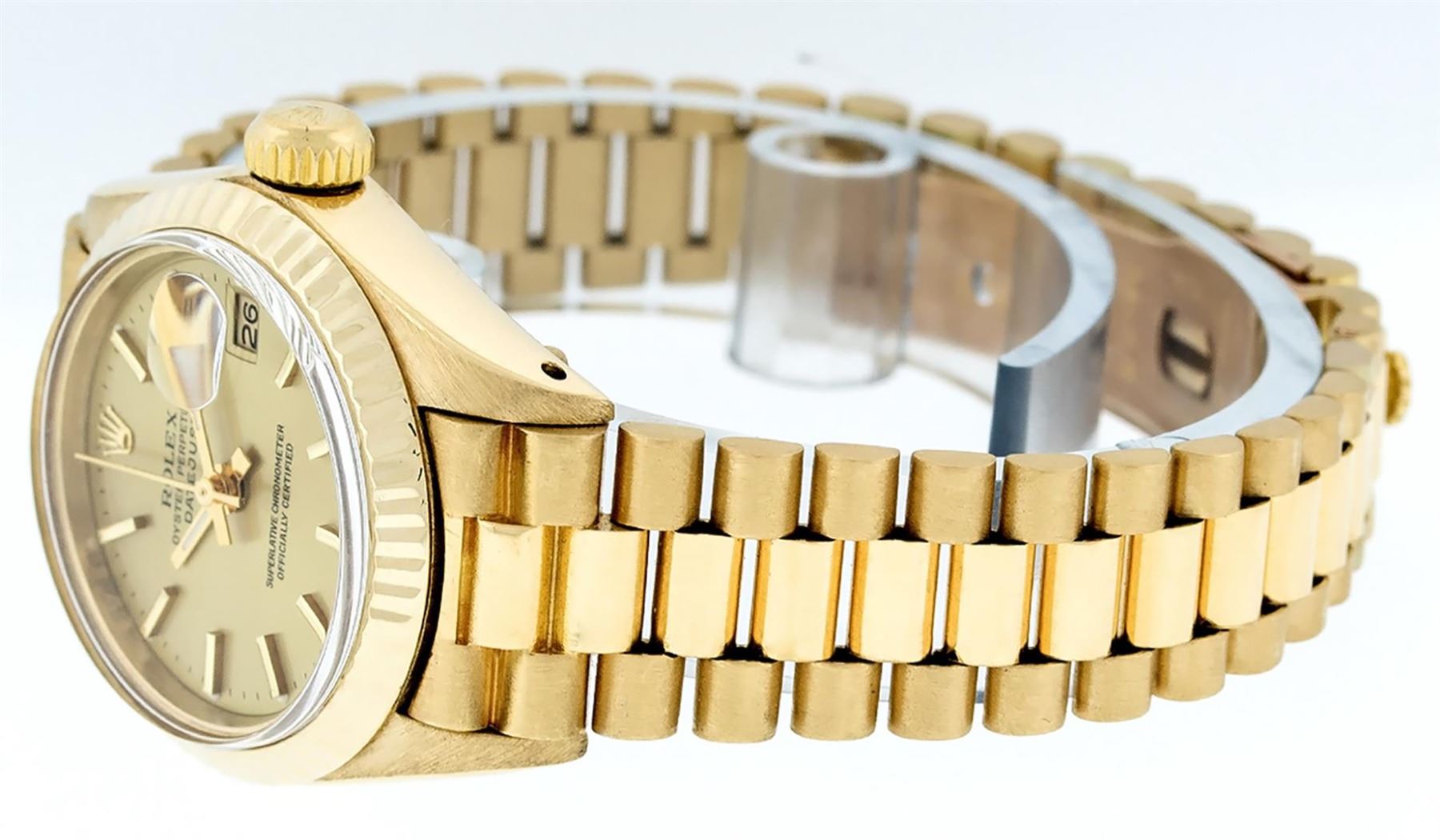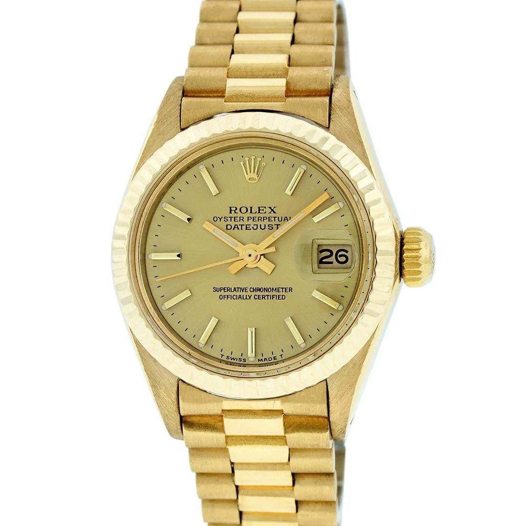 One Ladies Pre Owned Rolex 18K Yellow Gold President Polished, Serviced & Electronically Tested, Rolex 18K Yellow Gold Case: 26mm, Rolex 18K Yellow Gold Crown, Rolex Bezel: 18K Yellow Gold Fluted Bezel. Custom Crystal: New Acrylic With Magnified Date Window. Custom Hands: New Luminescent Hands. Rolex Movement: Automatic Winding Movement. Rolex Dial: Champagne Index Dial. Date Window: 3 O'Clock Position, Model: President. Condition: G-6 Extra Fine. Rolex Bracelet: 18K Yellow Gold President Band, Bright & Satin Polish. 6.0 Inch Length, Standard President Clasp (Hidden Clasp), With Rolex Logo. Watch Has Been Serviced And Polished It Is Free Of All Scratches And Dents.
