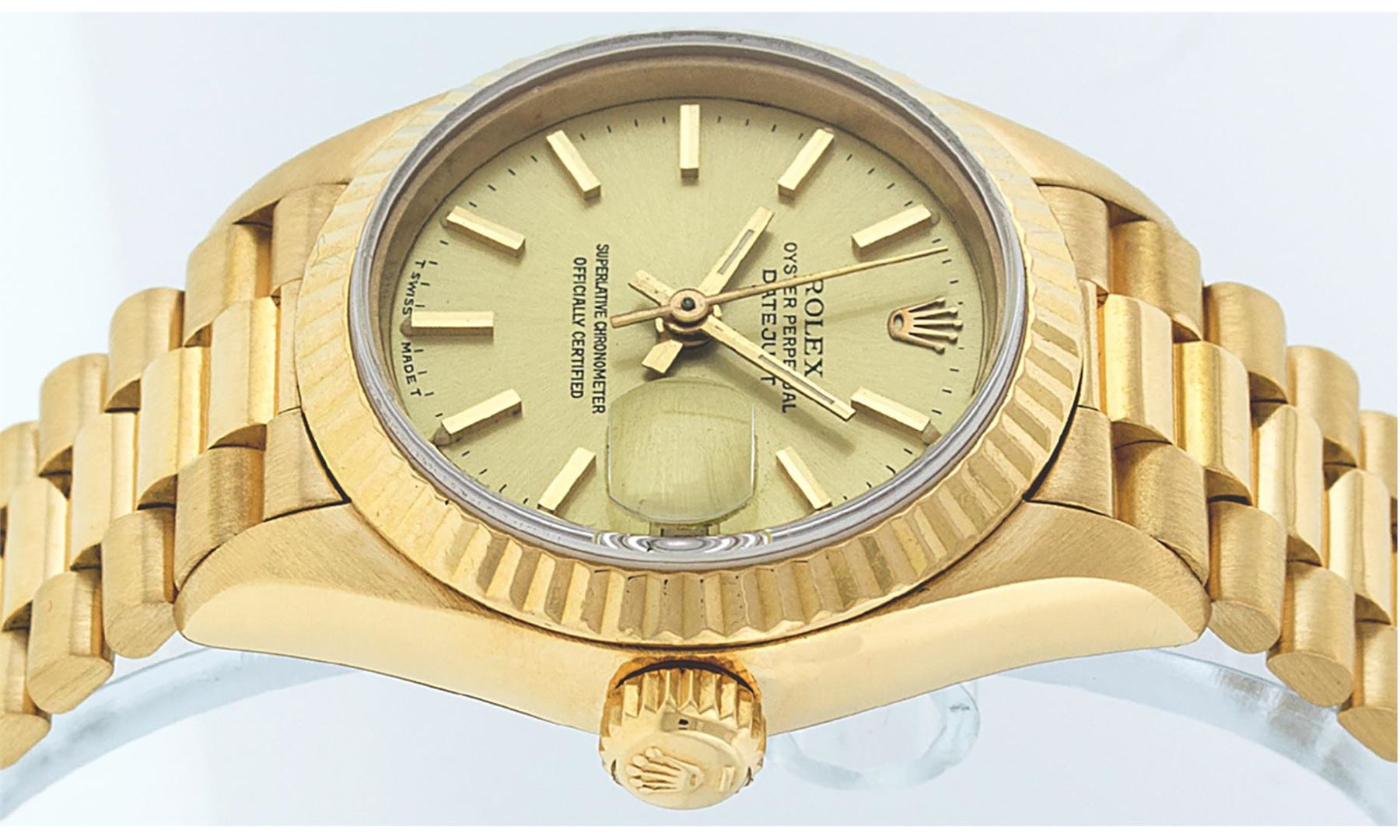 One Ladies Pre Owned Quickset Rolex 18K Yellow Gold President Polished, Serviced & Electronically Tested, Rolex 18K Yellow Gold Case: 26mm, Rolex 18K Yellow Gold Crown, Rolex Bezel: 18K Yellow Gold Fluted Bezel. Rolex Crystal: Sapphire With Cyclops Lens. Rolex Hands: Luminescent Hands. Rolex Movement: Automatic Winding Quickset Movement 2130. Rolex Dial: Champagne Index Dial With Dash Track & Lumi Dots. Date Window: 3 O'Clock Position, Model: President. Condition: G-6 Extra Fine. Rolex Bracelet: 18K Yellow Gold President Band, Bright & Satin Polish. 6.0 Inch Length, Standard President Clasp (Hidden Clasp), With Rolex Logo. The Watch Is In Very Good Condition Free Of All Scratches And Dents.