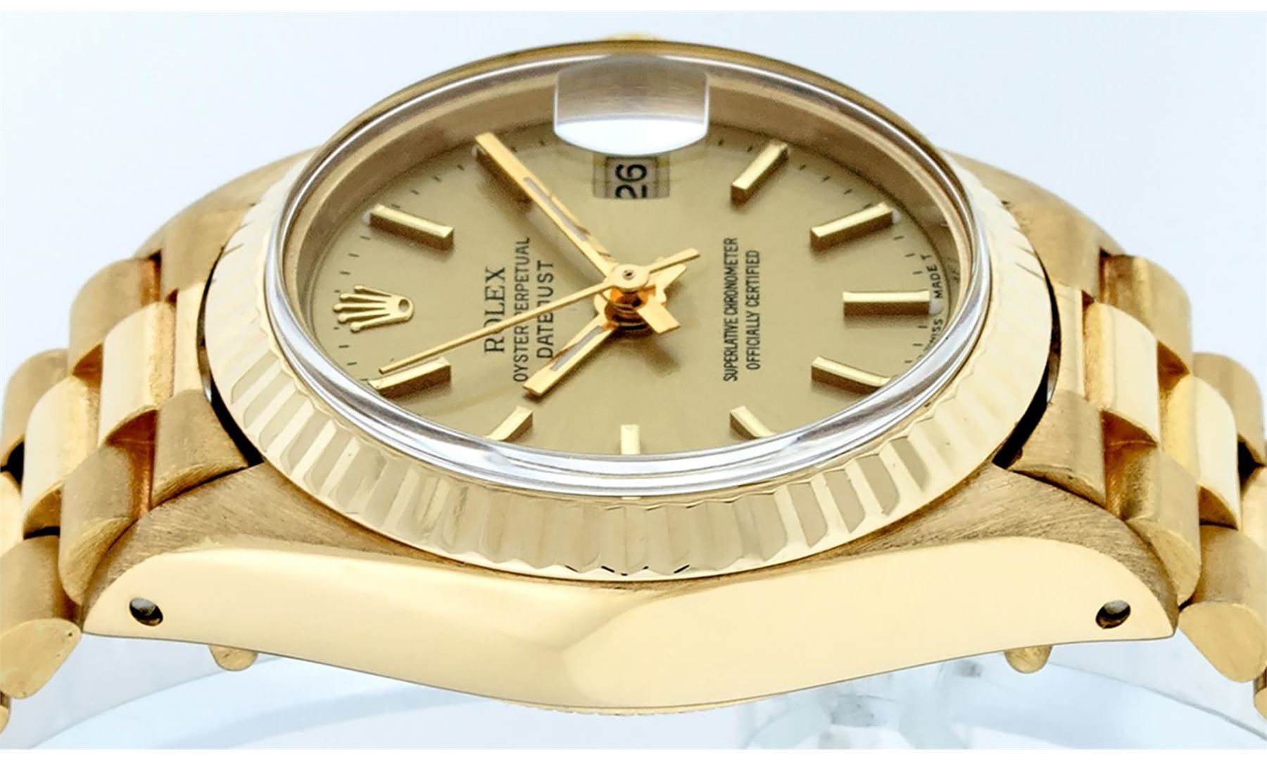 One Ladies Pre Owned Rolex 18K Yellow Gold President Polished, Serviced & Electronically Tested, Rolex 18K Yellow Gold Case: 26mm, Rolex 18K Yellow Gold Crown, Rolex Bezel: 18K Yellow Gold Fluted Bezel. Custom Crystal: New Acrylic With Magnified Date Window. Custom Hands: New Luminescent Hands. Rolex Movement: Automatic Winding Movement. Rolex Dial: Champagne Index Dial. Date Window: 3 O'Clock Position, Model: President. Condition: G-6 Extra Fine. Rolex Bracelet: 18K Yellow Gold President Band, Bright & Satin Polish. 6.0 Inch Length, Standard President Clasp (Hidden Clasp), With Rolex Logo. Watch Has Been Serviced And Polished It Is Free Of All Scratches And Dents.