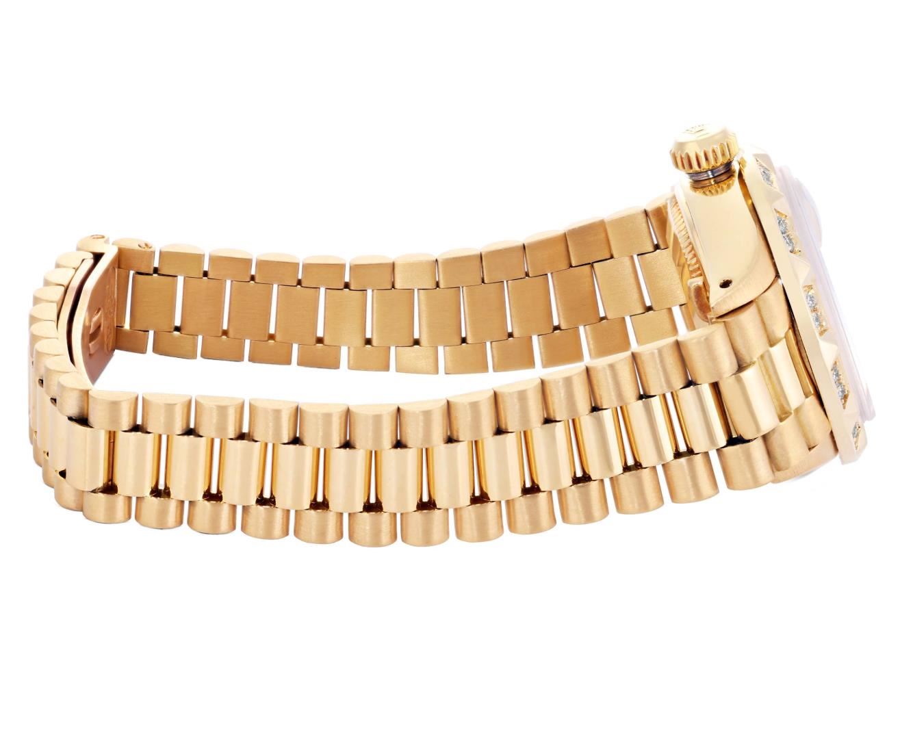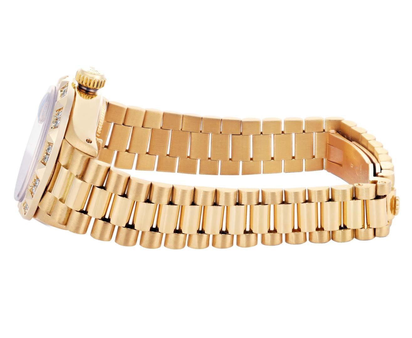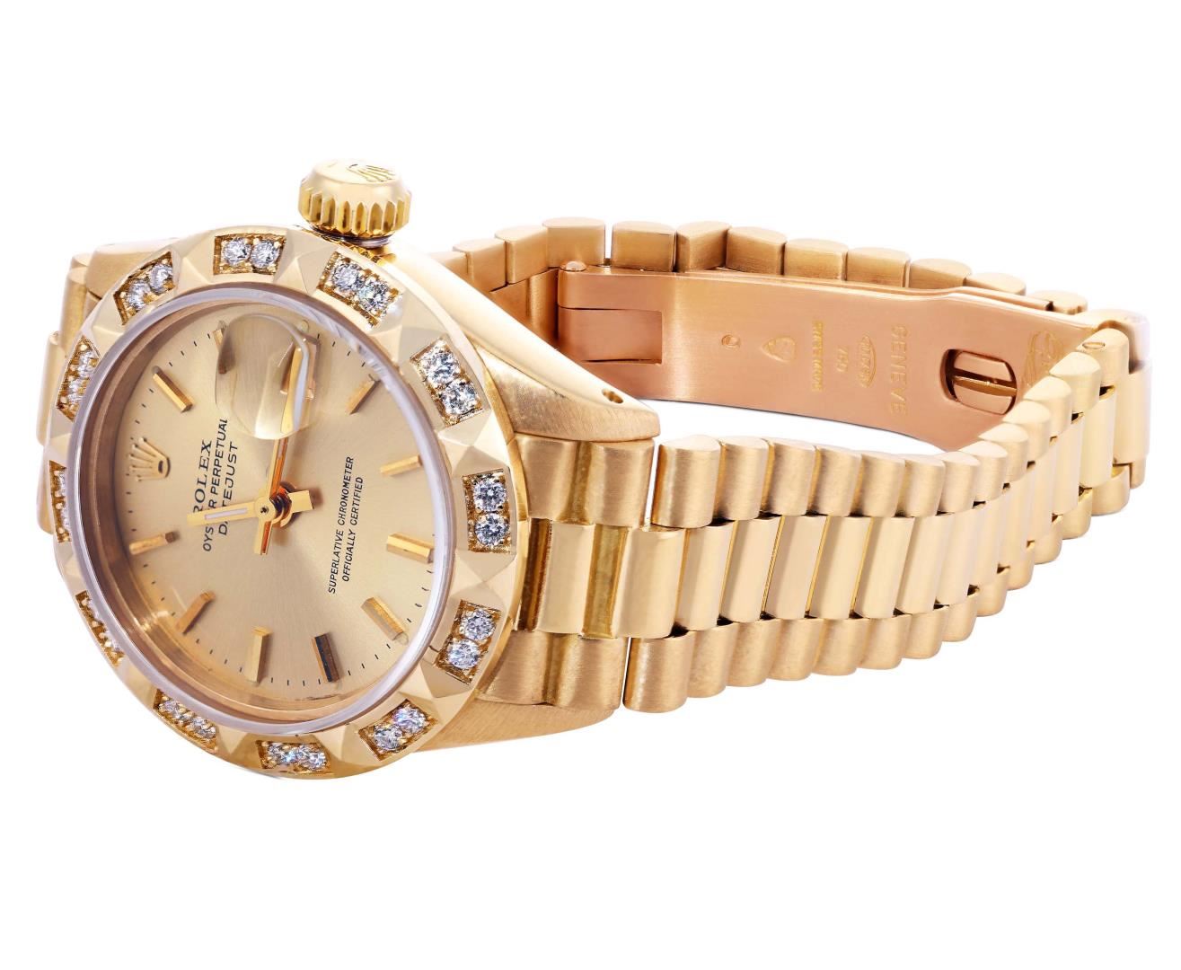 One Ladies Pre Owned Quickset Rolex 18K Yellow Gold President Polished, Serviced & Electronically Tested, Rolex 18K Yellow Gold Case: 26mm, Rolex 18K Yellow Gold Crown, Custom Bezel: New Pyramid Diamond Bezel, Diamond Count: 24 Diamonds On Bezel. Custom Crystal: New Sapphire With Cyclops Lens. Custom Hands: New Luminescent Hands. Rolex Movement: Rolex Automatic Movement Self Winding 2135. Rolex Dial: Factory Rolex Champagne Index Dial. Model: Quickset Datejust. Condition: G-6 Extra Fine, Rolex Bracelet: 18K Yellow Gold President Band, Bright & Satin Polish. 6.0 Inch Length, President Hidden Clasp, With Rolex Logo. This Watch Has Been Serviced Time Tested And Is In Excellent Condition It Is Free Of All Scratches And Dents. This Watch Comes With A Rolex Box.