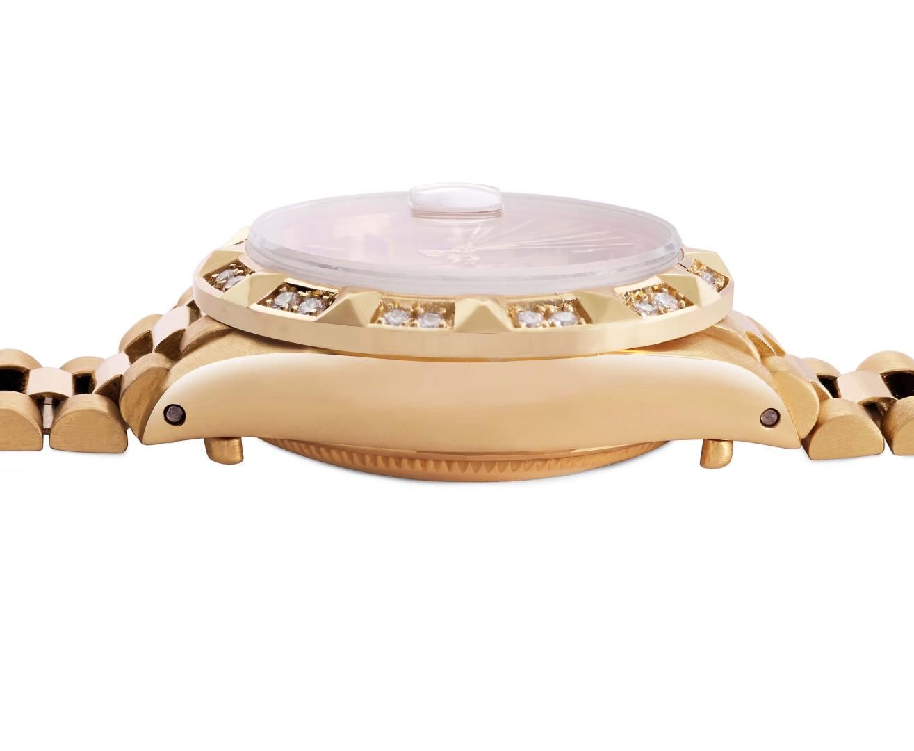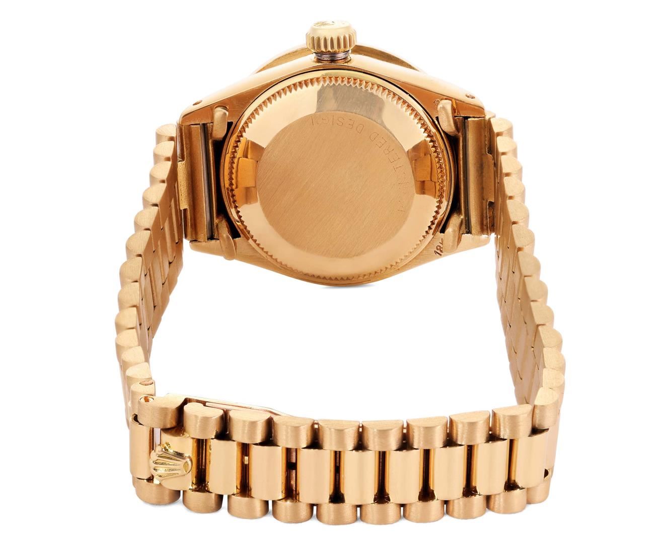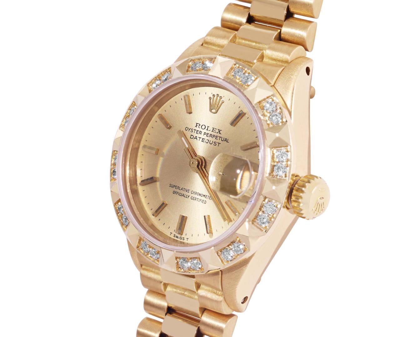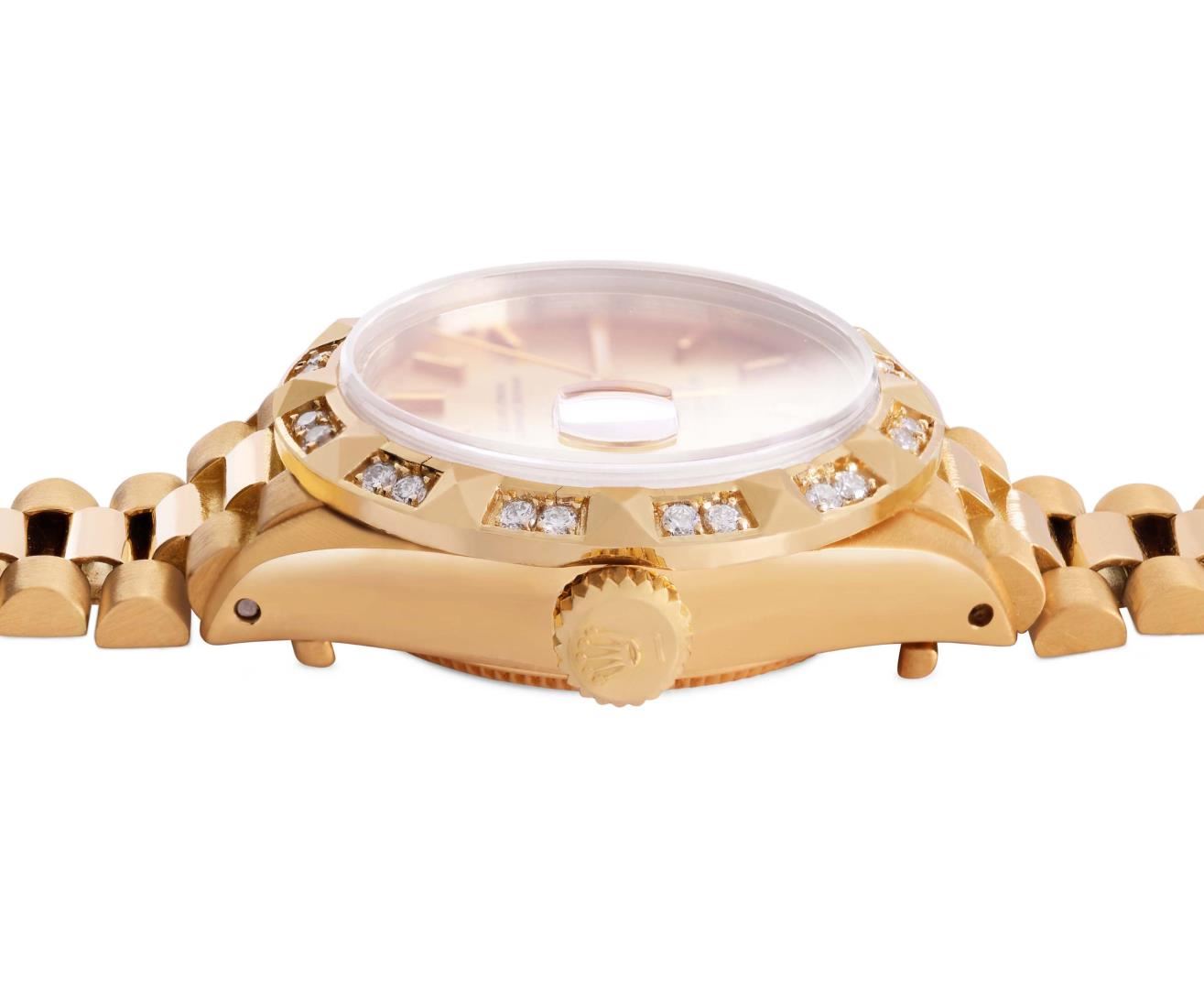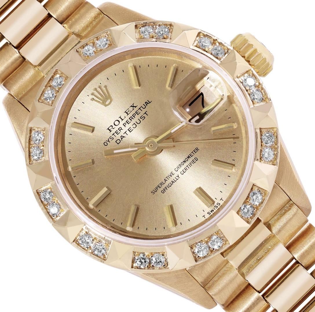 One Ladies Pre Owned Quickset Rolex 18K Yellow Gold President Polished, Serviced & Electronically Tested, Rolex 18K Yellow Gold Case: 26mm, Rolex 18K Yellow Gold Crown, Custom Bezel: New Pyramid Diamond Bezel, Diamond Count: 24 Diamonds On Bezel. Custom Crystal: New Sapphire With Cyclops Lens. Custom Hands: New Luminescent Hands. Rolex Movement: Rolex Automatic Movement Self Winding 2135. Rolex Dial: Factory Rolex Champagne Index Dial. Model: Quickset Datejust. Condition: G-6 Extra Fine, Rolex Bracelet: 18K Yellow Gold President Band, Bright & Satin Polish. 6.0 Inch Length, President Hidden Clasp, With Rolex Logo. This Watch Has Been Serviced Time Tested And Is In Excellent Condition It Is Free Of All Scratches And Dents. This Watch Comes With A Rolex Box.