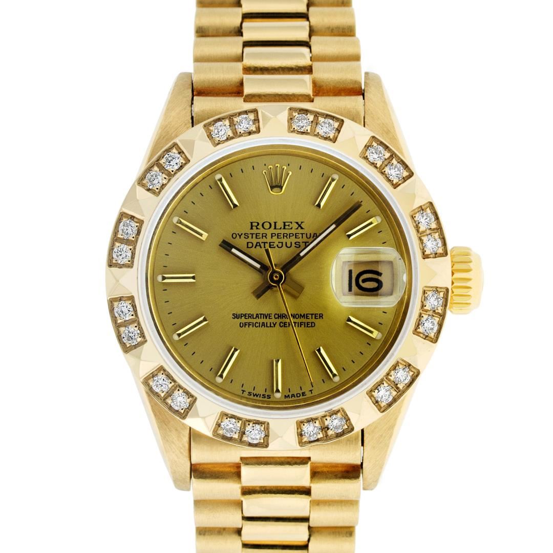 One Ladies Pre Owned 18K Yellow Gold Rolex President Polished, Serviced & Electronically Tested, Rolex Yellow Gold Case: 26mm, Rolex 18K Yellow Gold Crown, Custom Bezel: New 18K Yellow Gold Pyramid Bezel With Genuine Diamonds, Diamond Count: 24 Diamonds In Bezel. Total Weight .50 Carat, Clarity: SI-VS, Color: G to H. Custom Crystal: New Sapphire With Magnified Date Window. Custom Hands: New Luminescent Hands. Rolex Movement: Automatic Winding Movement. Rolex Dial: Champagne Index With Dash Track & Lumi Dots. Date Window: 3 O'Clock Position, Model: President, Condition: G-6 Extra Fine. Rolex Bracelet: 18K Yellow Gold President With Hidden Clasp, Bright & Satin Polish. 6.0 Inch Length, Standard President Clasp (Hidden Clasp), With Rolex Logo. This Watch Has Been Serviced Time Tested And Is In Excellent Condition It Is Free Of All Scratches And Dents.