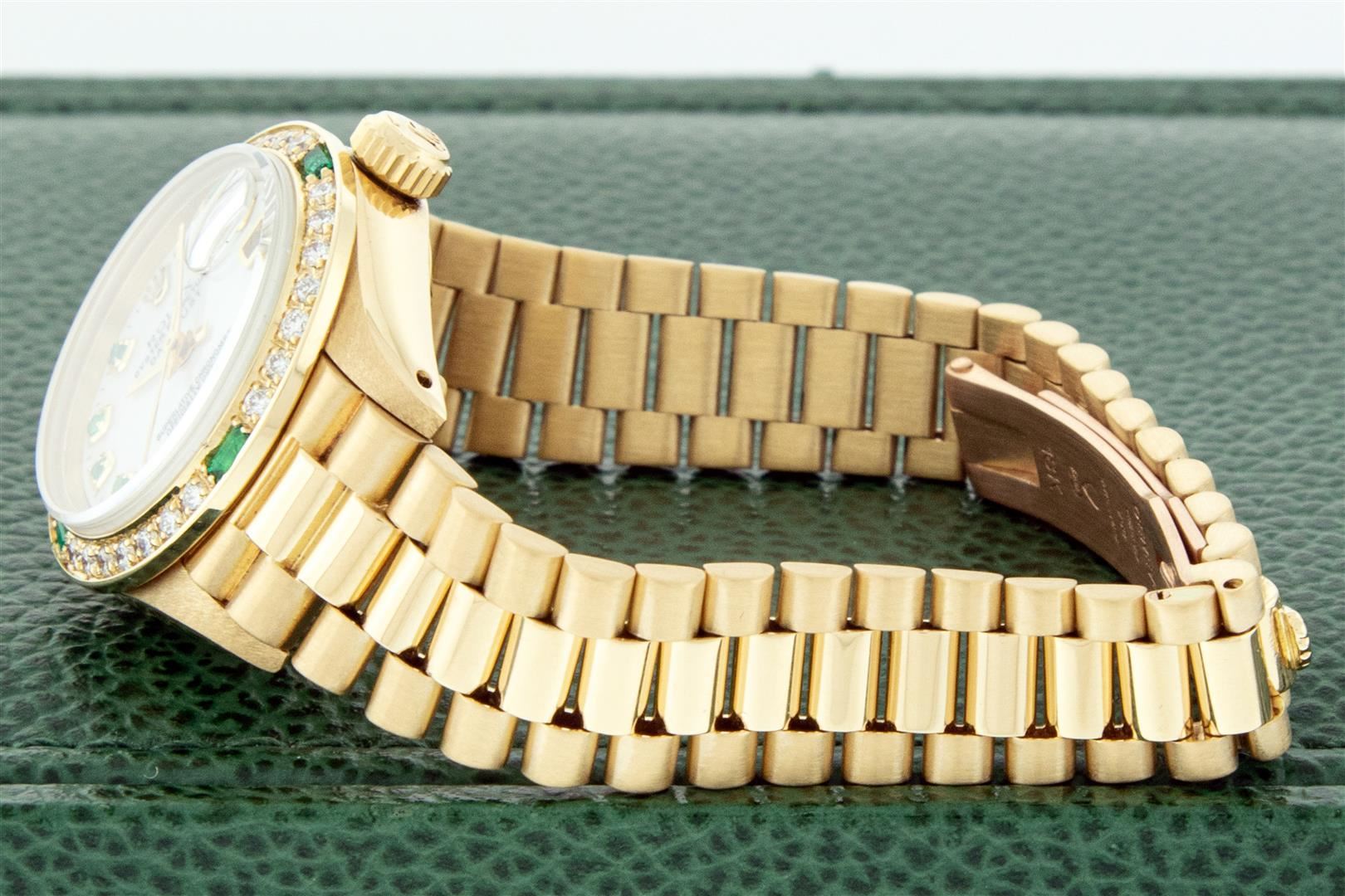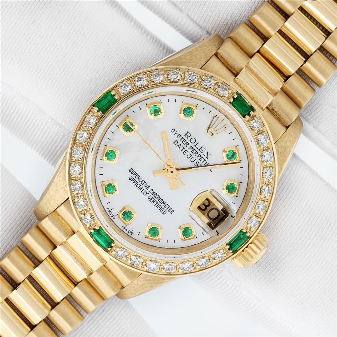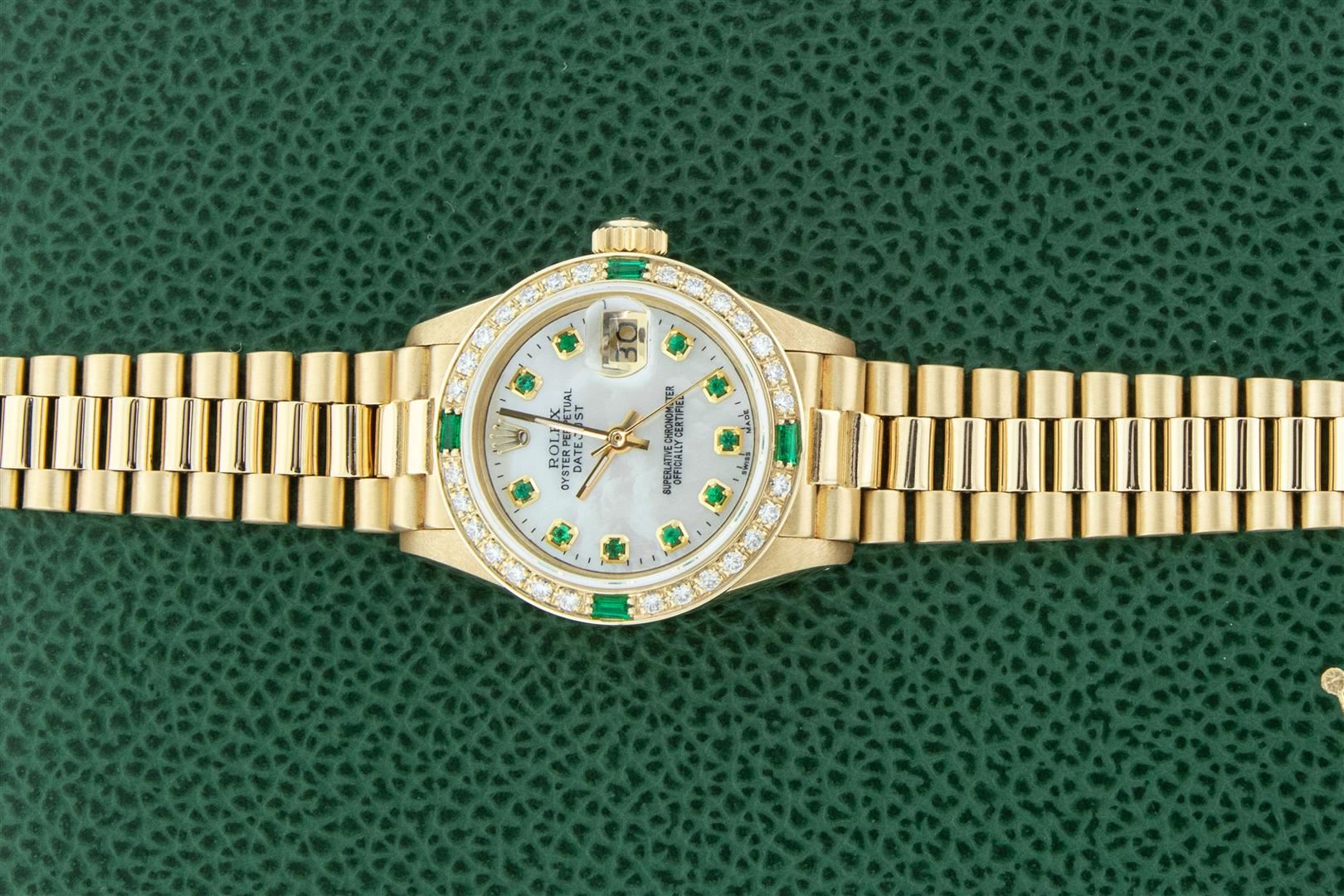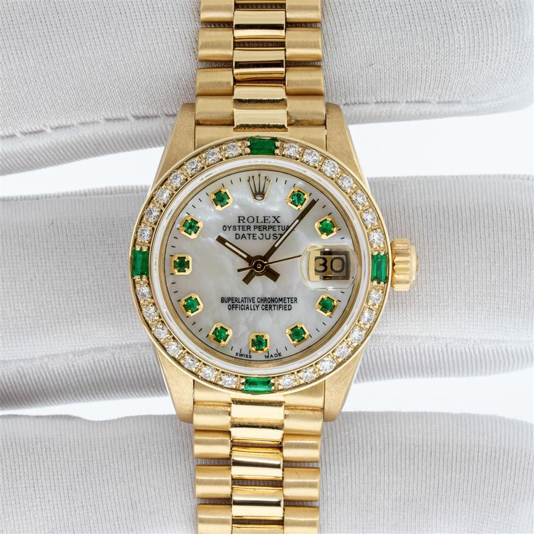 One Ladies 18K Yellow Gold Rolex President Polished, Serviced & Electronically Tested, Yellow Gold Case: 26mm, 18K Yellow Gold Crown, Custom Bezel: New 18K Yellow Gold Emerald Beadset Diamond Bezel, Diamond + Stone Count: 28 Diamonds + 4 Emeralds. Custom Crystal: New Sapphire with Date Window. Custom Hands: New Luminescent Hands. Rolex Movement: Automatic Winding Movement. Custom Dial: Refinished Mother Of Pearl with Emerald Hour Markers, Stone Count: 10 Emeralds In Dial. Date Window: 3 O'Clock Position, Model: President, Condition: G-6 Extra Fine. Rolex Bracelet: 18K Yellow Gold President with Hidden Clasp, Bright & Satin Polish. 6.0 Inch Length, Standard President Clasp (Hidden Clasp), with Rolex Logo. This Pre Owned Watch Has Been Serviced And Polished It Is Free Of All Scratches And Dents. This Watch Comes with A Rolex Box.