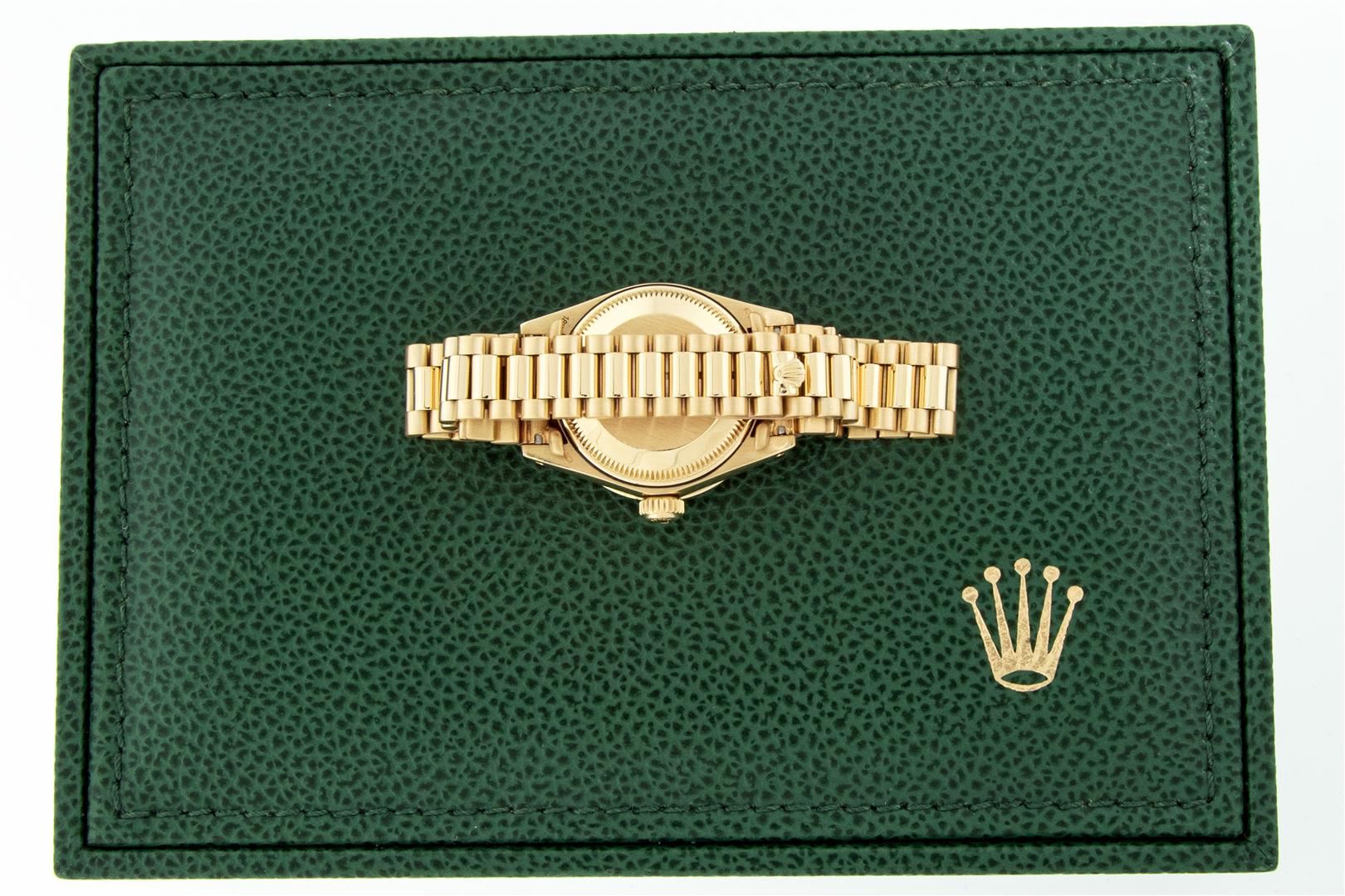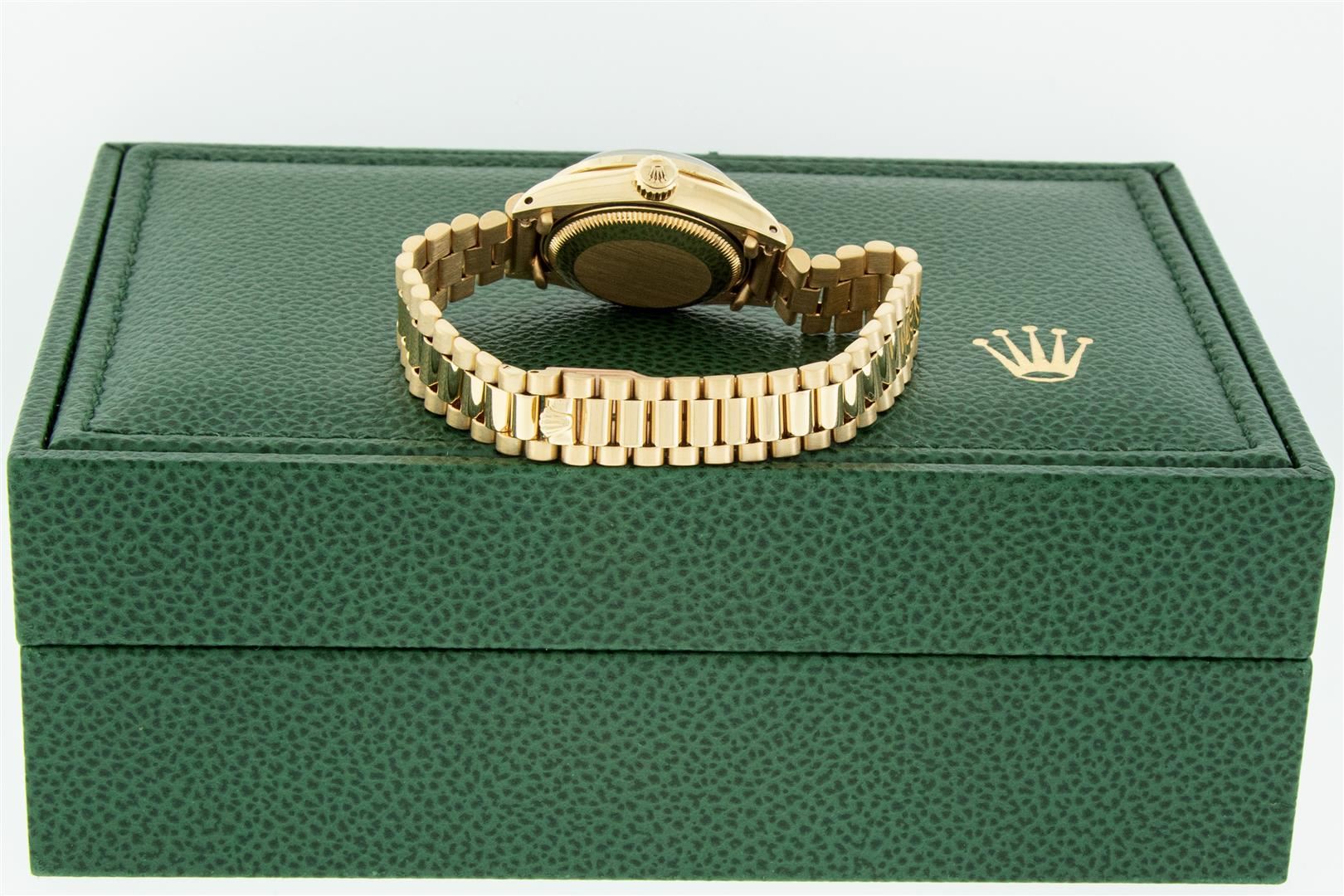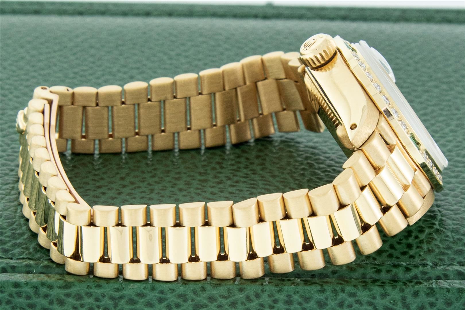 One Ladies 18K Yellow Gold Rolex President Polished, Serviced & Electronically Tested, Yellow Gold Case: 26mm, 18K Yellow Gold Crown, Custom Bezel: New 18K Yellow Gold Emerald Beadset Diamond Bezel, Diamond + Stone Count: 28 Diamonds + 4 Emeralds. Custom Crystal: New Sapphire with Date Window. Custom Hands: New Luminescent Hands. Rolex Movement: Automatic Winding Movement. Custom Dial: Refinished Mother Of Pearl with Emerald Hour Markers, Stone Count: 10 Emeralds In Dial. Date Window: 3 O'Clock Position, Model: President, Condition: G-6 Extra Fine. Rolex Bracelet: 18K Yellow Gold President with Hidden Clasp, Bright & Satin Polish. 6.0 Inch Length, Standard President Clasp (Hidden Clasp), with Rolex Logo. This Pre Owned Watch Has Been Serviced And Polished It Is Free Of All Scratches And Dents. This Watch Comes with A Rolex Box.