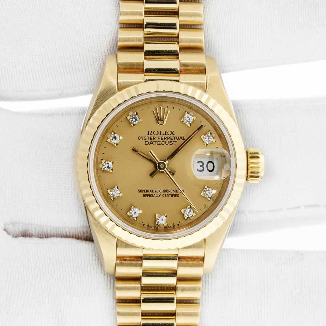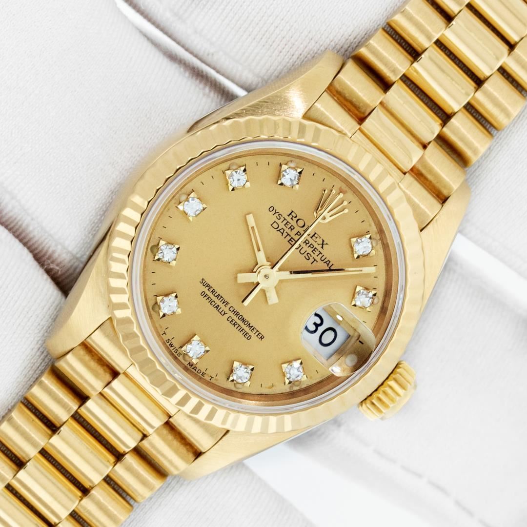 One Ladies Pre Owned Quickset Rolex 18K Yellow Gold President Polished, Serviced & Electronically Tested, Rolex 18K Yellow Gold Case: 26mm, Rolex 18K Yellow Gold Crown, Rolex Bezel: 18K Rolex Yellow Gold Fluted Bezel, Crystal: Sapphire With Cyclops Lens. Hands: Luminescent Hands. Rolex Movement: Automatic Winding Quickset Movement. Rolex Dial: Factory Rolex Champagne Diamond Dial, Diamond Count: 10 Diamonds In Dial, Clarity: VVS. Date Window: 3 O'Clock Position, Model: Datejust. Condition: G-6 Extra Fine, Rolex Bracelet: 18K Yellow Gold President Band, Bright & Satin Polish. 6.0 Inch Length, Standard President Clasp (Hidden Clasp), With Rolex Logo. This Watch Has Been Serviced Time Tested And Is In Excellent Condition It Is Free Of All Scratches And Dents. This Watch Comes With A Rolex Box.