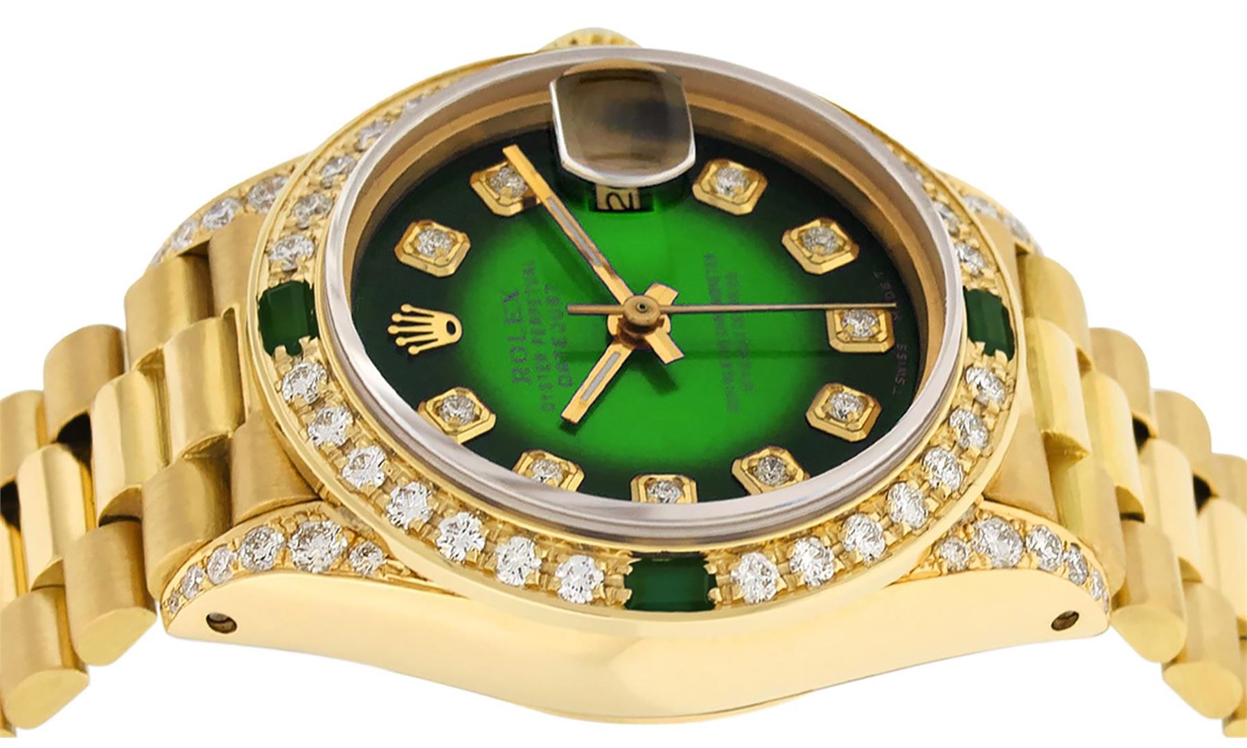 One Ladies Rolex President Polished, Serviced & Electronically Tested, 18K Yellow Gold Case With Diamond Lugs: 26mm G to H In Color, SI1, Yellow Gold Crown, Custom Diamond Lugs: 24 Diamonds On Lugs, Clarity: SI-VS, Color: G to H, Clarity SI-VS. Custom Bezel: 18K Yellow Gold Emerald Beadset Diamond Bezel, Diamond + Gem Count: 36 Diamonds + 4 Emeralds, Total Weight .70 Carat, Clarity: SI-VS, Color: G to H. Custom Crystal: New Scratch Resistant Synthetic Sapphire Cyclops Lens. Custom Hands: New Luminescent Hands. Movement: Automatic Winding Movement Caliber 2030. Custom Dial: Refinished Green Vignette With Diamond Hour Markers, Color: G To H. Clarity: SI-VS. Date Window: 3 O'Clock Position, Model: Datejust, Condition: G-6 Extra Fine. Bracelet: 18K Yellow Gold President Band, Bright & Satin Polish. 6.0 Inch Length, Standard President Clasp (Hidden Clasp), With Rolex Logo. This Watch Comes With A Rolex Box, Watch Winder And Appraisal. This Watch Has Been Serviced Time Tested And Is In Excellent Condition It Is Free Of All Scratches And Dents.
