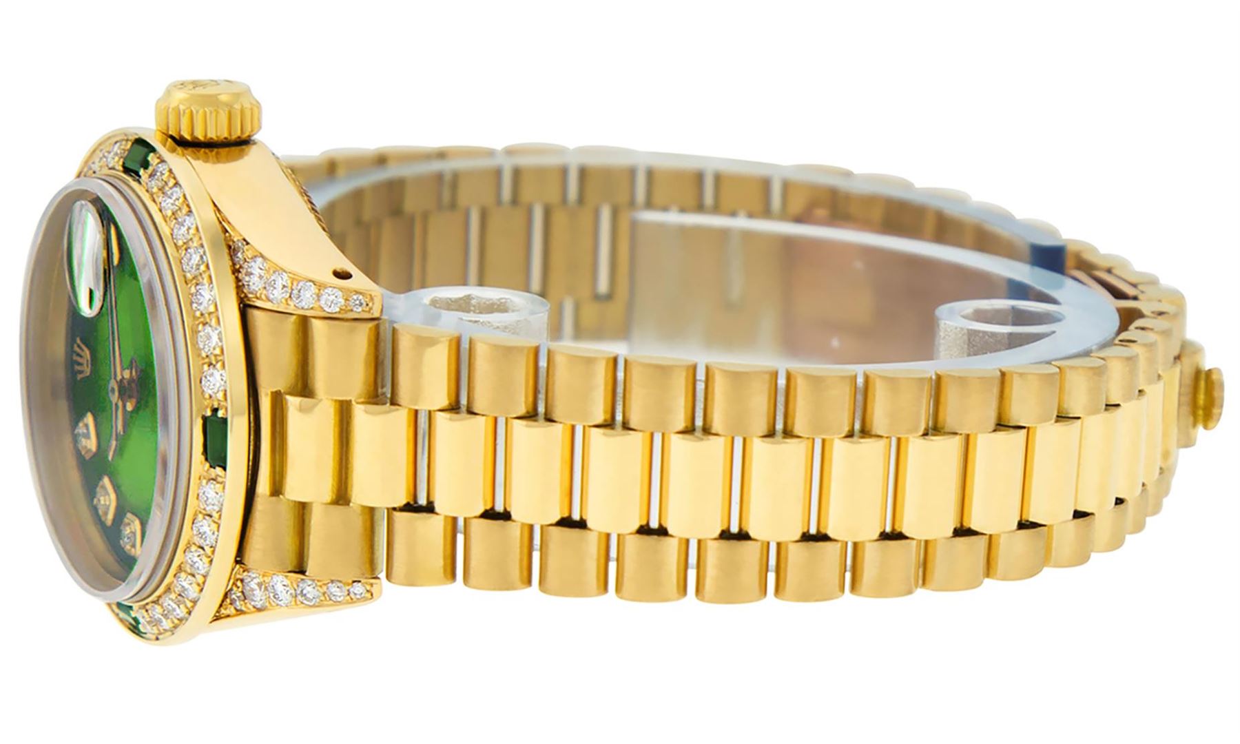 One Ladies Rolex President Polished, Serviced & Electronically Tested, 18K Yellow Gold Case With Diamond Lugs: 26mm G to H In Color, SI1, Yellow Gold Crown, Custom Diamond Lugs: 24 Diamonds On Lugs, Clarity: SI-VS, Color: G to H, Clarity SI-VS. Custom Bezel: 18K Yellow Gold Emerald Beadset Diamond Bezel, Diamond + Gem Count: 36 Diamonds + 4 Emeralds, Total Weight .70 Carat, Clarity: SI-VS, Color: G to H. Custom Crystal: New Scratch Resistant Synthetic Sapphire Cyclops Lens. Custom Hands: New Luminescent Hands. Movement: Automatic Winding Movement Caliber 2030. Custom Dial: Refinished Green Vignette With Diamond Hour Markers, Color: G To H. Clarity: SI-VS. Date Window: 3 O'Clock Position, Model: Datejust, Condition: G-6 Extra Fine. Bracelet: 18K Yellow Gold President Band, Bright & Satin Polish. 6.0 Inch Length, Standard President Clasp (Hidden Clasp), With Rolex Logo. This Watch Comes With A Rolex Box, Watch Winder And Appraisal. This Watch Has Been Serviced Time Tested And Is In Excellent Condition It Is Free Of All Scratches And Dents.